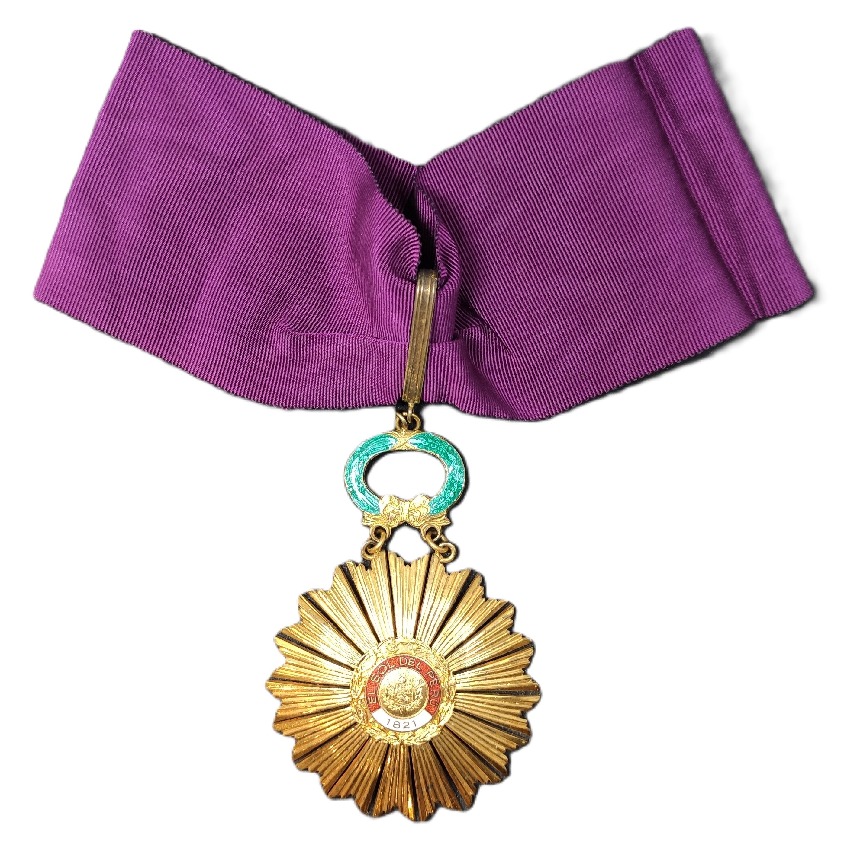 Командорский крест ордена Солнца Перу с лентой. Орден Солнца Перу (исп. Orden El Sol delPeru) — высшая государственная гражданская награда Перу. Старейший гражданский орден в Америке. Эту престижную государственную награду правительство Перу вручает как своим гражданам, таки представителям зарубежных стран, за выдающиеся достижения в таких сферах как искусство, литература, культура, политика, а также за исключительные заслуги,