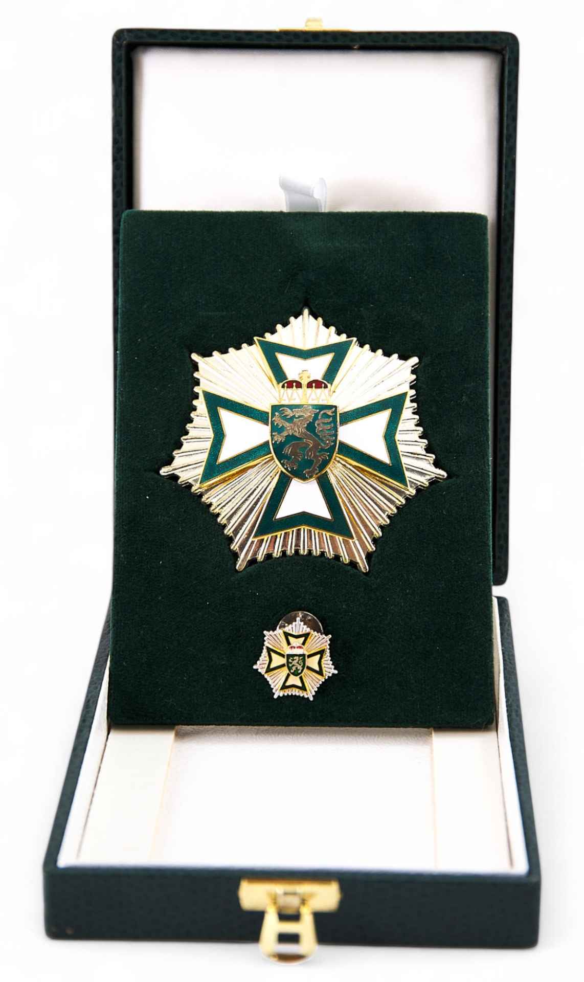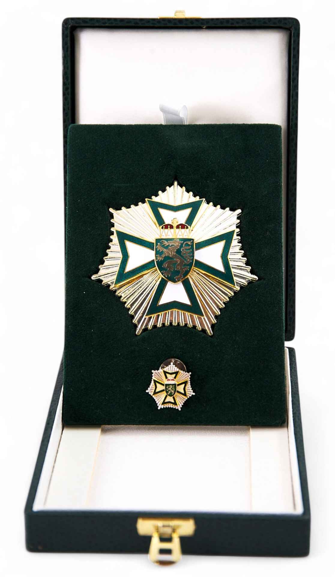 На семилучевой звезде укреплен мальтийский крест, белый внутри и зеленый по краям с укрепленным гербом Штирии в центре. Рядом с ним миниатюрный «фрачник» для ношения миниатюрного знака награды в гражданском костюме.