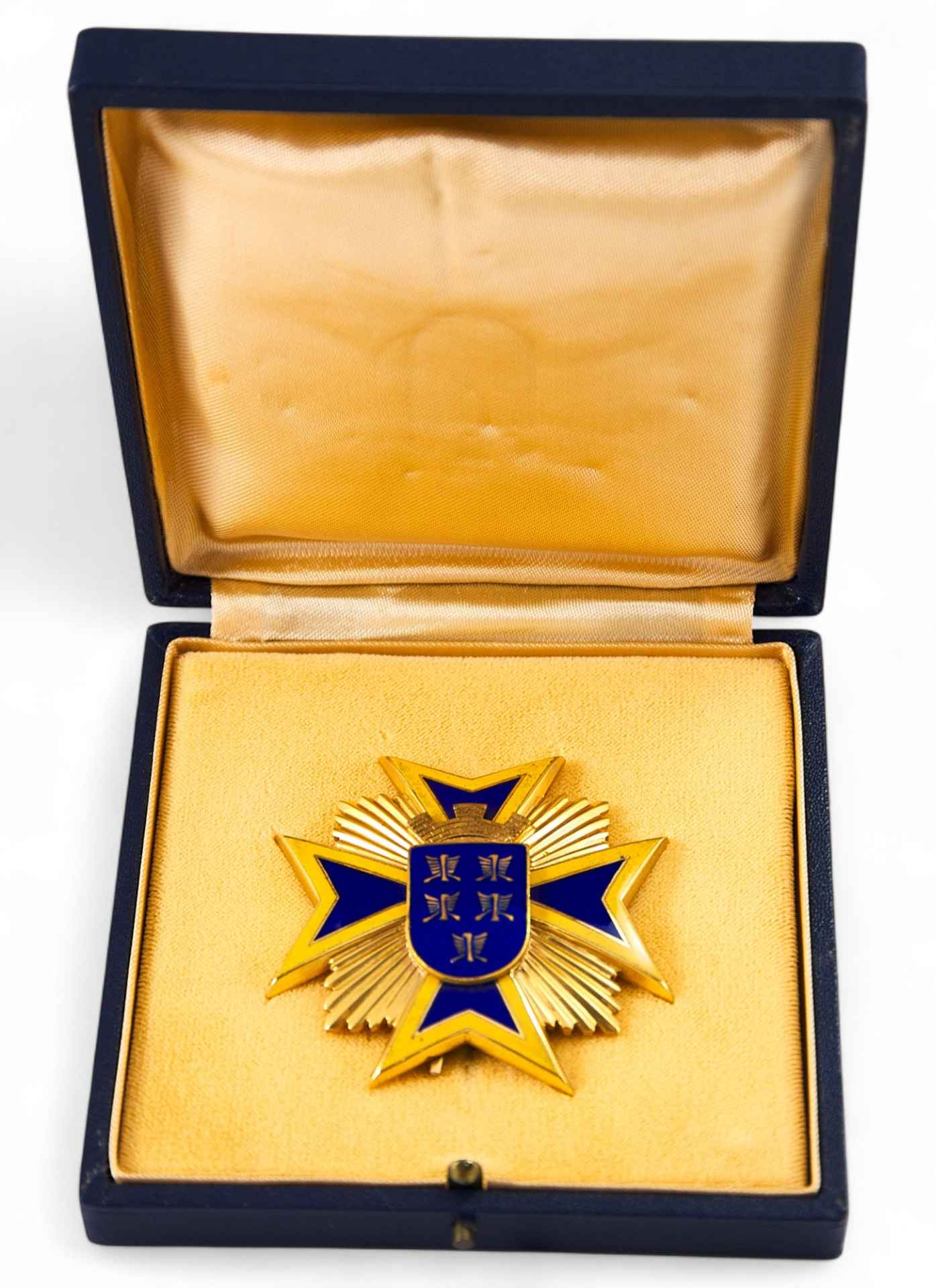 Представленный на экспертизу знак является наивысшим по иерархии степеней. На четырехлучевой звезде укреплен мальтийский крест, синий внутри и желтый по краям с укрепленным гербом Нижней Австрии в центре. Таким знаком награждают за ликвидацию последствий стихийных бедствий, за 25. 40, 50 лет добросовестной,службы в области, пожарно-спасательных служб, за достижения в спорте. Предписание правительства Нижней Австрии от 6 апреля 1976 о почетном знаке за заслуги перед федеральной землей Нижняя Австрия: