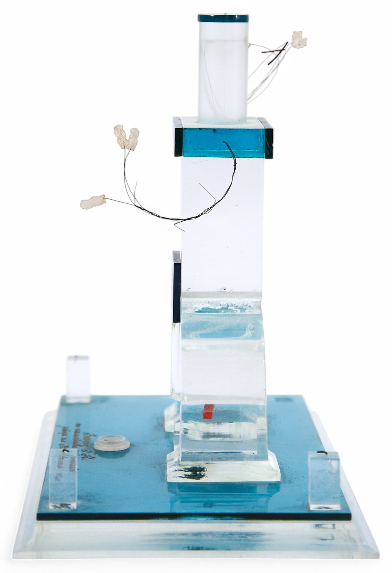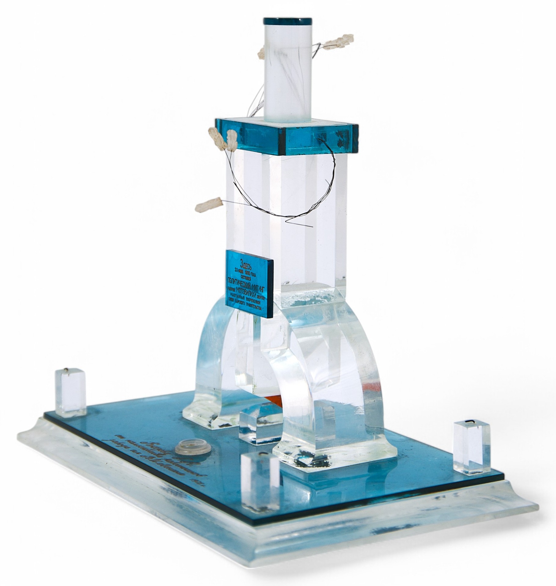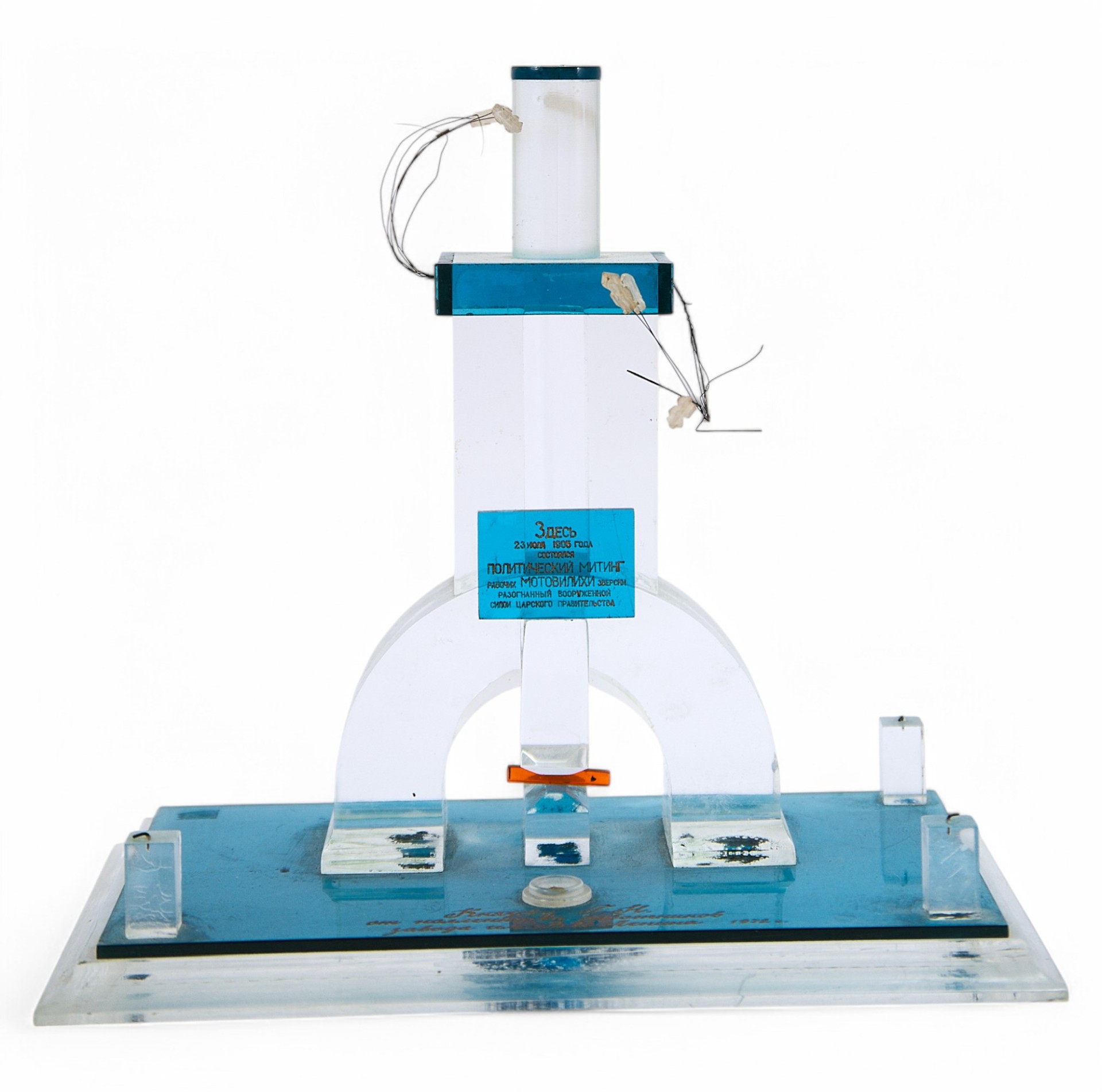 На подставке выгравирован текст: «Князеву Г.Н. от коллектива работников завода им. В.И. Ленина 1972». Стела изготовлена из прозрачного безцветного и бирюзового оргстекла и композиционно повторяет памятник Борцам революции, установленном в г. Перми. Подобные награды и призы регулярно выпускались на заводах и вручались их работникам на память о событиях и датах, связанных с историей завода. Такие наррады существенно повышали корпоративный дух рабочих и служащих предприятия.ПАМЯТНИК БОРЦАМ РЕВОЛЮЦИИ - меамориальный комплекс на Вышке в Мотовилихинском р-не Перми. В основе его символическая композиция: паровоймолот с наковальней и над ними серп с колосьями. В 1905 г. рабочие Мотовилихинского завода объявили забастовку. 10 июля они собрались здесь на митинг, чтобы выработать план дальнейшей борьбы. Сотня вооруженных казаков, посланная на Вышку губернатором, устроила расправу над рабочими, их женами и детьми. Многие были жестоко избиты нагайками, ранены, а старый рабочийЛука Борчанинов зарублен саблей. Место это стало священным для мотовилихинских рабочих. В 1917 г. Вышка снова бурлила митингами. В 1918 г. сын убитого рабочего Александр Лукич Борчанинов уводил отсюда мотовилихинских красногвардейцев - сражаться за власть Советов. В 1920 г. был объявлен конкурс на лу чший проект памятника на Вышке. Первое место занял мотовилихинский техник В. Е. Гомзиков, участник революционных событий 1905 г. Памятник сооружали рабочие заводского строительного цеха, где в то время работал Гомзиков. 7 ноября 1920 г. памятник был торжественно открыт. В верхней части монумента сделана надпись: «Слава павшим борцам!». Позднее на памятнике появились мемориальные доски, отлитые из чугуна. На первой из них написано: «Здесь 10-го (23-го) июля 1905 г. состоялся политический митинг Мотовилихи, зверски разогнанный вооружённой силой царского правительства?22 аир. 1970 г., в день 100-летия со дня рождения В. И. Ленина, здесь «Декабрьское вооруженное восстание 1905 г. в Мотовилихе».
