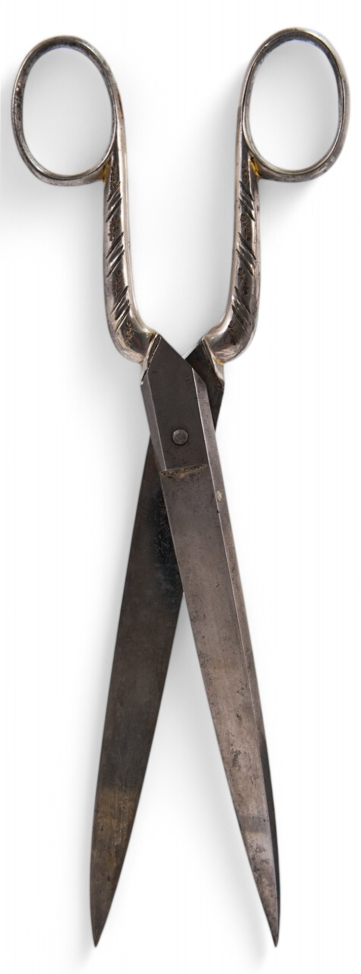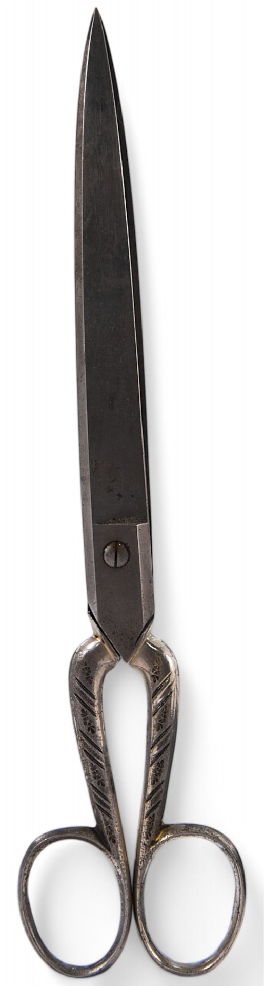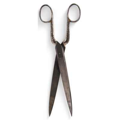 Ножницы портного. Рукояти украшены штампованным узором в виде полос и растительного орнамента. Где были изобретены первые ножницы, тут мнения специалистов расходятся. Первые утверждают, что это был Китай, вторые - что страны Средиземноморья. В любом случае где-то с IV века до н.э. ножницы встречаются уже на огромной территории - от Англии до Египта. Назначение у этих находок огромное - от скотоводства, медицины и портновского ремесла до цирюльного дела и маникюра. Ножницы изготавливали из железа, стали, серебра; много украшали; наиболее дорогие покрывали золотом.