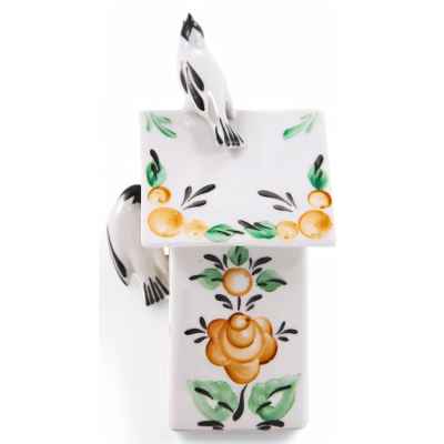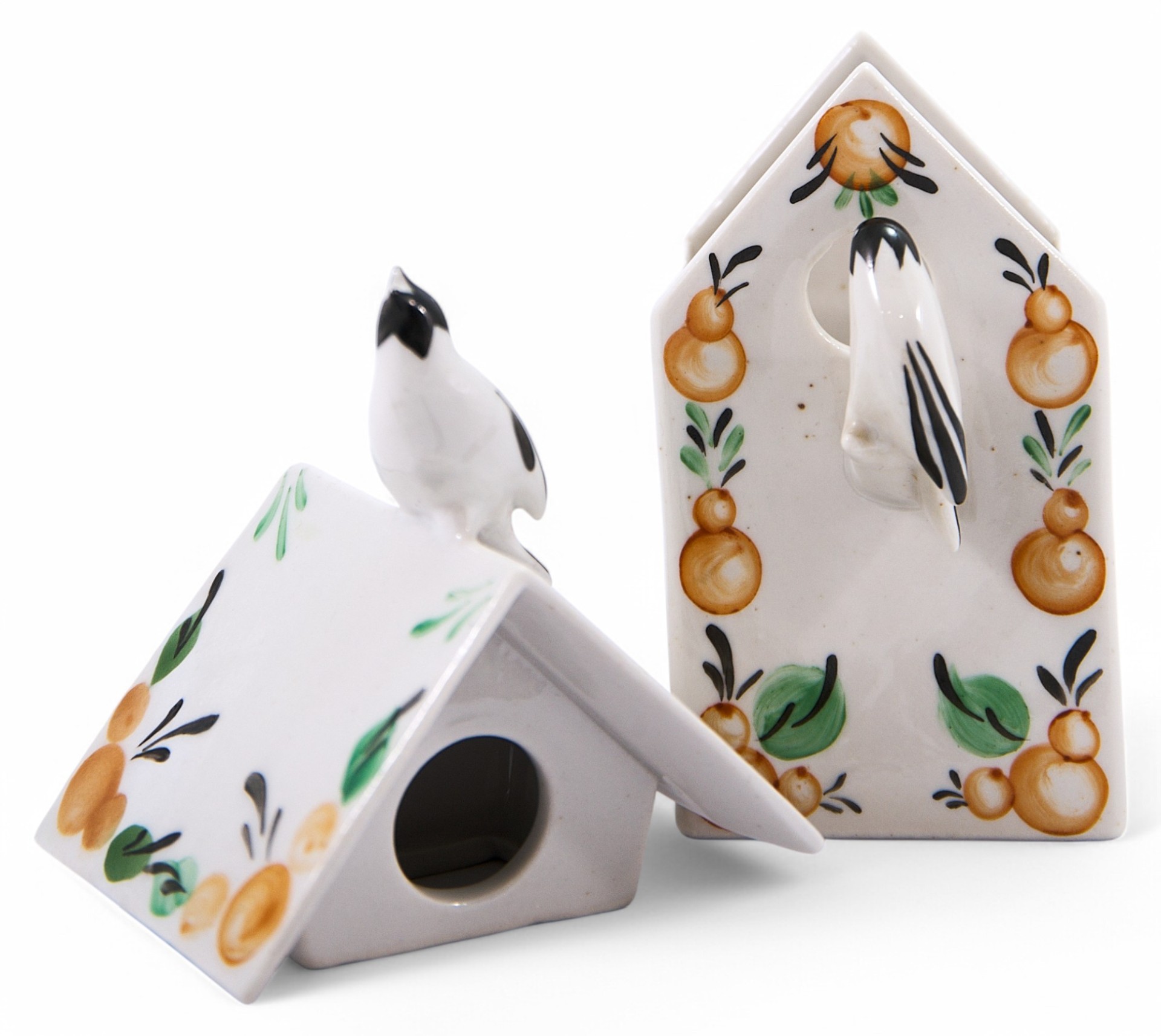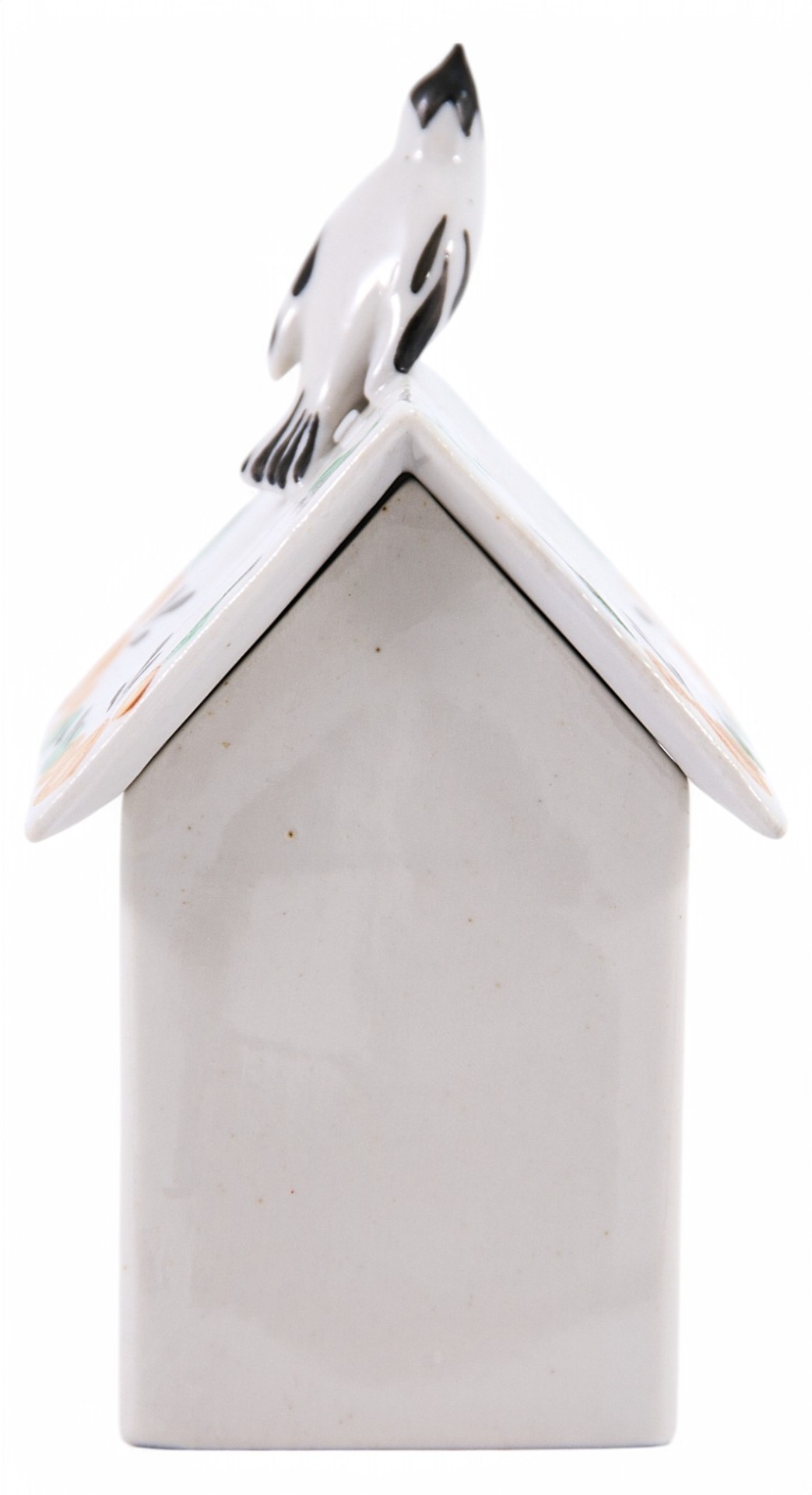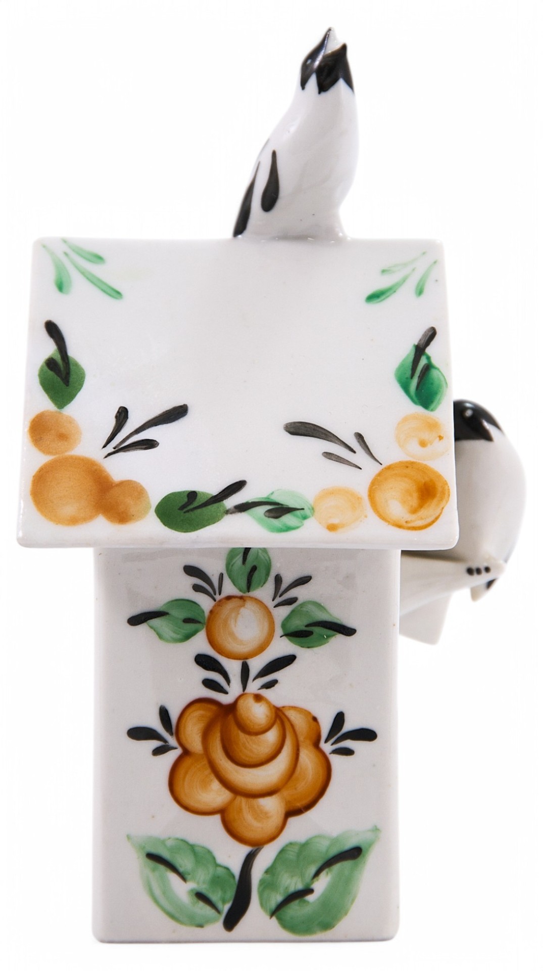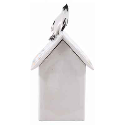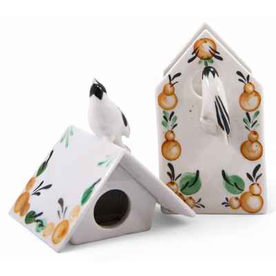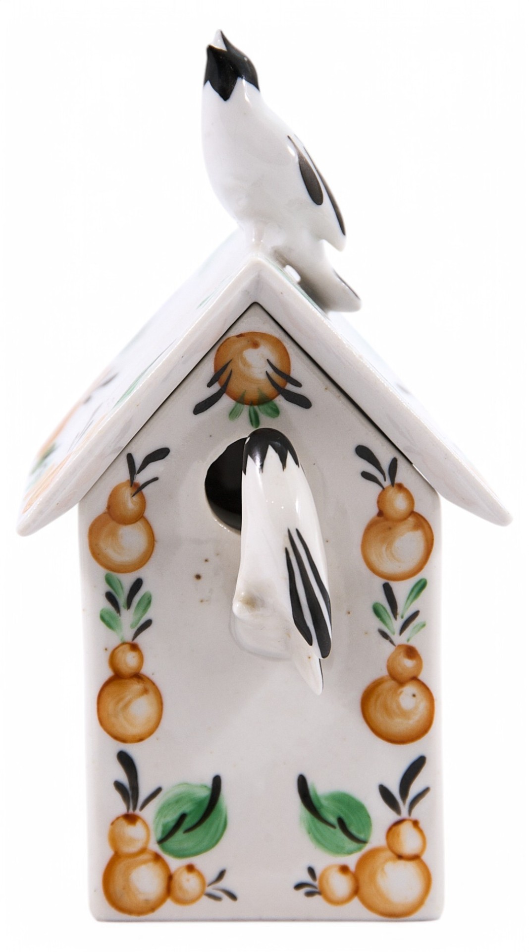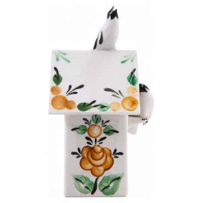Фарфоровая шкатулка в скворечника, украшенного стилизованной под народные промыслы росписью. На крышке сидит птичка, подняв голову кверху и раскрыв клювик; а на жердочке, перед круглым окошечком, - другая птичка. Обе птички
