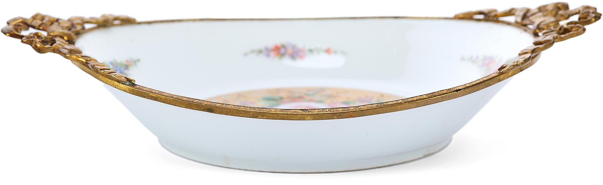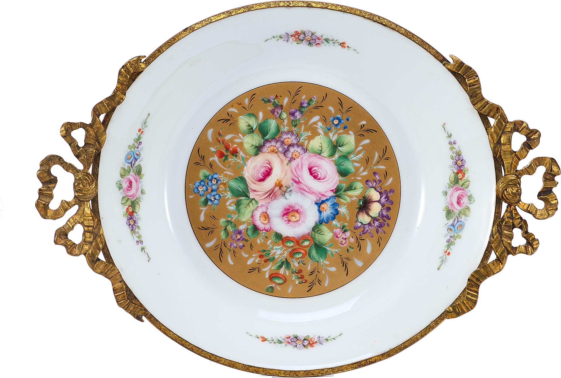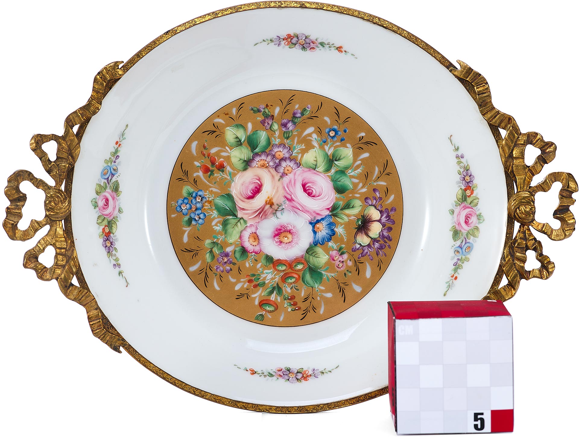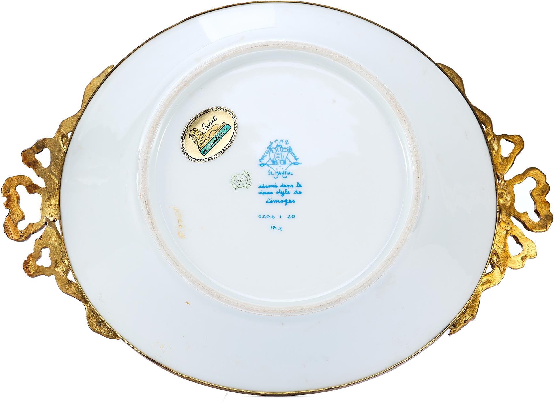 Декоративное блюдо, представленное на изображении, выполнено из лиможского фарфора — одного из самых престижных видов твердого фарфора, производимого во французском городе Лимож начиная с конца XVIII века. Данный предмет представляет собой изысканный образец декоративного искусства, совмещающий фарфор и бронзовое обрамление, выполненное в технике литья с золочением. Изделие оформлено характерными элементами неостиля (эклектики), широко распространённого во второй половине XIX — начале XX века, и ориентировано на традиции, сложившиеся под влиянием Севрской фарфоровой мануфактуры.
