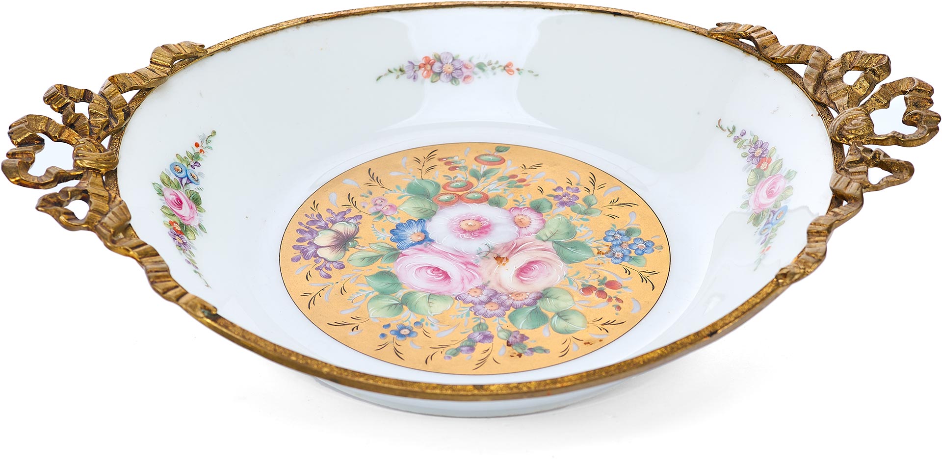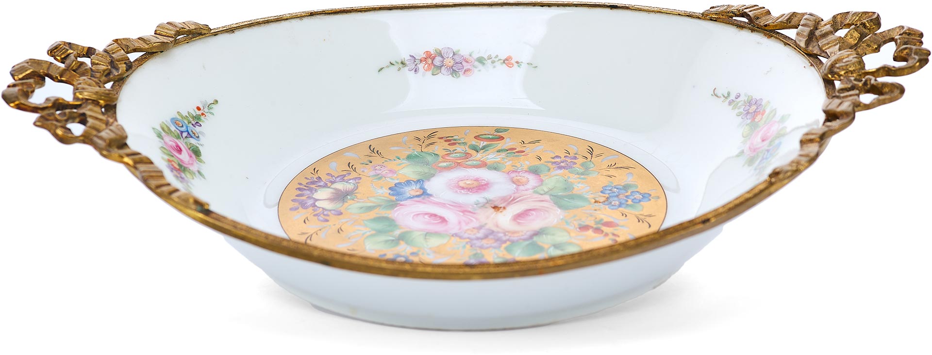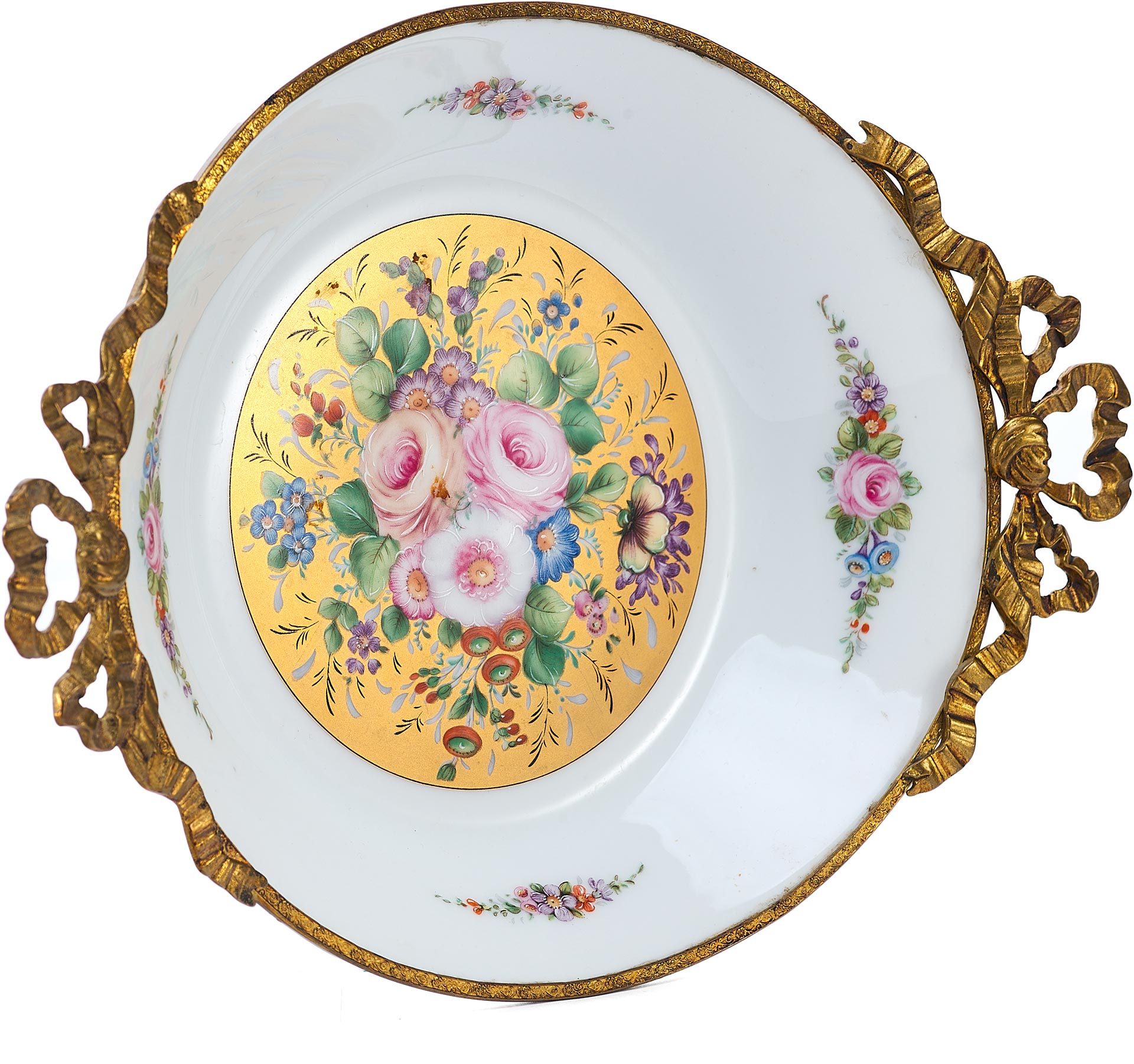Декоративное блюдо, представленное на изображении, выполнено из лиможского фарфора — одного из самых престижных видов твердого фарфора, производимого во французском городе Лимож начиная с конца XVIII века. Данный предмет представляет собой изысканный образец декоративного искусства, совмещающий фарфор и бронзовое обрамление, выполненное в технике литья с золочением. Изделие оформлено характерными элементами неостиля (эклектики), широко распространённого во второй половине XIX — начале XX века, и ориентировано на традиции, сложившиеся под влиянием Севрской фарфоровой мануфактуры.