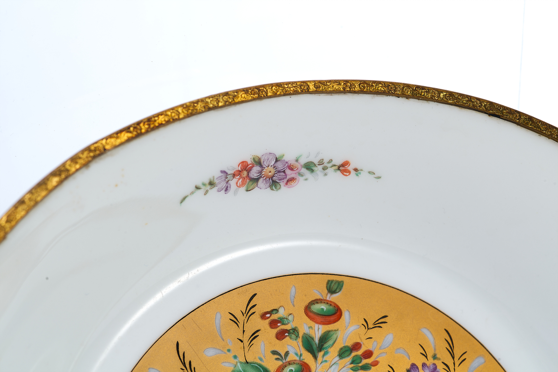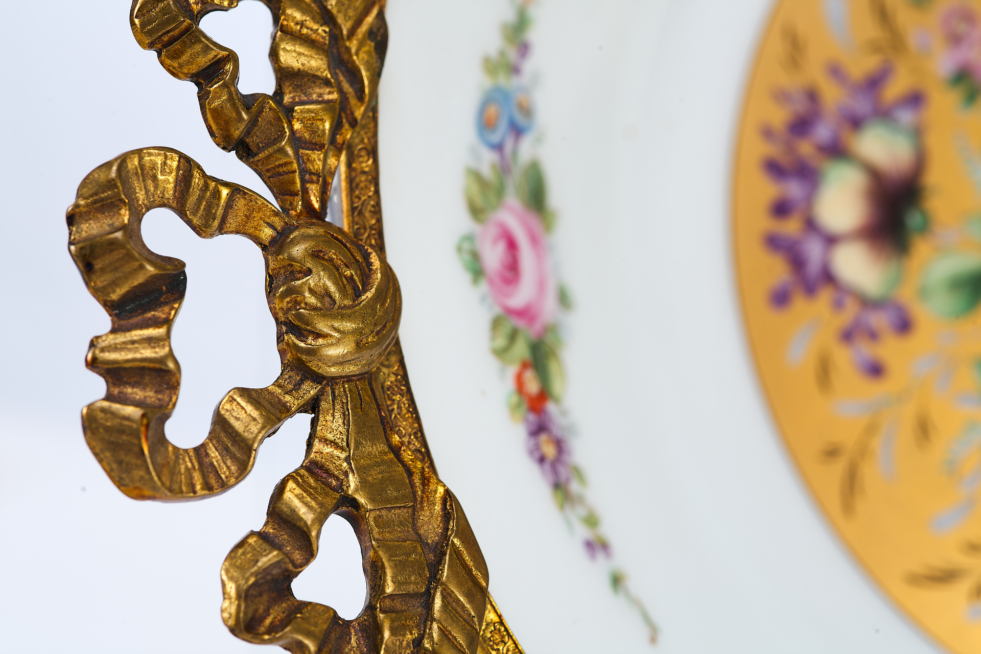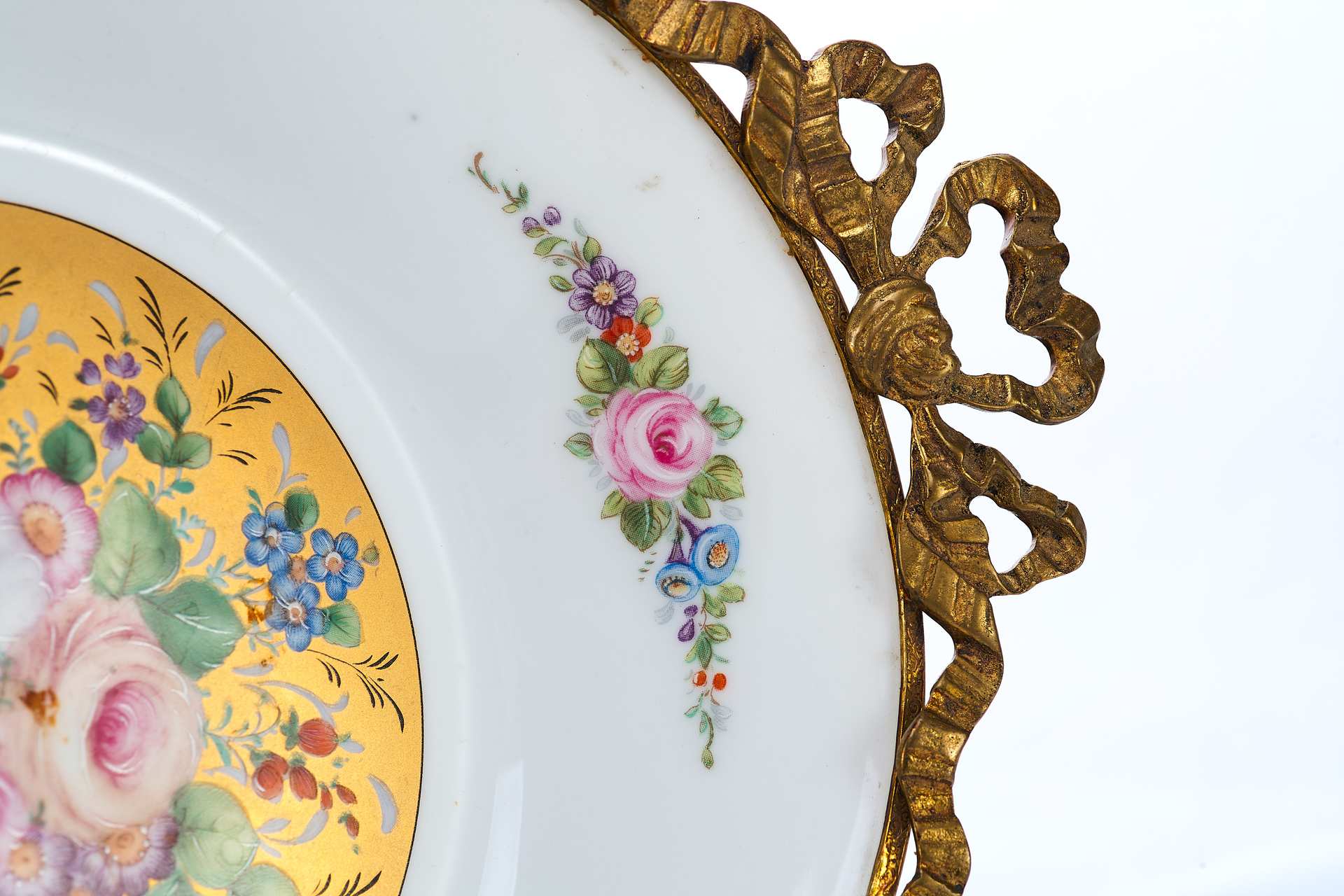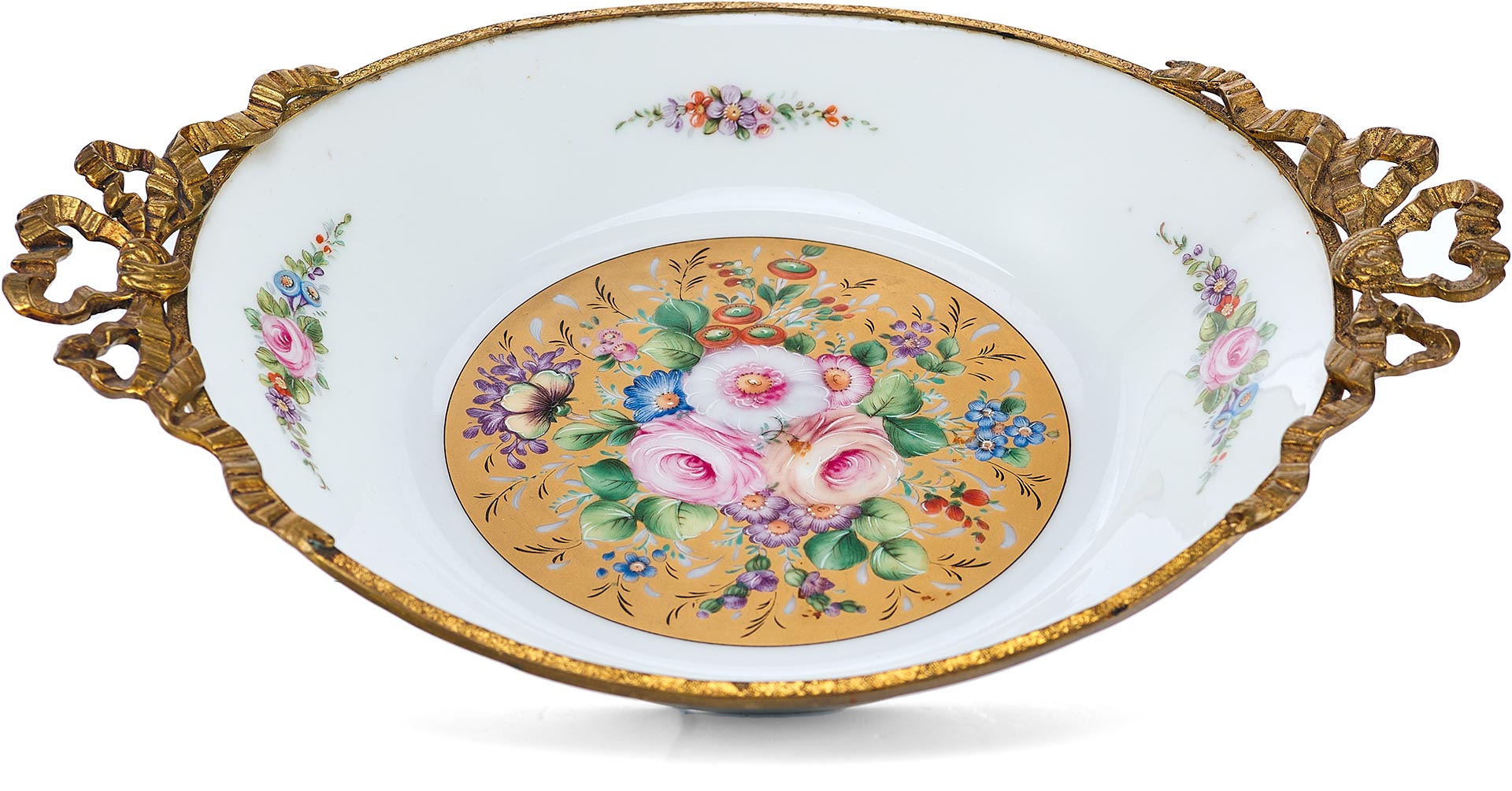 Декоративное блюдо, представленное на изображении, выполнено из лиможского фарфора — одного из самых престижных видов твердого фарфора, производимого во французском городе Лимож начиная с конца XVIII века. Данный предмет представляет собой изысканный образец декоративного искусства, совмещающий фарфор и бронзовое обрамление, выполненное в технике литья с золочением. Изделие оформлено характерными элементами неостиля (эклектики), широко распространённого во второй половине XIX — начале XX века, и ориентировано на традиции, сложившиеся под влиянием Севрской фарфоровой мануфактуры.