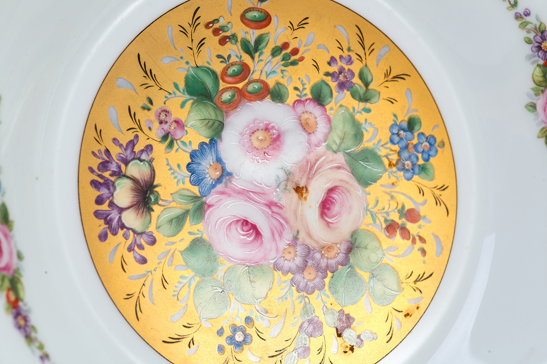Центральное место занимает композиция из многоцветных цветов, искусно прорисованных на фоне охристого медальона. Такое оформление уходит корнями в стилистику старинных французских «цветочных букетов» и напоминает декоративные решения фарфора времён боз-ар. По краю блюдо обрамлено узором из тончайших цветов, дополненных бронзовыми ручками в виде струящихся перевязей. Этот мотив ручек — отсылка к лентам на фарфоре XVIII века — подчёркивает изысканность формы и указывает на влияние неорококо.
