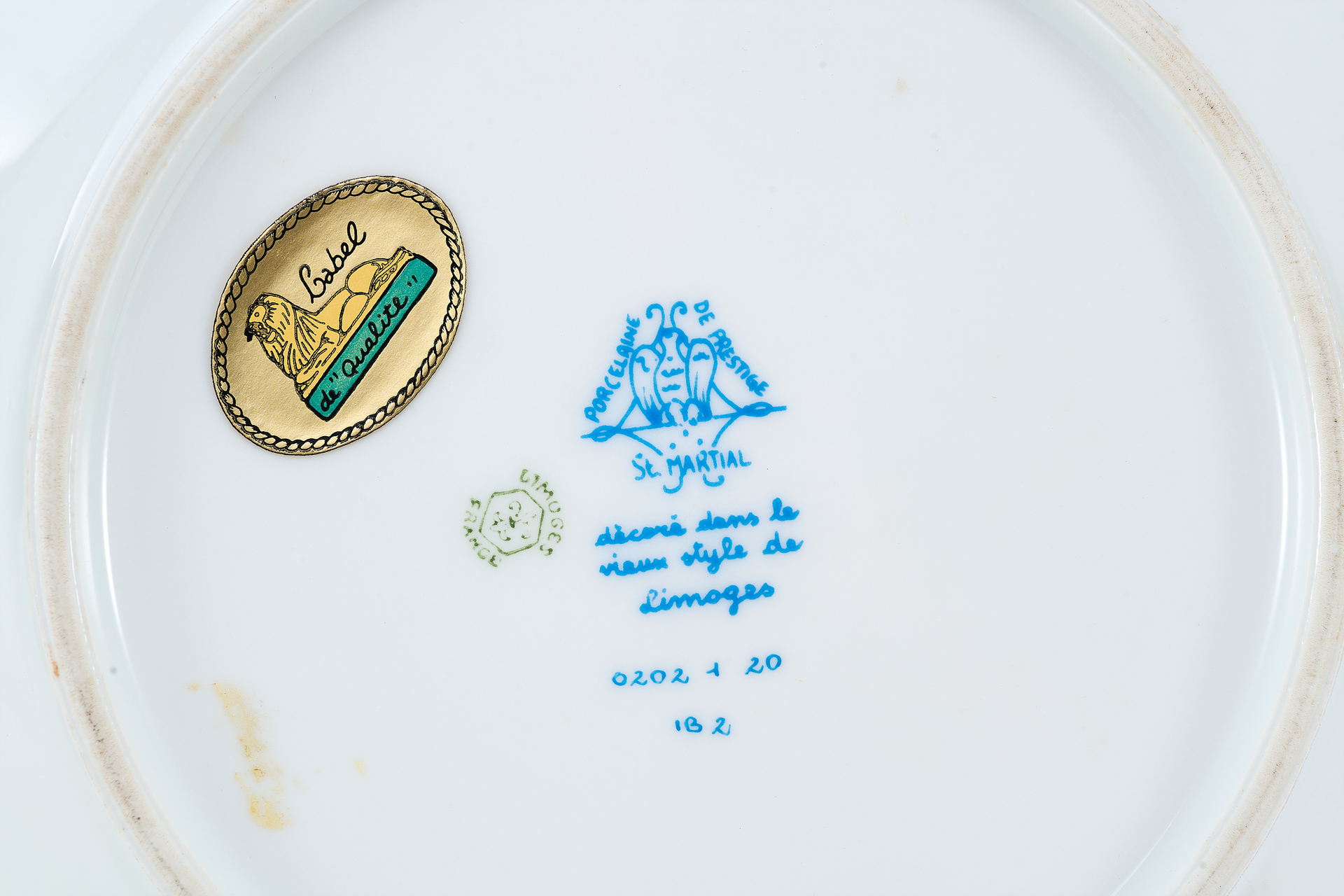 Маркировка на обратной стороне указывает на подлинность и происхождение изделия. Клеймо Limoges France в зелёной окиси хрома подтверждает производство в департаменте Верхняя Вьенна во время производства — в середине XX века. Также присутствует надпись «porcelaine de prestige St. Martial» с указанием на элитную серию, выполненную «в старом лиможском стиле», и стилизованное клеймо с сидящим орлом, отсылающее к Севру как образцу. Наличие «знака качества» с изображением льва дополняет представление о статусе предмета.