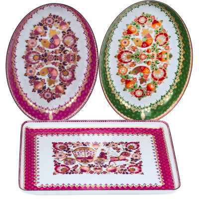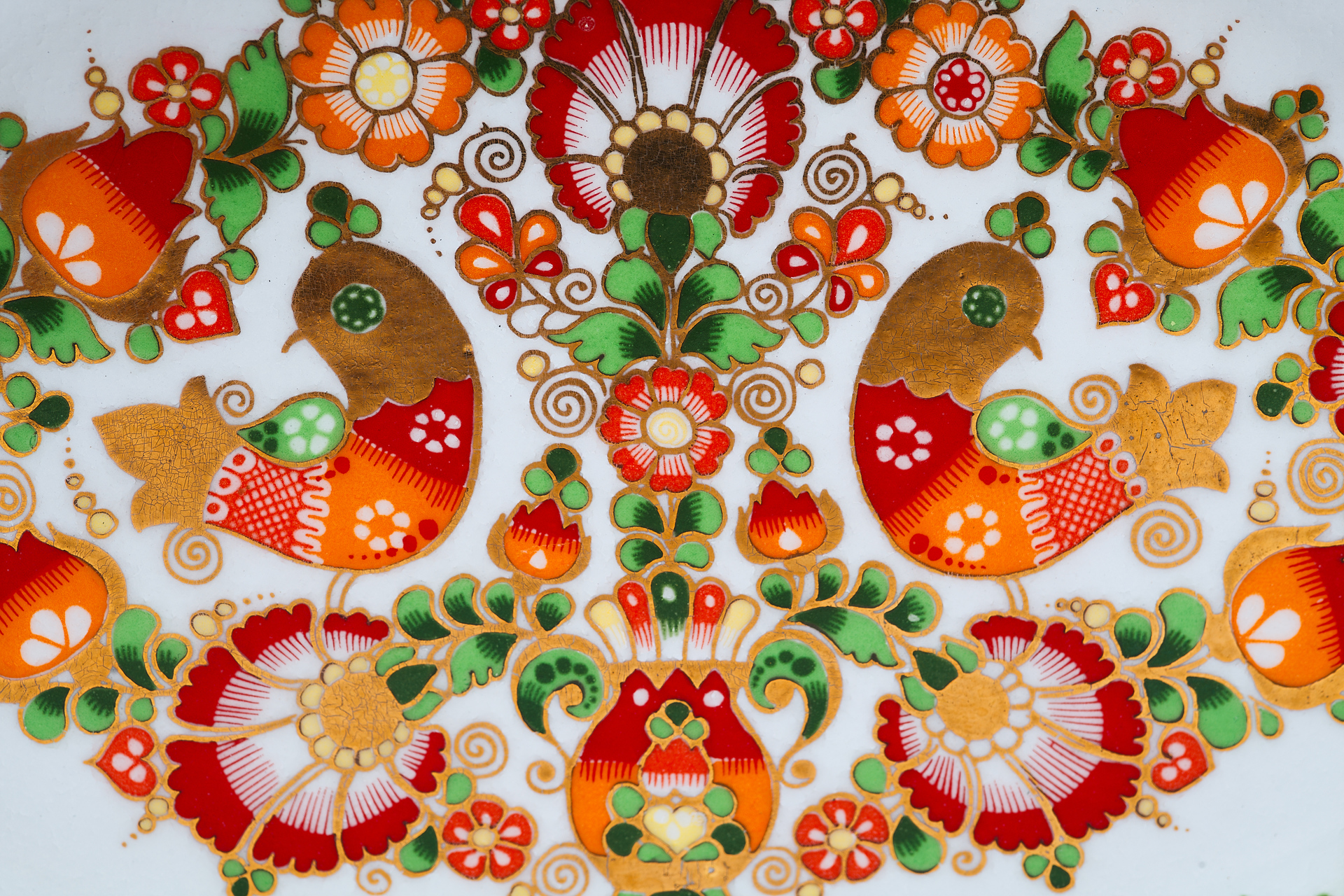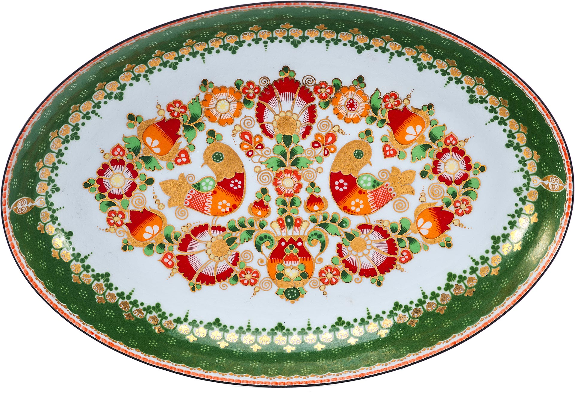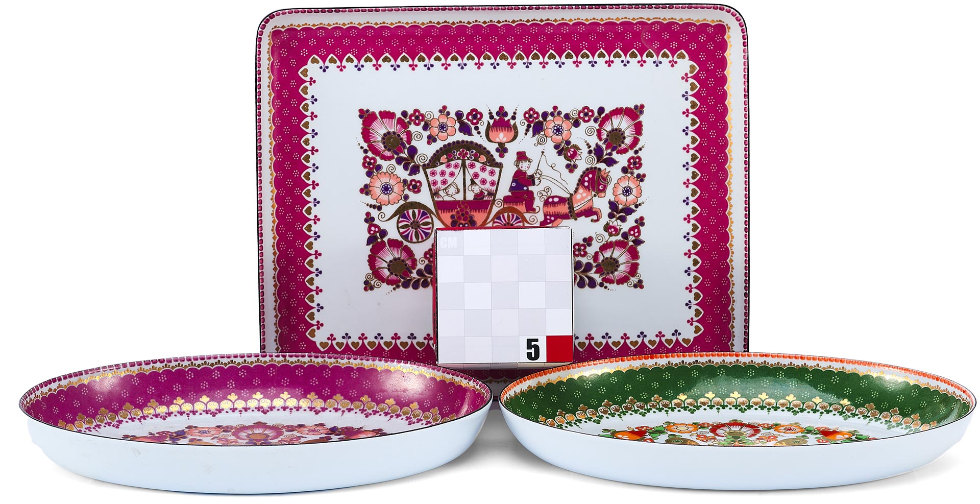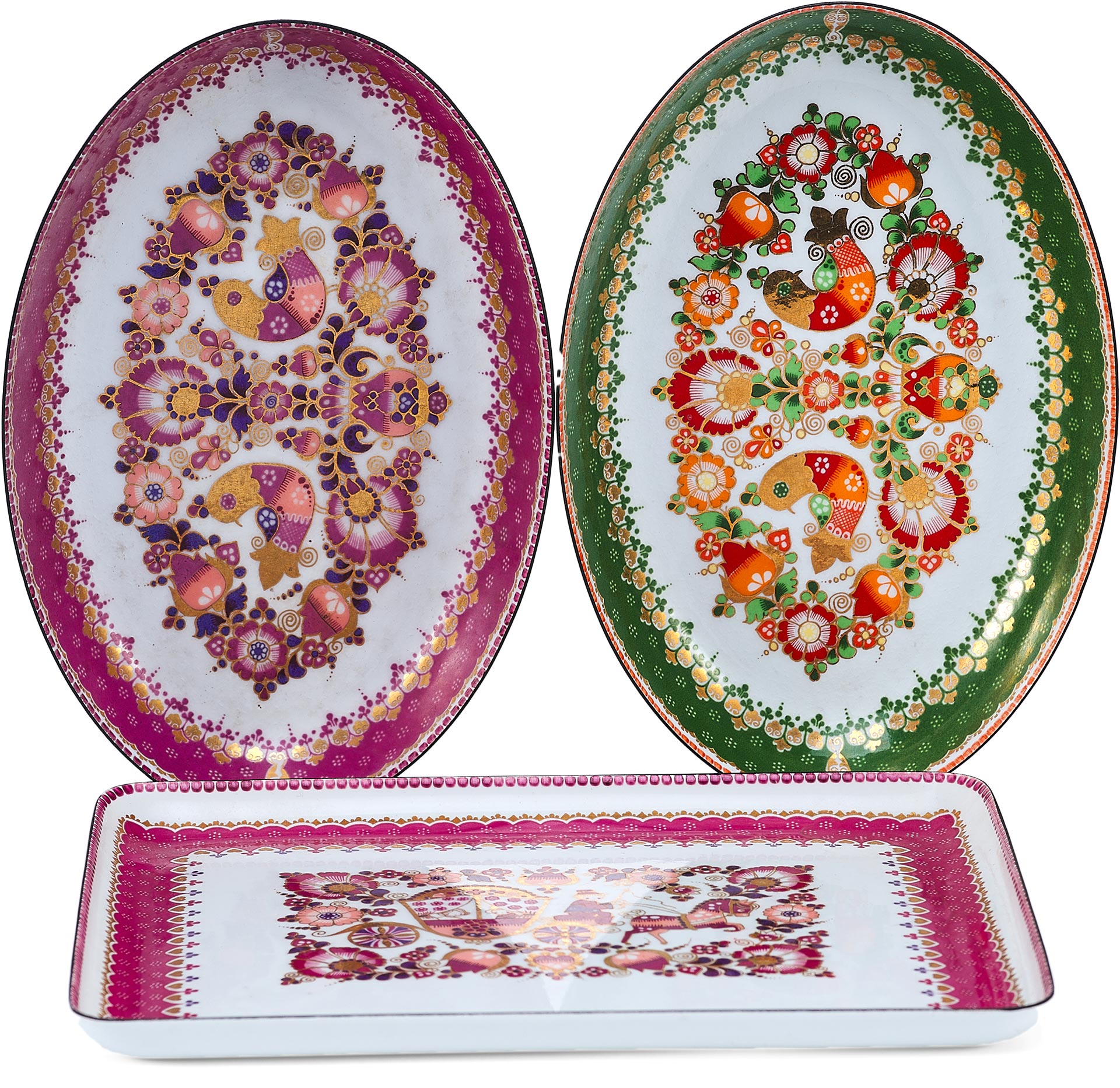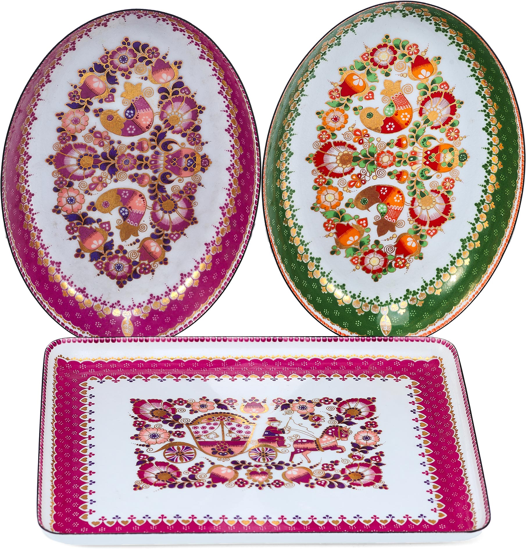 Набор из двух овальных блюд и одного прямоугольного подноса представляет собой изысканный пример декоративно-прикладного искусства 1950–1993 годов. Все предметы украшены красочной эмалевой росписью, выполненной в духе традиционного тирольского народного орнамента, характерного для региона Каринтия в Австрии. Композиции включают стилизованные цветочные мотивы, птиц и геометрические элементы, выполненные в насыщенной гамме красных, зелёных, розовых и золотистых оттенков, что подчёркивает декоративную направленность и ориентацию на фольклорный стиль.