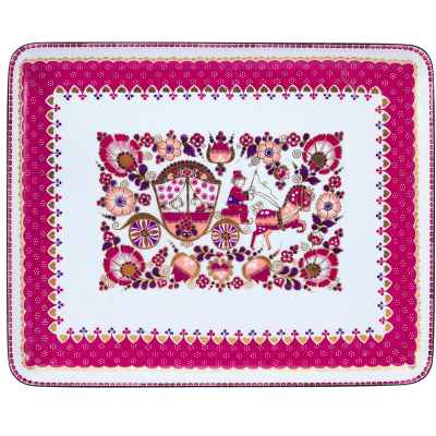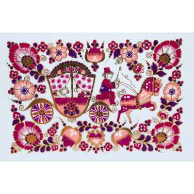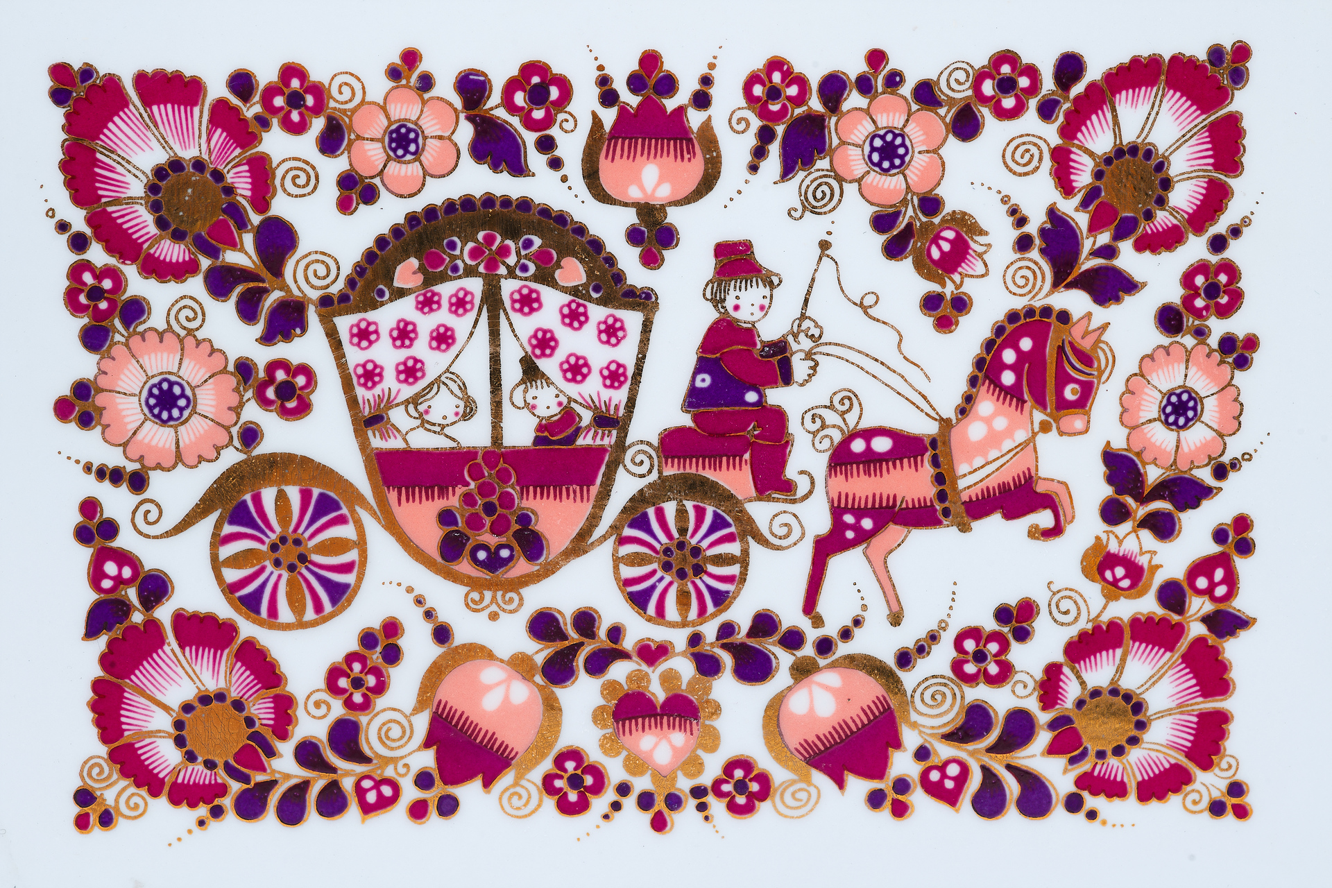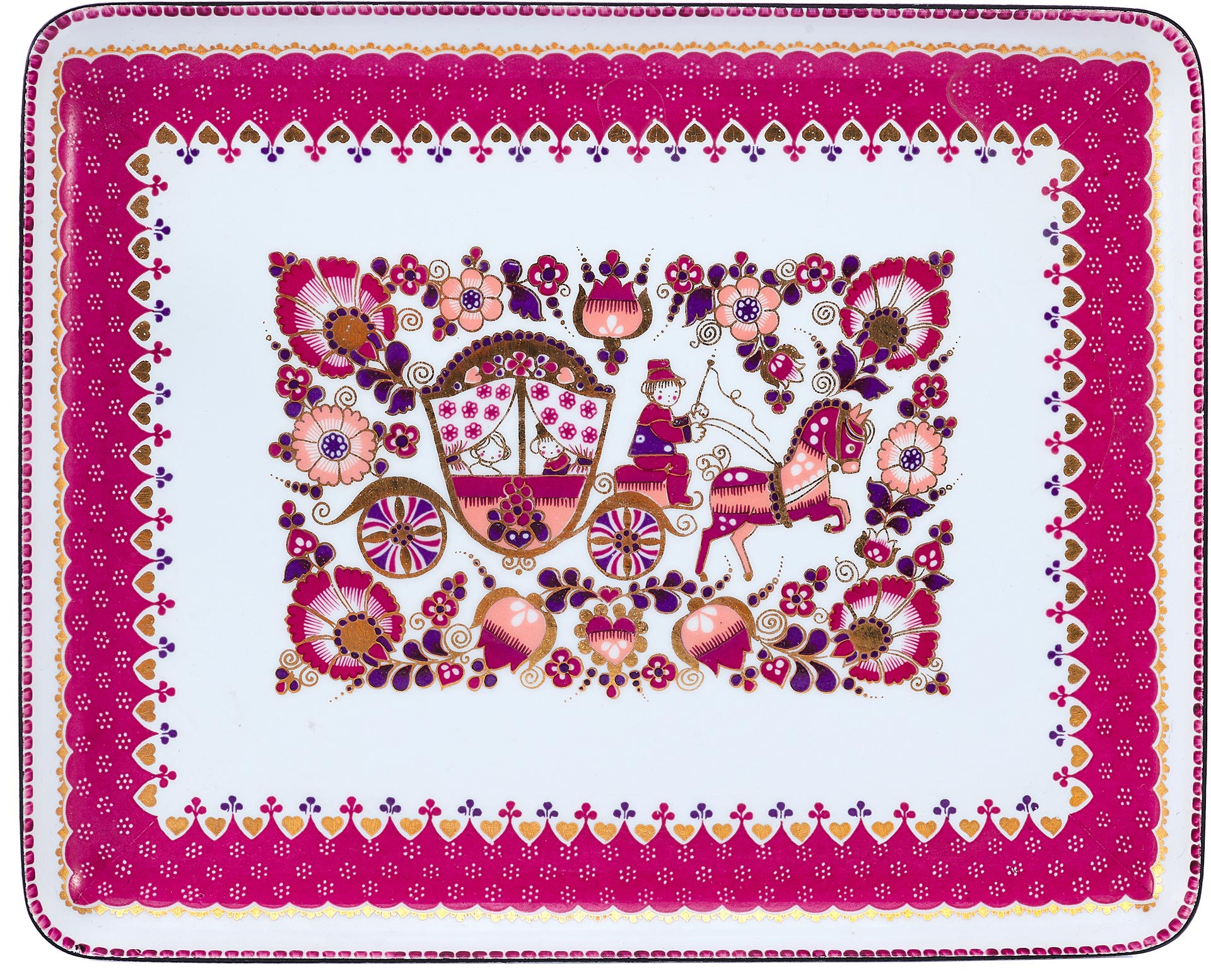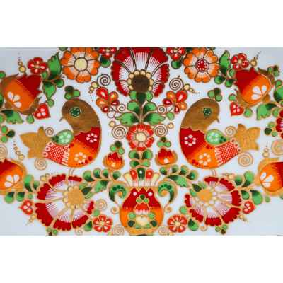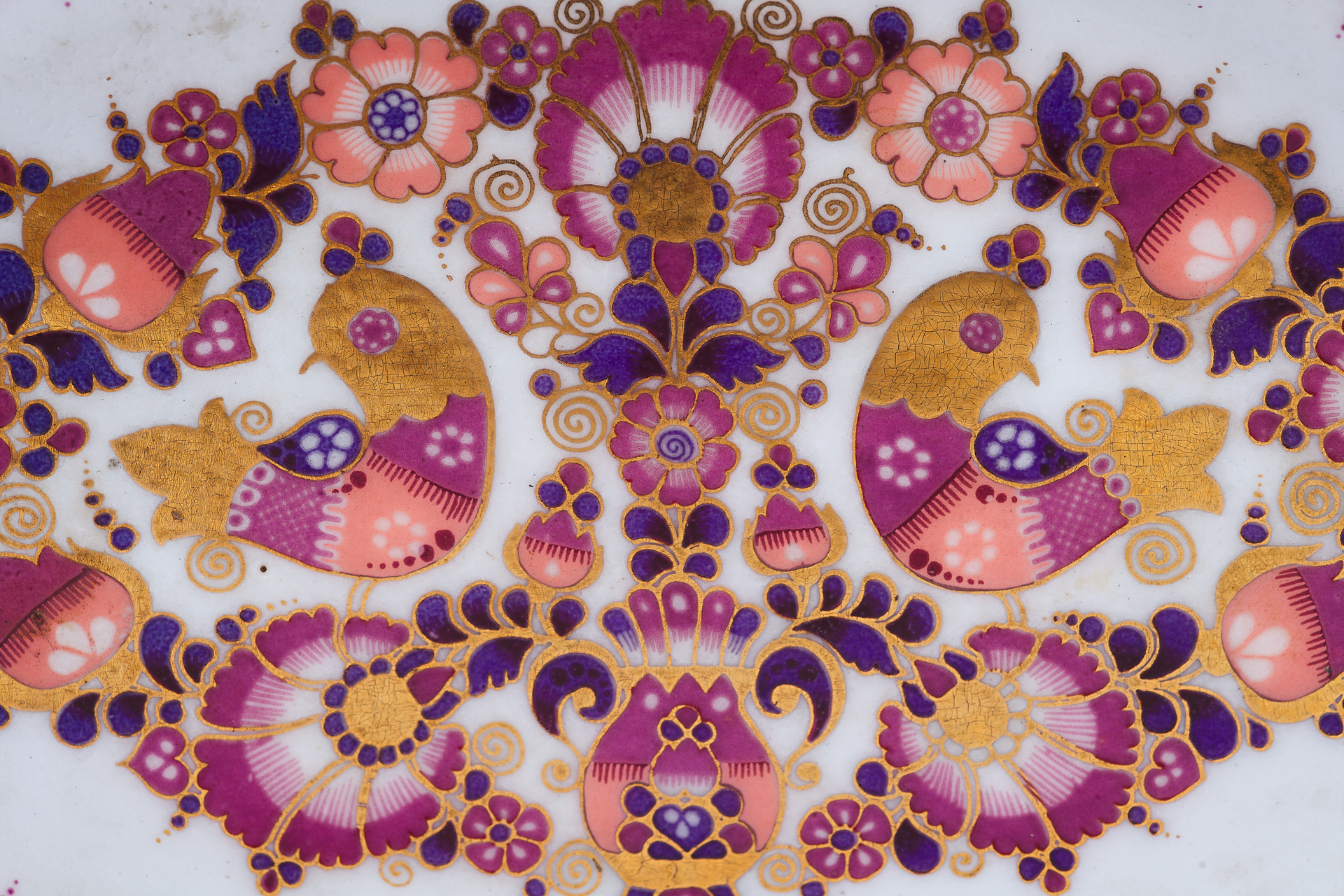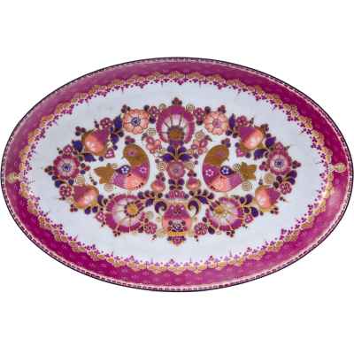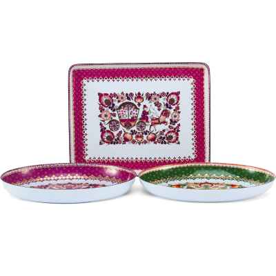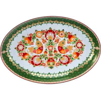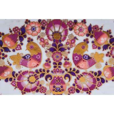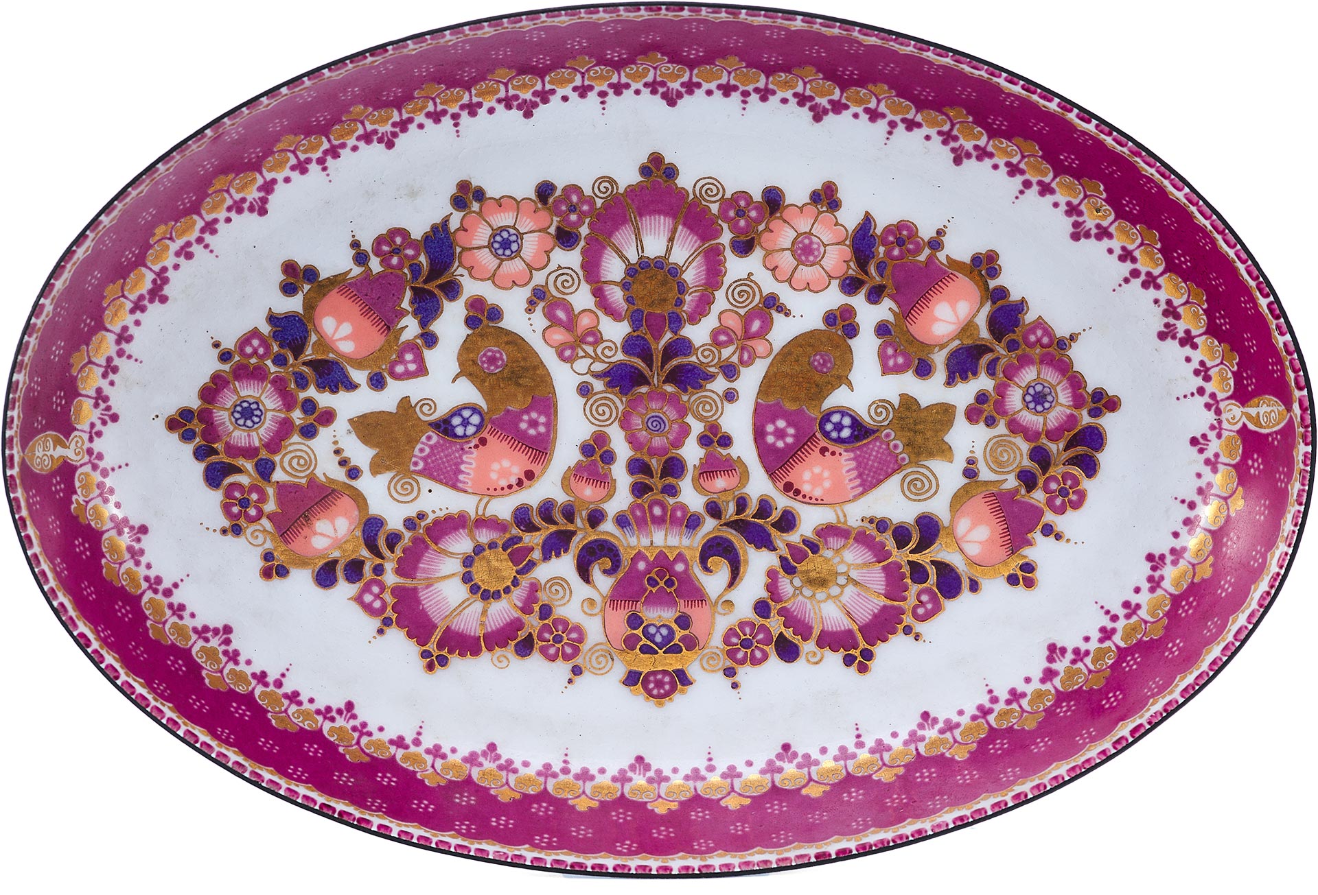 Набор из двух овальных блюд и одного прямоугольного подноса представляет собой изысканный пример декоративно-прикладного искусства 1950–1993 годов. Все предметы украшены красочной эмалевой росписью, выполненной в духе традиционного тирольского народного орнамента, характерного для региона Каринтия в Австрии. Композиции включают стилизованные цветочные мотивы, птиц и геометрические элементы, выполненные в насыщенной гамме красных, зелёных, розовых и золотистых оттенков, что подчёркивает декоративную направленность и ориентацию на фольклорный стиль.