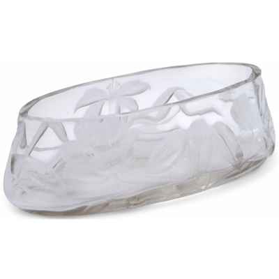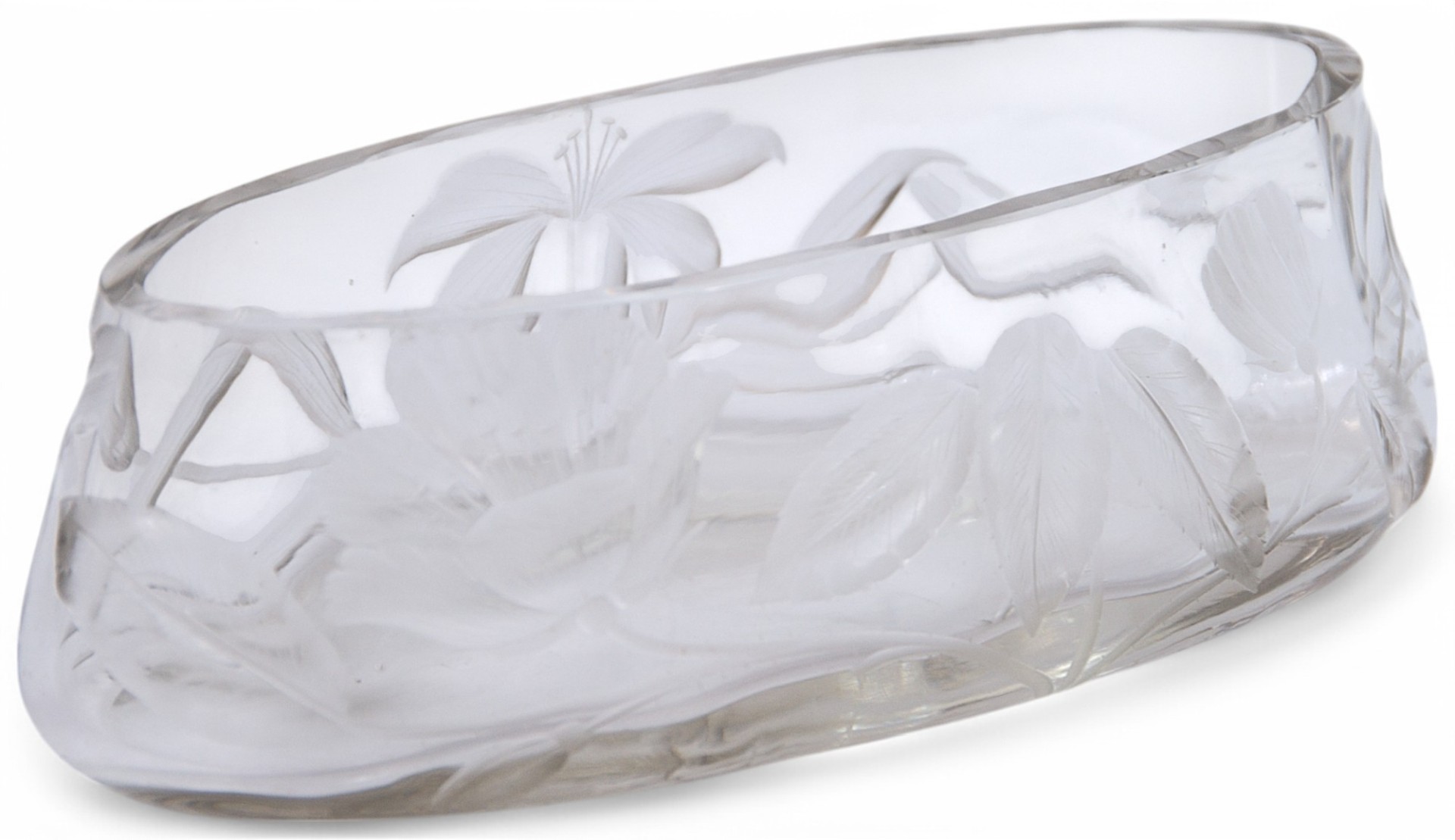 Ваза овальной формы. Дно плоское. Тулово декорировано граненым цветочным орнаментом. На основании надпись: “Moser