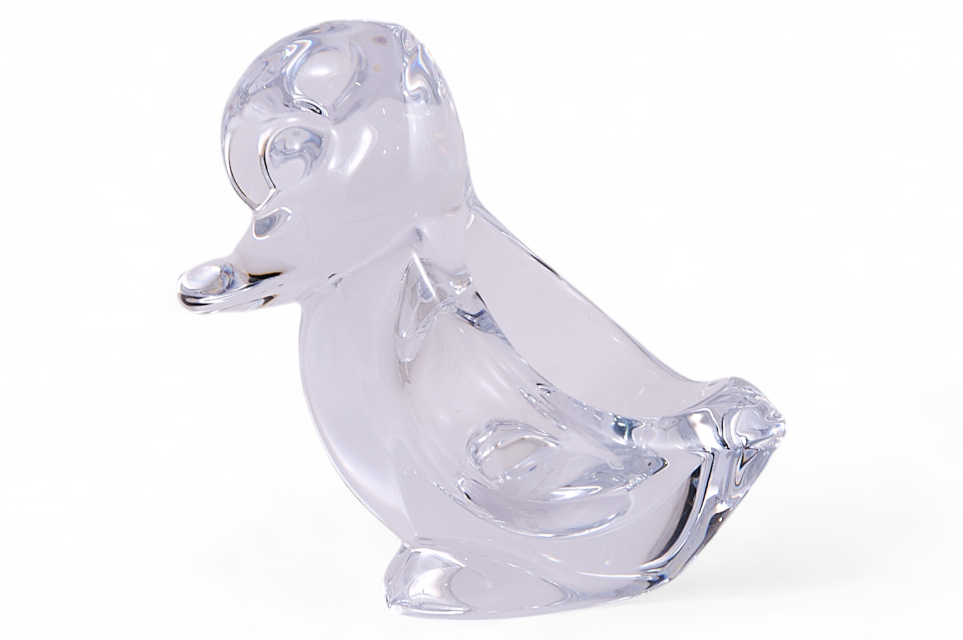 Эта антикварная подставка под сигару «Утенок», изготовленная во Франции в 1950–1976 годах, является редким образцом декоративного стеклоделия. Выполненная методом литья из прозрачного стекла, фигурка сочетает в себе изящную пластику форм и функциональное предназначение.