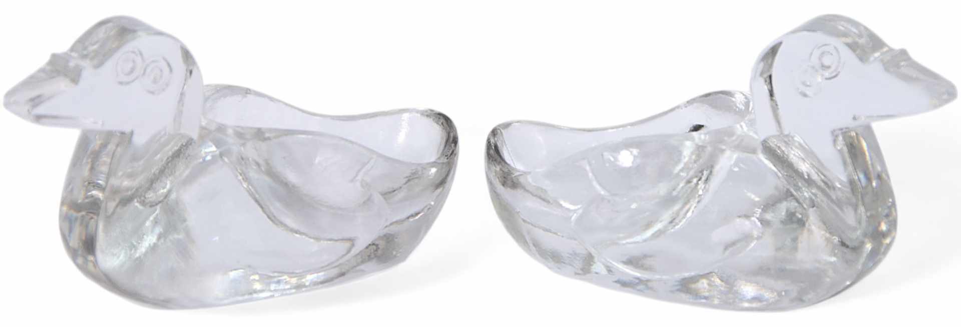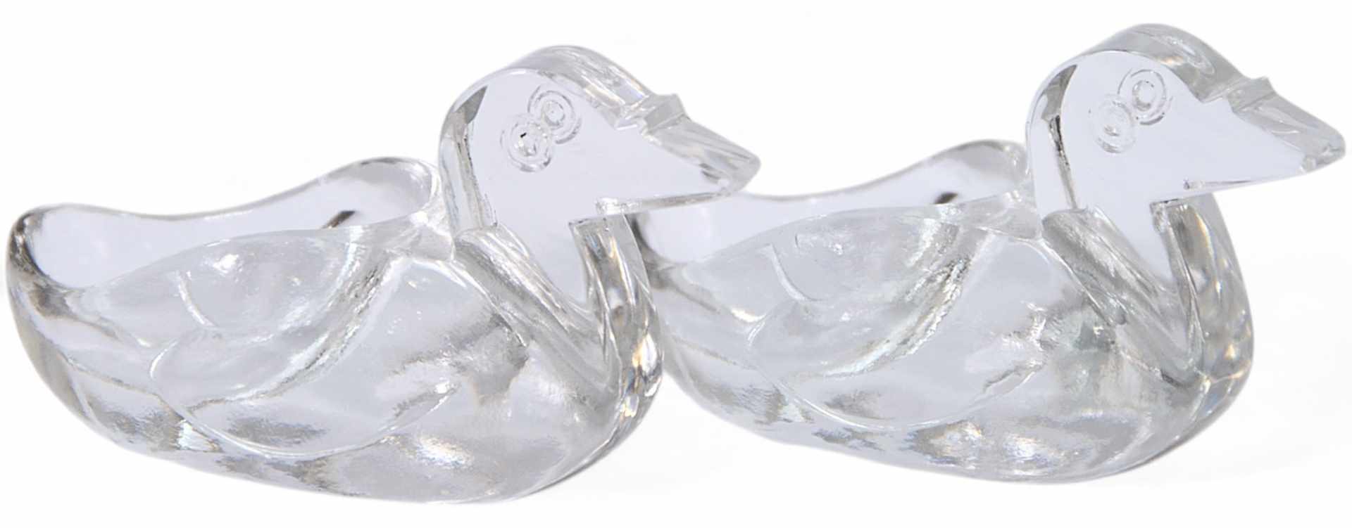 Представлены парные солонки в форме уточек.. На основании обеих солонок крутлое клеймо с надписью: «Baccarat». Baccarat Crystal - завод по производству изделий из стекла, расположенный в Баккара (Франция). Groupe du Louvre — главный пайщик-владелец завода. В 1734 г. король Ли XV дал разрешение на строительство завода в Лоррене (Вост. Франция) принцу-епископу кардиналу Луи-Жозефу де Лаваль-Монморанси (1710-1802). Завод специализировался на оконных стеклах, зеркалах и бокалах. Завод проработал на этой продукции до 1816 г. Количество рабочих на нем за этот период увеличилось до 3000 чел. В 1823 г. завод прошел первую королевскую комиссию. И с тех пор регулярно проходил королевские комиссии. В 1855 г. Завод получил гран-при на Всемирной выставке в Париже. Завод Баккара стал первым из тех, кто начал маркировать свои изделия клеймами.