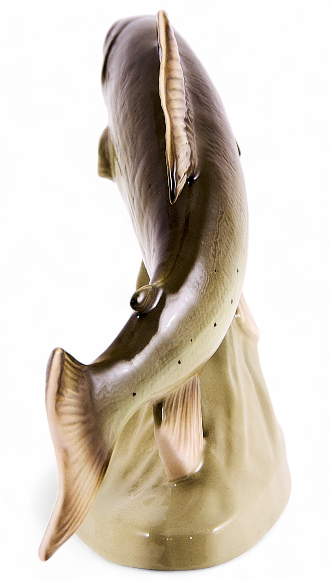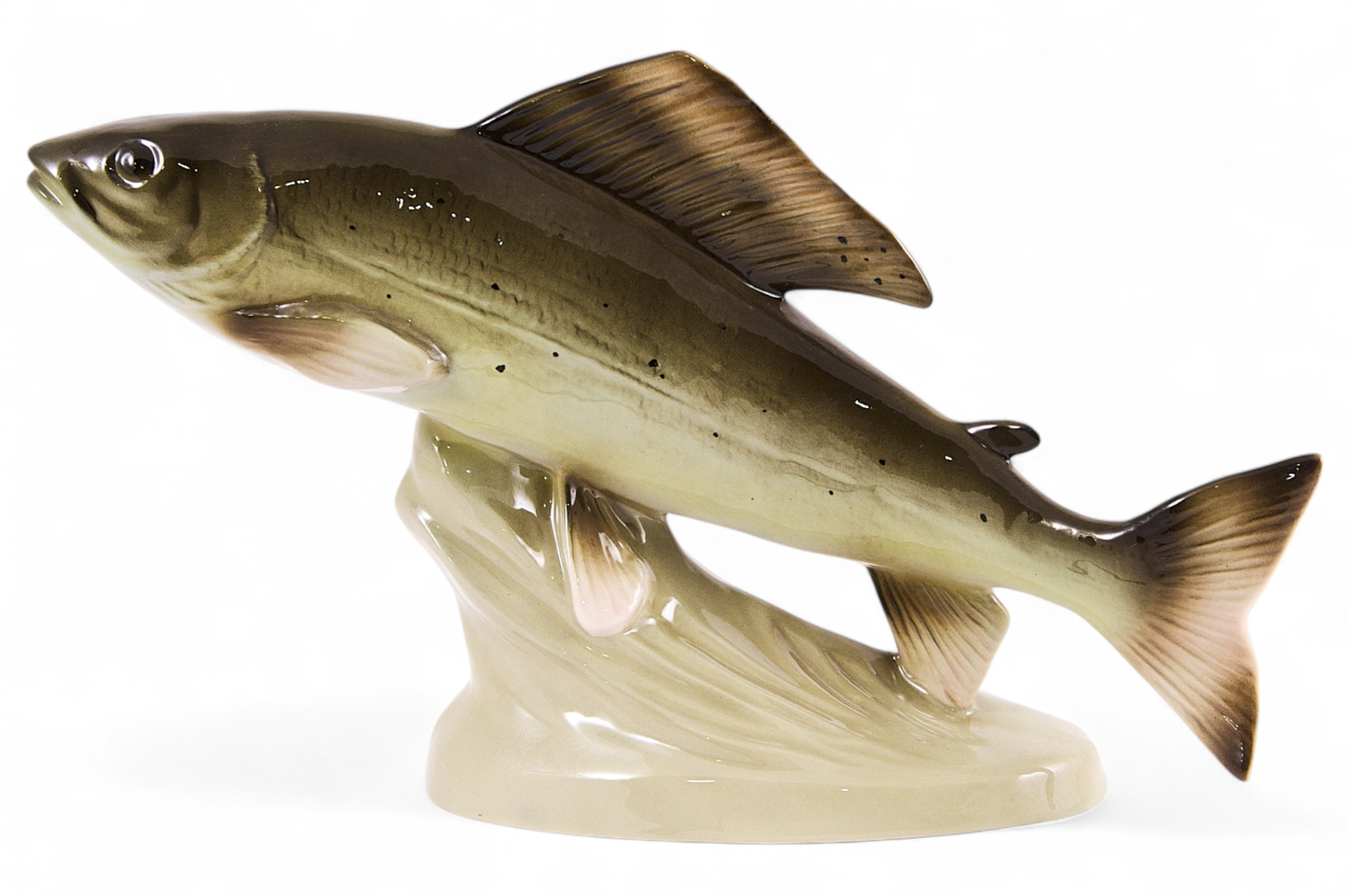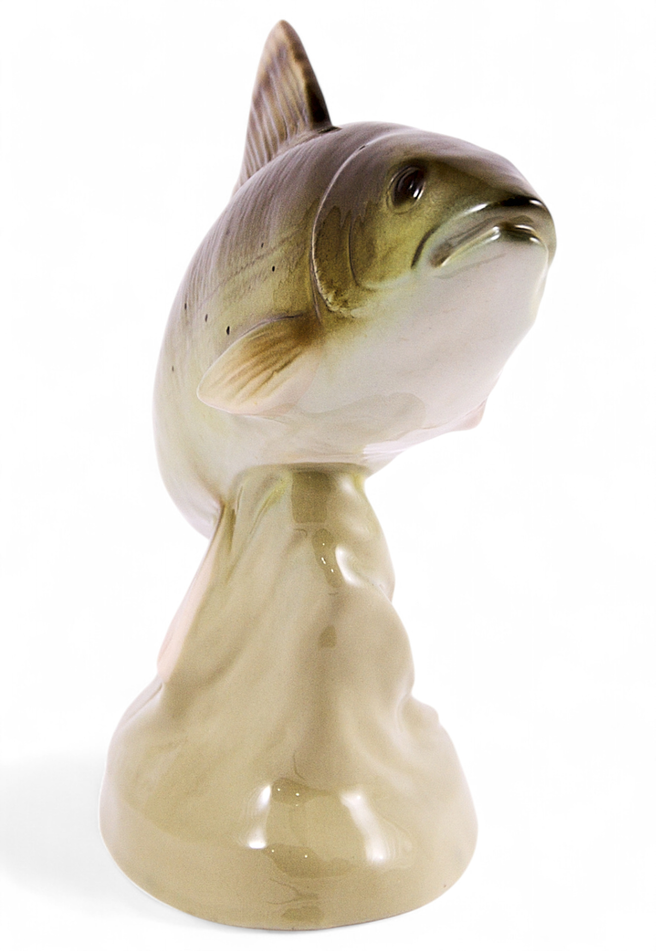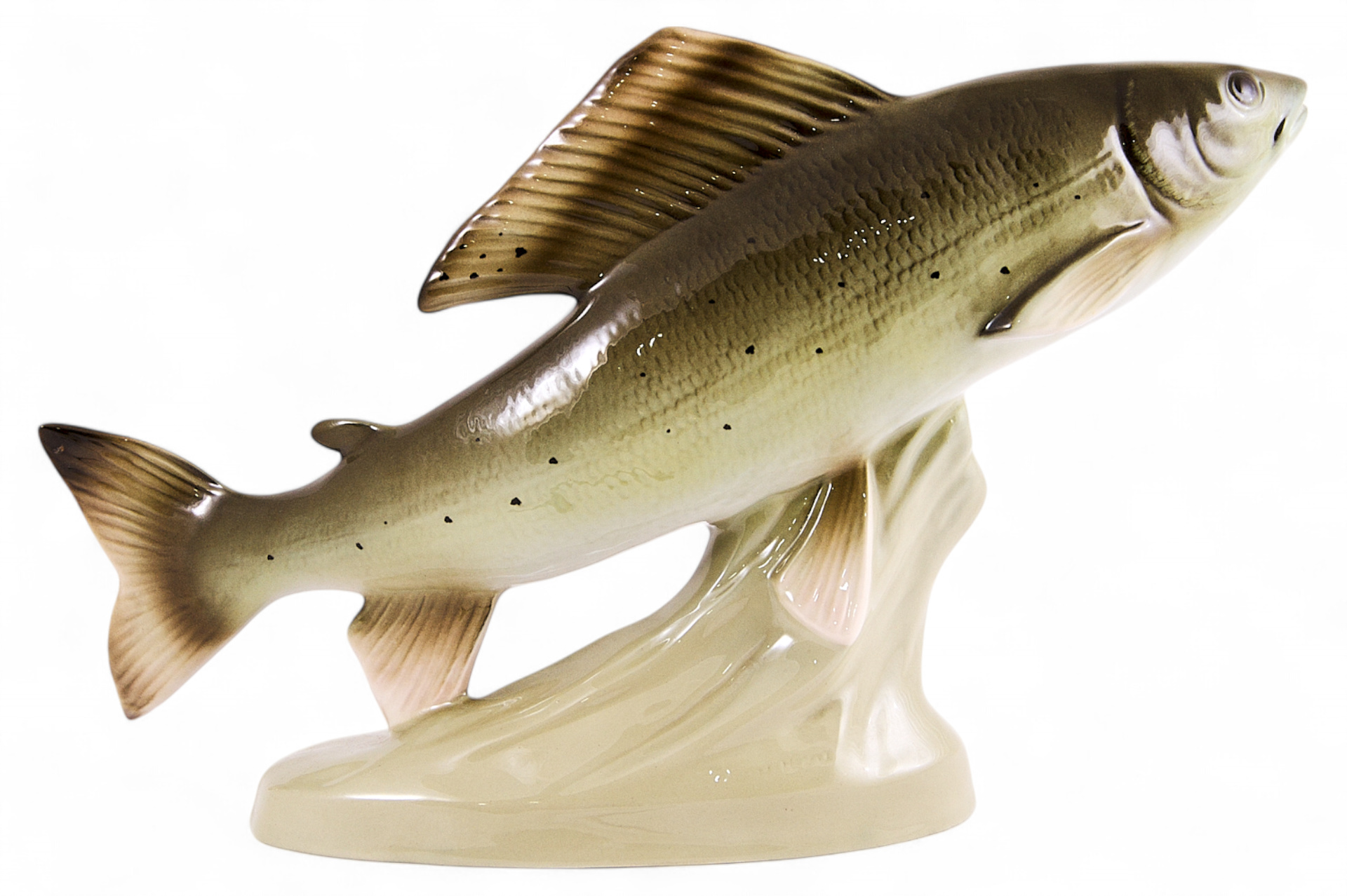 Скульптура форели. Скульптура принадлежит к серии фигур представляющих речных рыб, изготавливавшихся чешской фарфоровой фабрикой Royal Dux в период с 1946 по 1990 гг. На основании торговый знак фабрики с литерой “Д”. В “тесте” производственное обозначение: “822 24”. Состояние использованных материалов не противоречит указанной датировке.