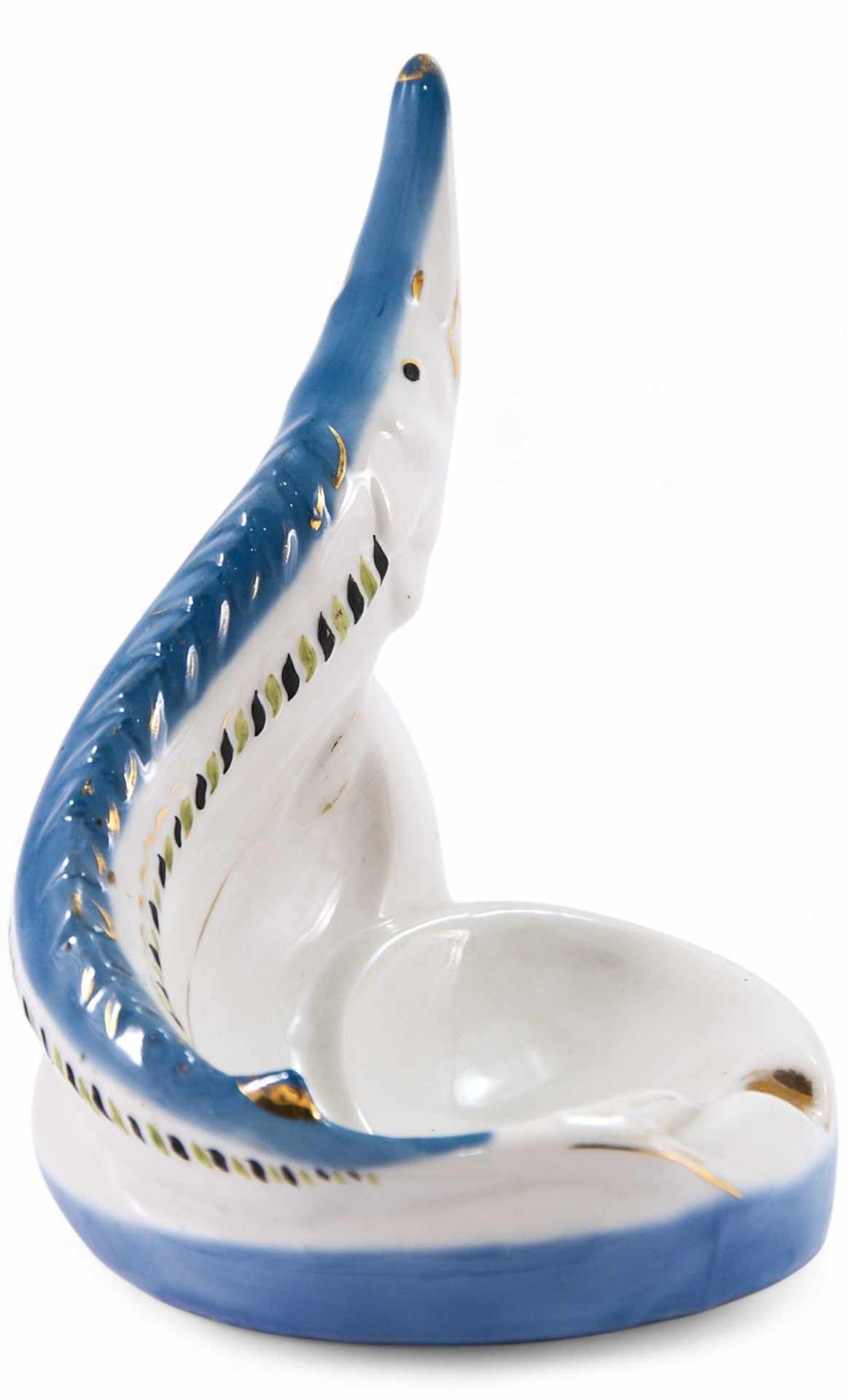 Изделие выполнено из фарфора с росписью, а его высота составляет 18,8 см. Основной художественный элемент – стилизованная фигура осетра, формирующая ручку пепельницы. На основании изделия находится клеймо «ЗХК Полонное», использовавшееся заводом в 1960-х – начале 1970-х годов.