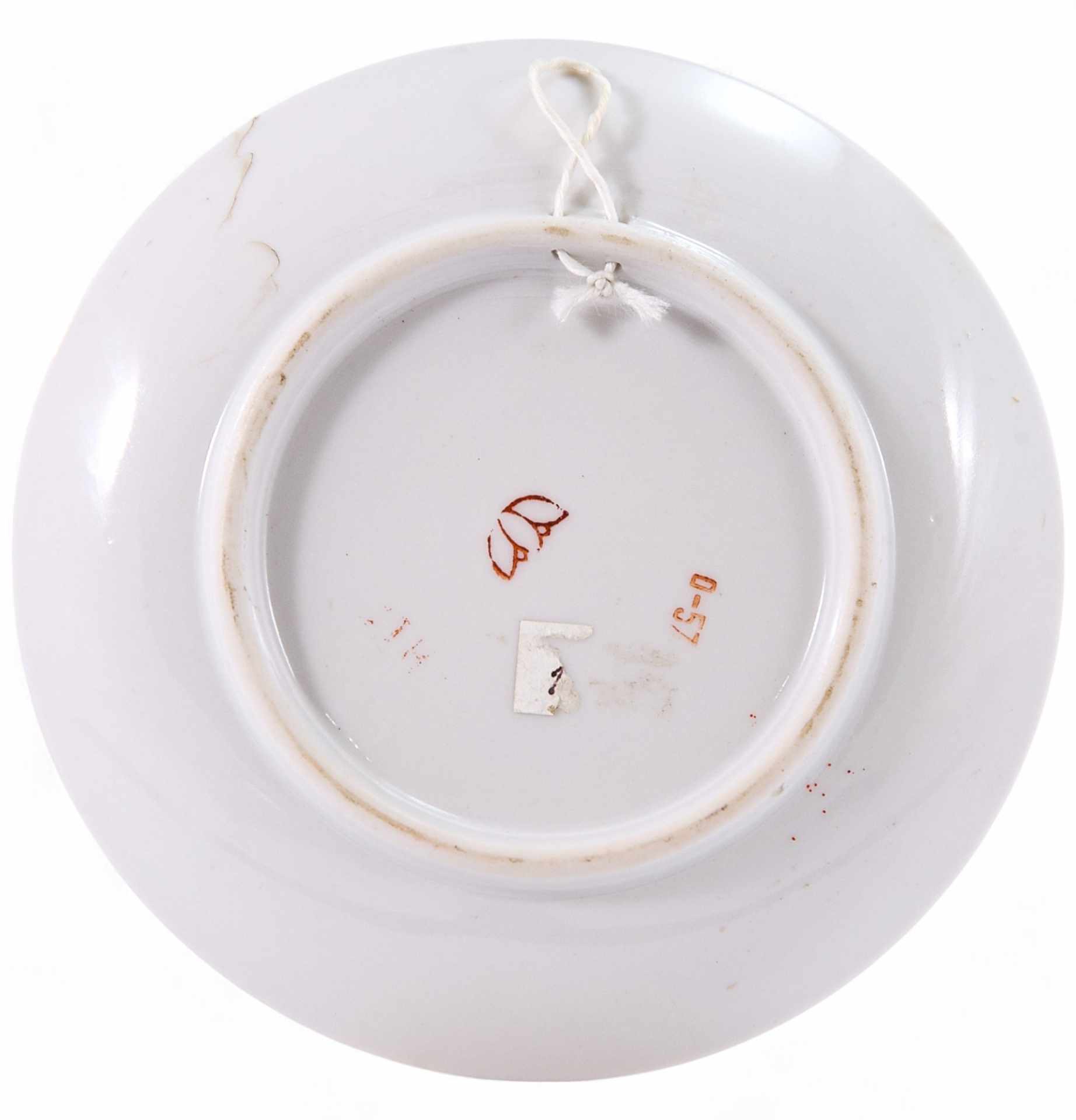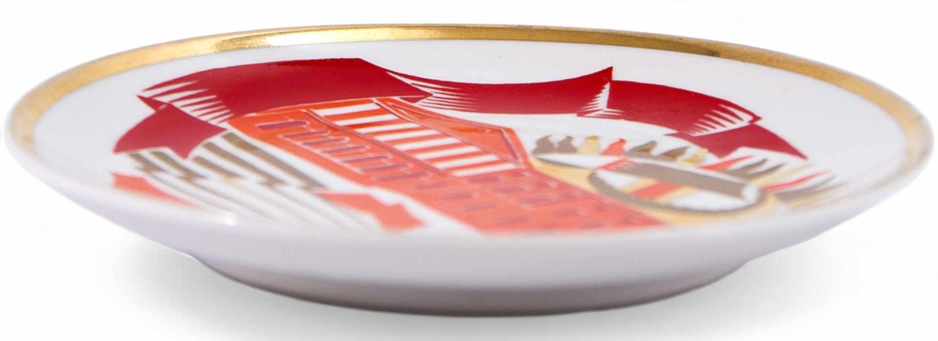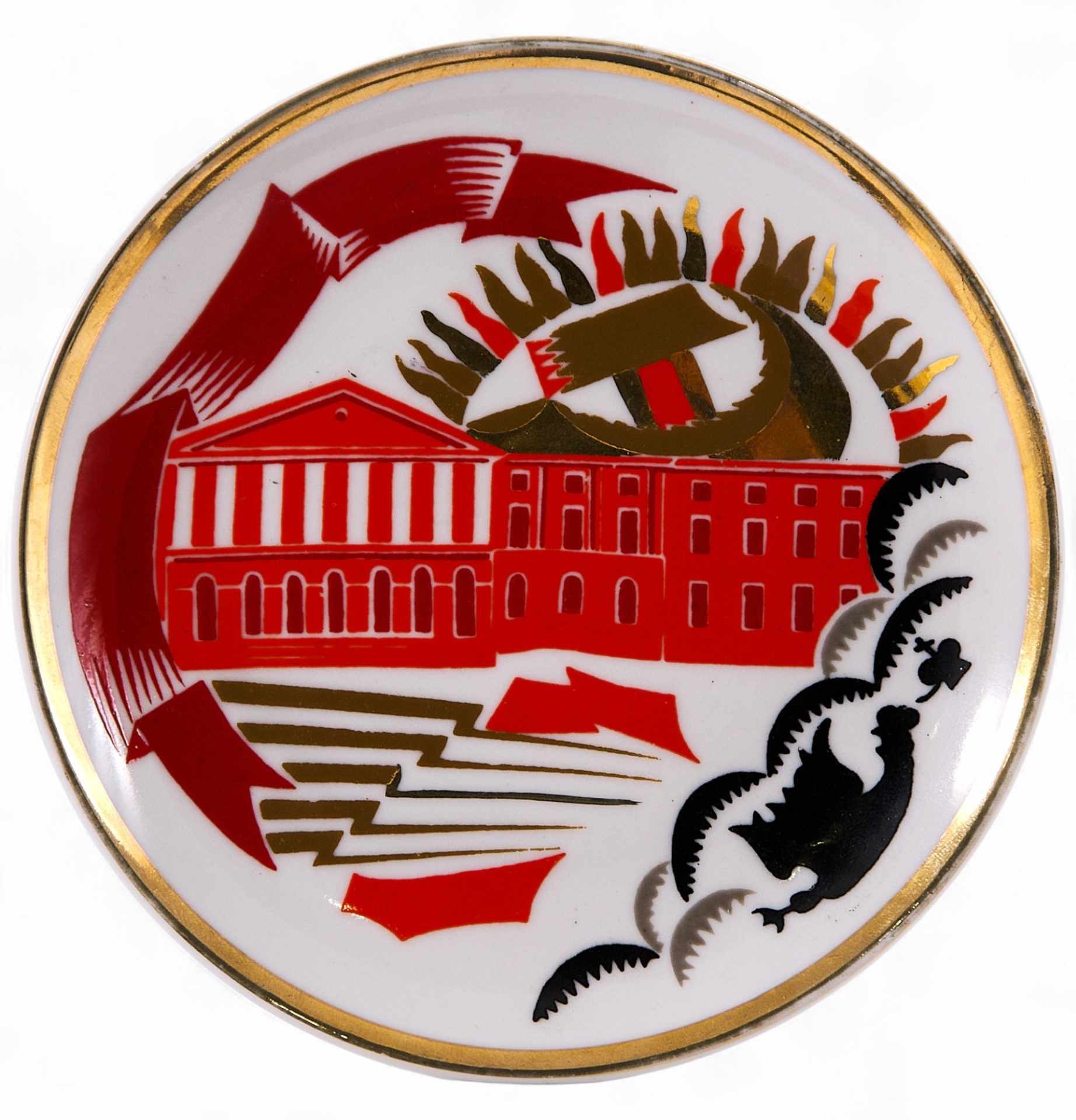 Тарелка, украшенная рисунком со стилизованным изображением символа Советской власти — серп и молот, восходящий над Смольныминститутом, в манере С.В. Чехонина, создателя советского агитфарфора. На донце тарелки клеймо Южноуральского фарфорового завода с 1963 по 1973 гг В 1918 году Императорский завод был переименован в Государственный фарфоровый завод (ГФЗ) и перешел в ведение Народного комиссариата просвещения.