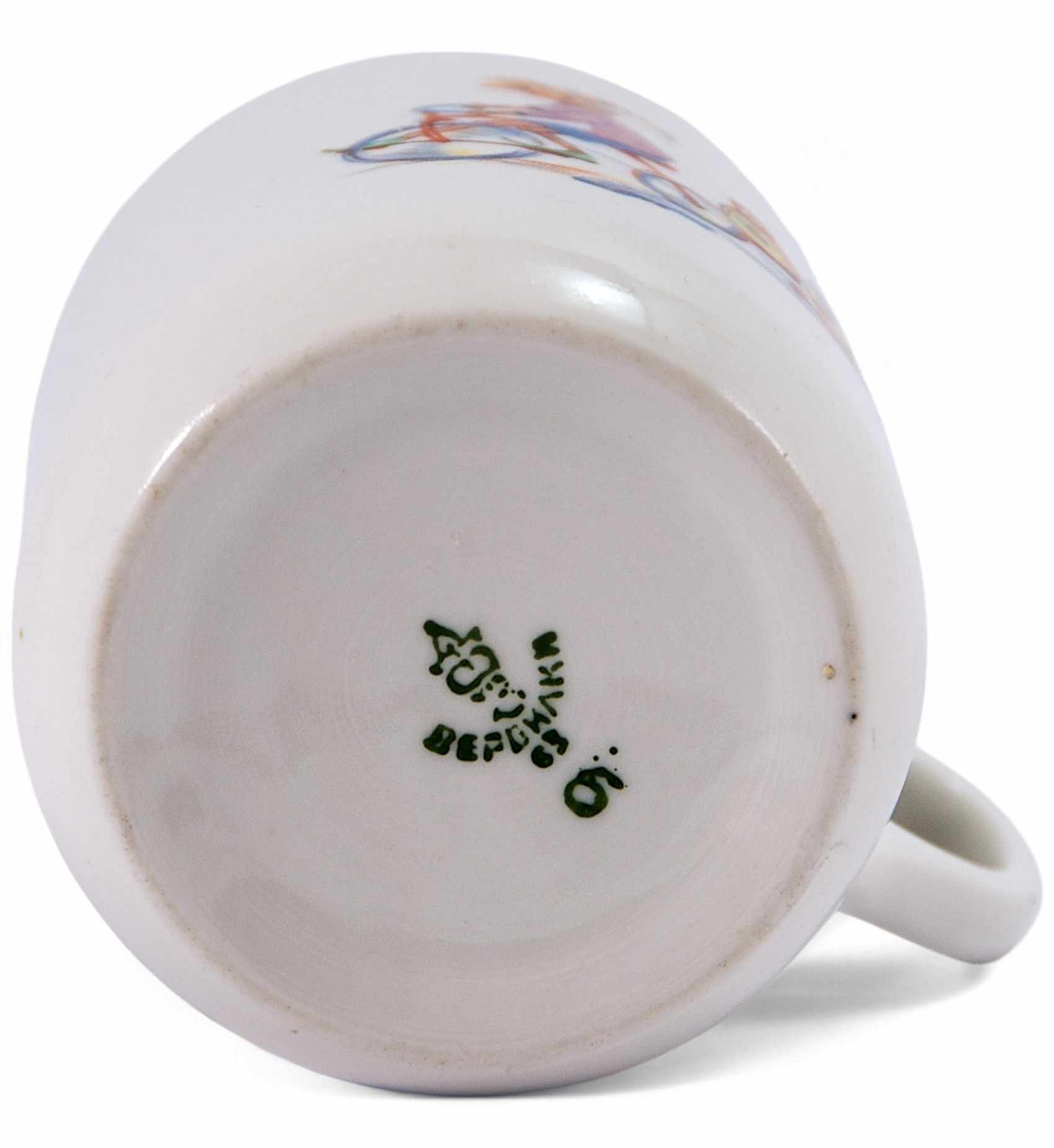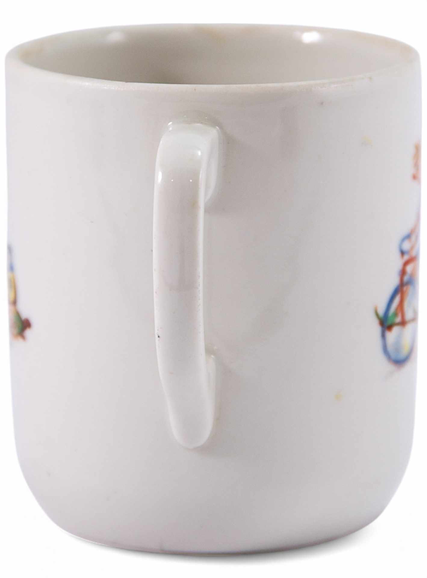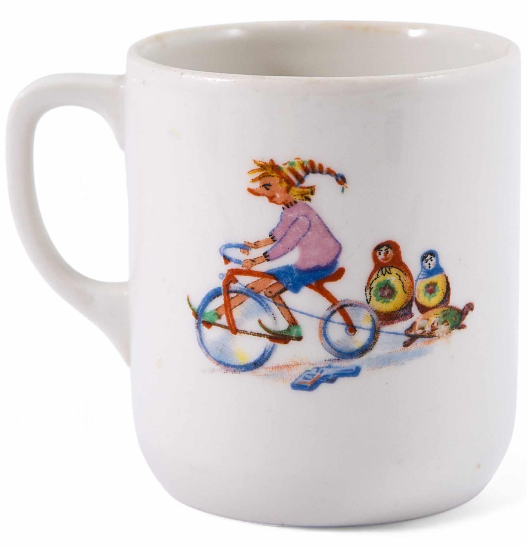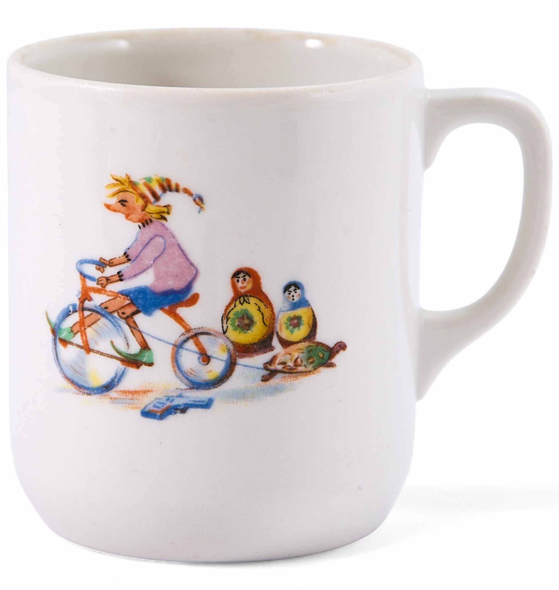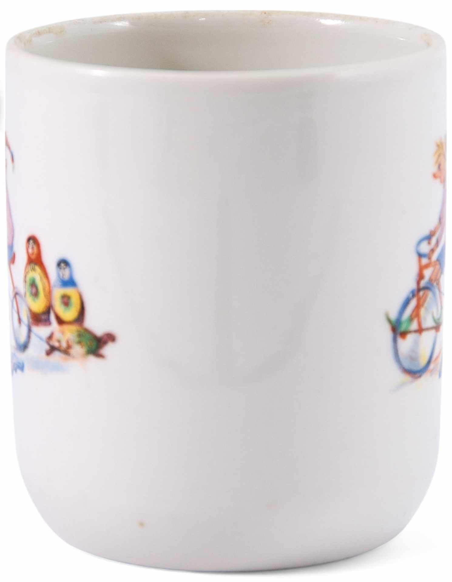 Буратино на велосипеде. На основании кружки имеется клеймо Дмитровского фарфорового завода с указанием датировки —