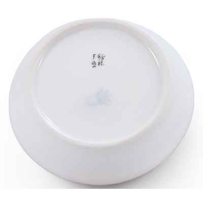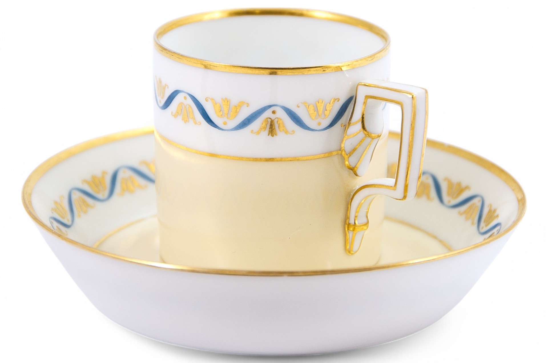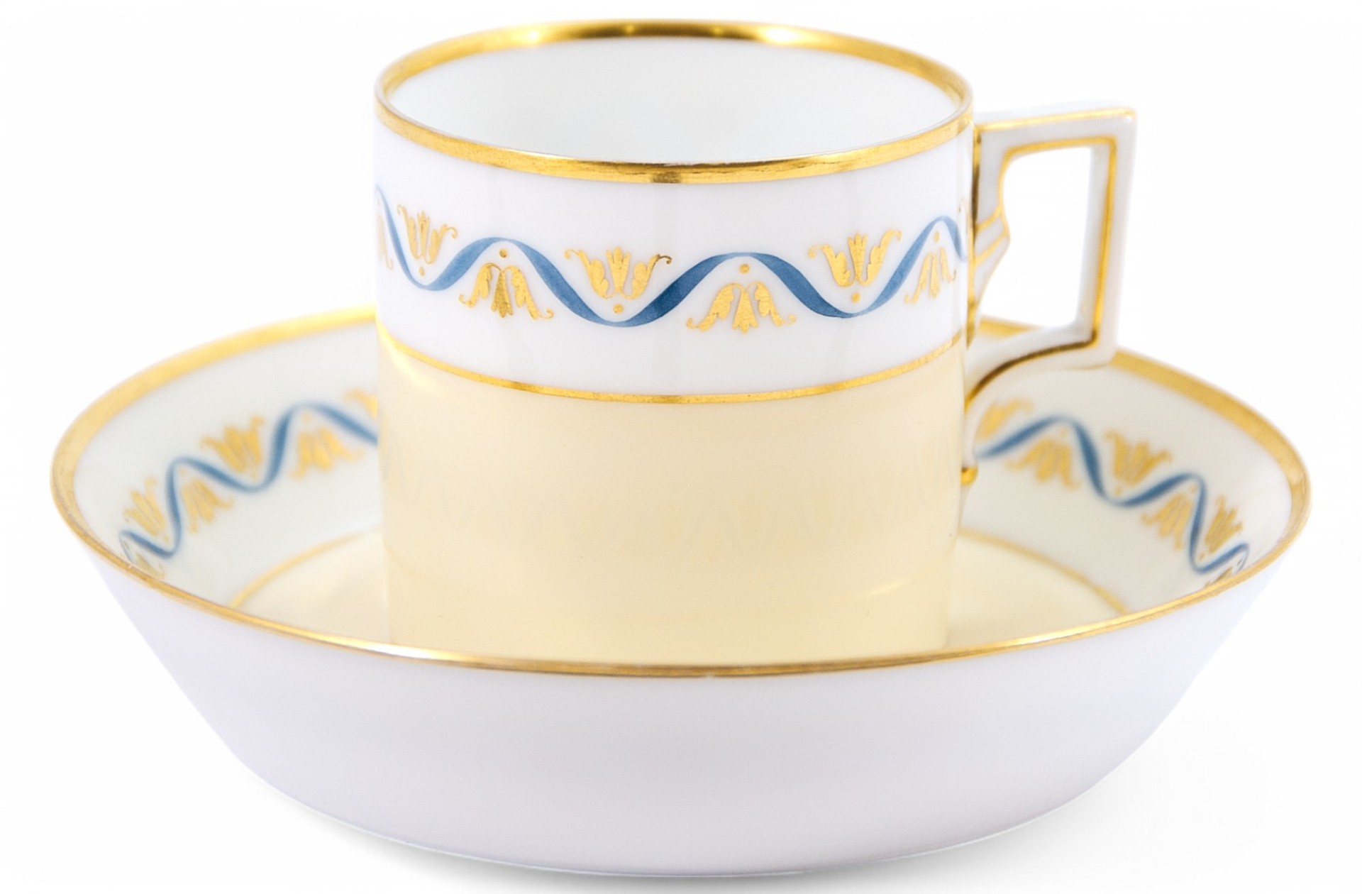 Чайная пара, ванильно-молочного цвета по форме тяготеющая к стилю модерн, с характерной для этого стиля ручкой и росписью. На дне чашечки и блюдца два, повторяющих друг друга клейма, синего цвета с плохо читаемой надписью «Wahliss». Одно из клейм поддглазурное, другое лежит «в тесте». А также маркировка: «F 6/5 D-57». Клейма предположительно можно отнести к клеймам, ставившимся на фабрике Alexandra Porcelain Works Emst Wahliss c 1897 по 1921 г. Ernst Wahliss Trnovany, Czech Republic (Turn-Teplitz, Bohemia, Austria). Художественное производство ЭрнстаВахлисса было основано в 1863 г. в Trnovany, Богемия (Tum-Теплице, Чехия, Австрия). Э. Вахлисс имел магазины в Лондоне и Вене, где продавал кроме своей продукции чешский фарфор.