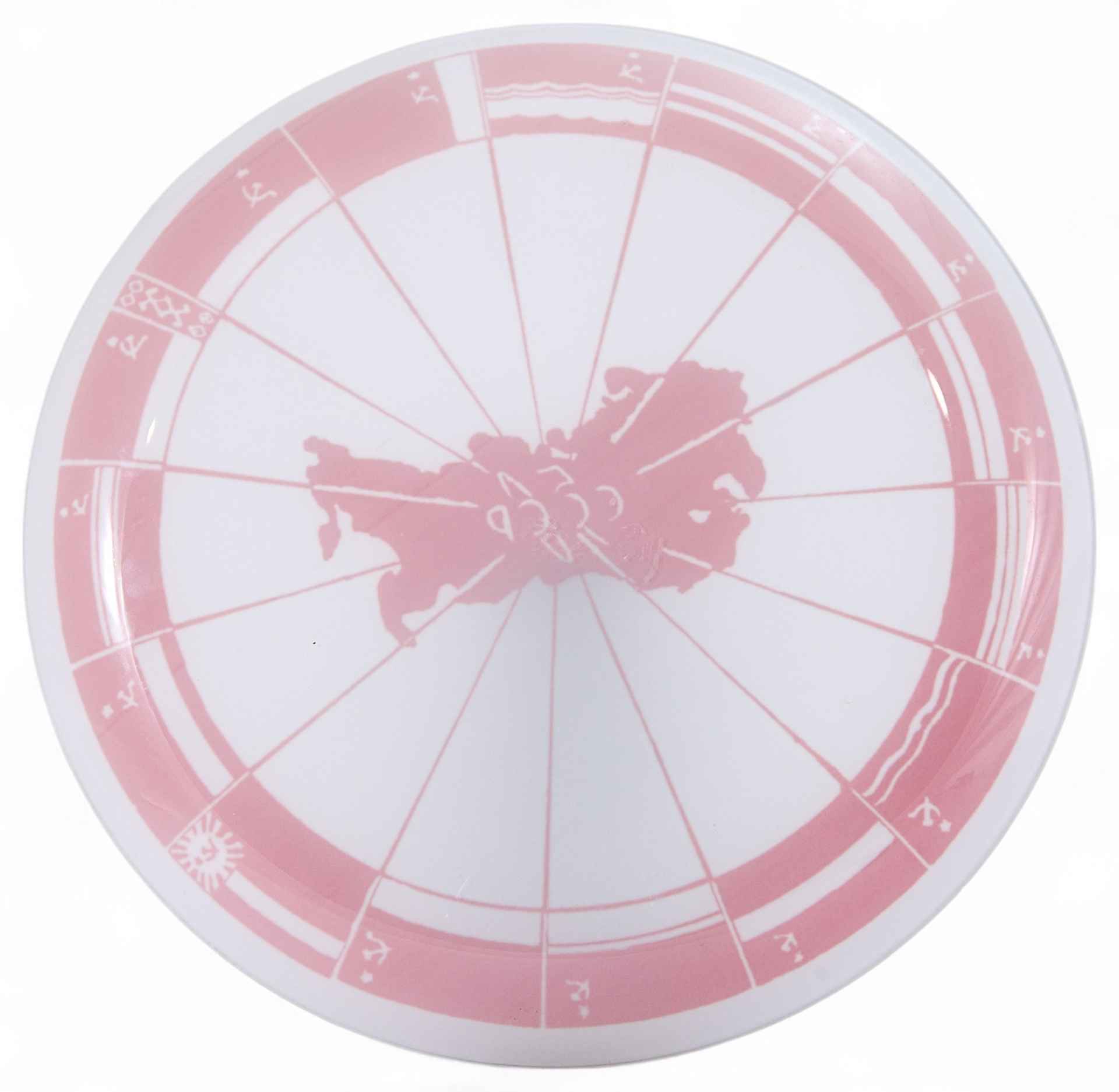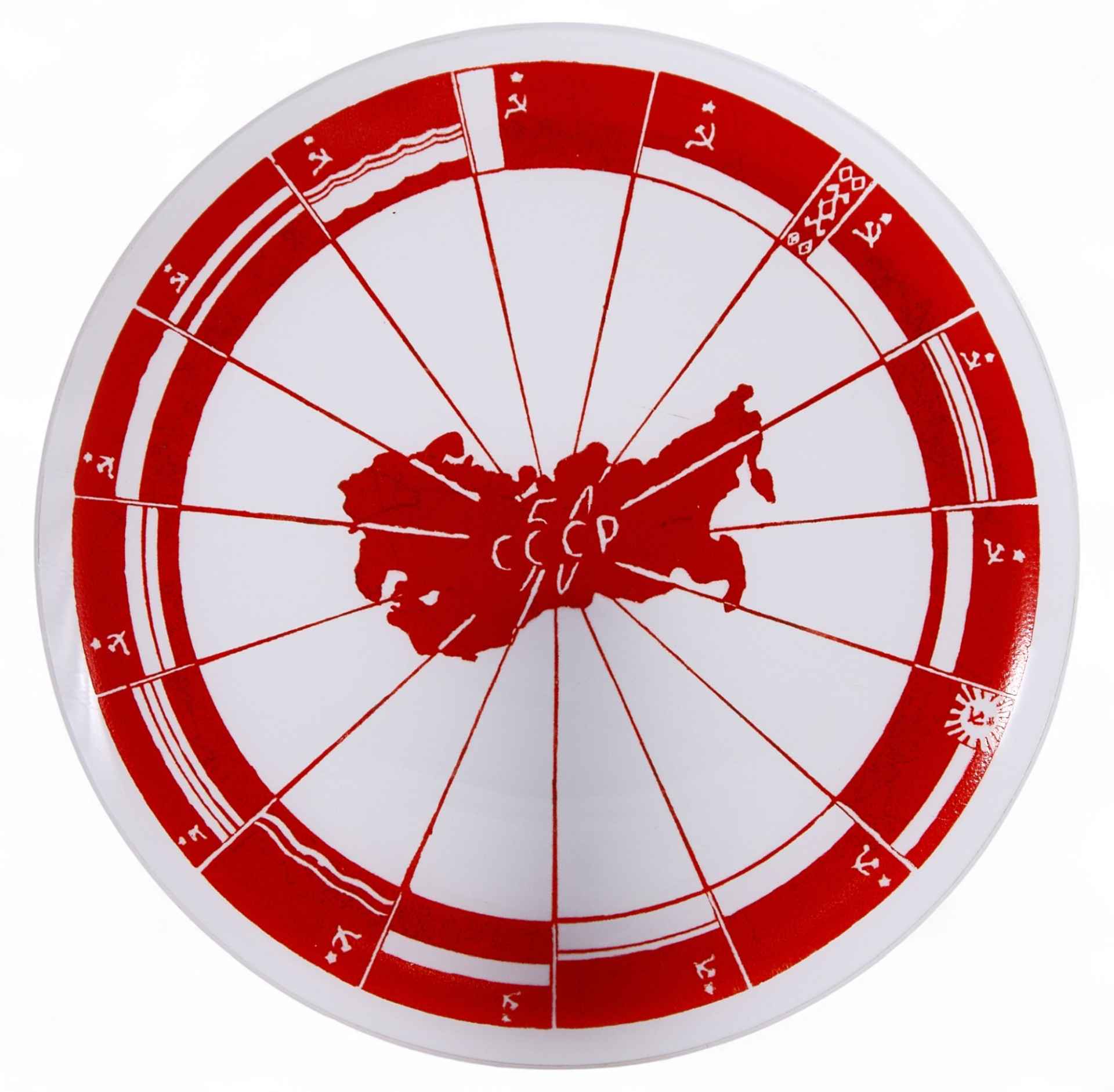 Стеклянное памятное блюдо с изображением территории СССР и расходящимися от центра лучами, по краям которых расположены флаги союзных респу блик. Подобные памятные изделия и сувениры в большом количестве были изготовлены в 1967 г. Изготавливались юбилейные стеклянные блюда, приуроченные к этому событию в технике резьбы, гравировки, литья, штампа, росписи, декели и друг, техниках, являя широкий спектр творческих подходов и изысканий отображающих значимость этого события. Поскольку, на каждом заводе существовал свой художественный отдел или бригада рабочих, выполнявших заводствие заказы на производство сувениров, мелкой и крупной художественной пластики, все они были задействованы в изготовлении подобных изделий.