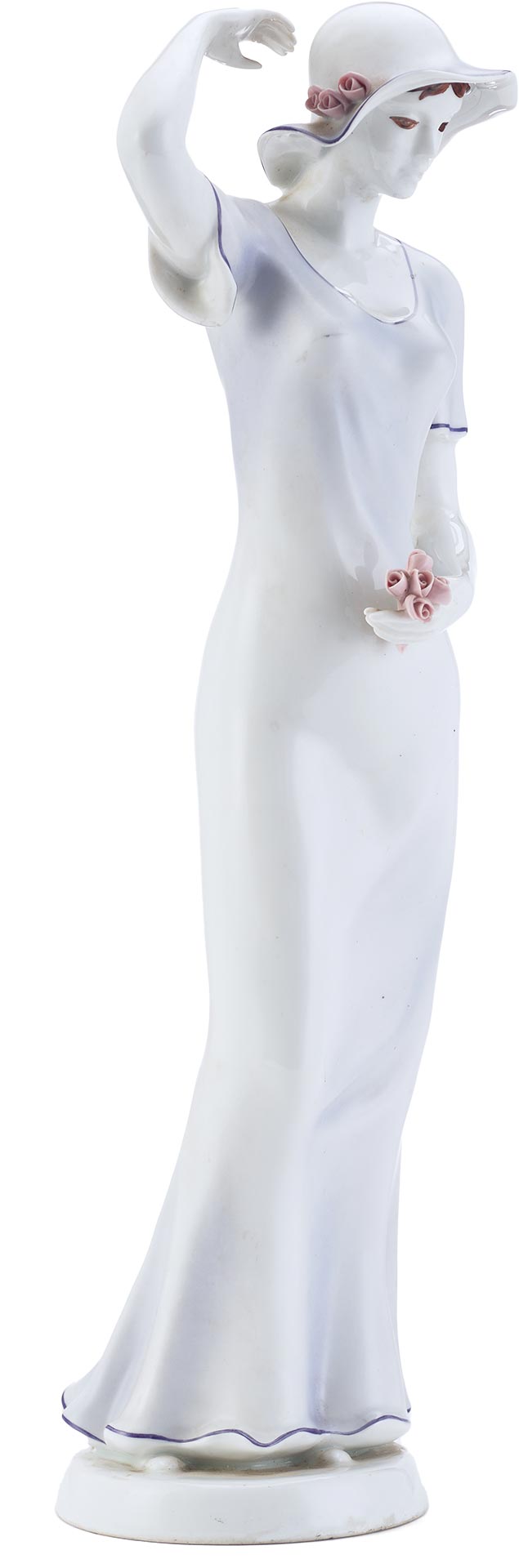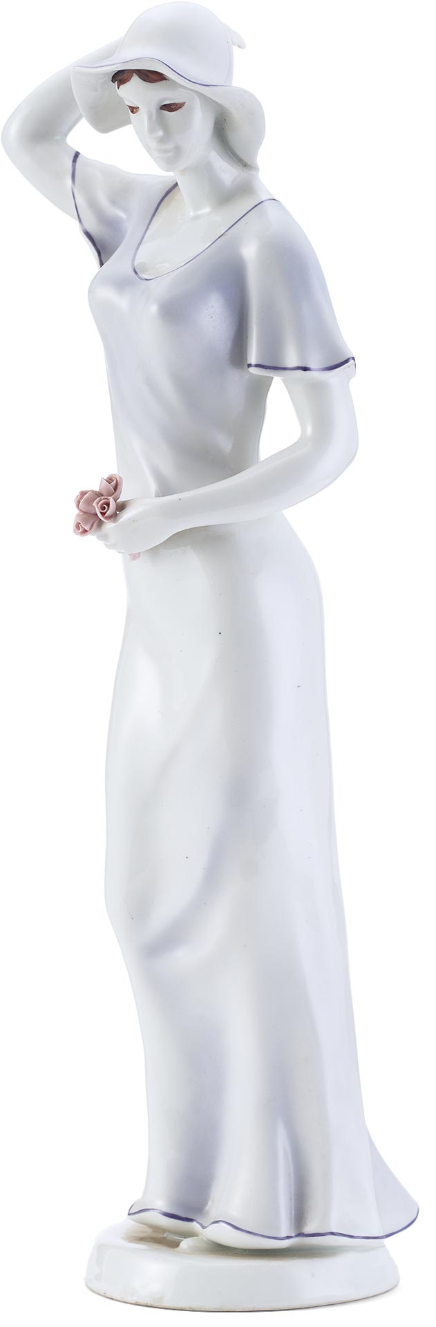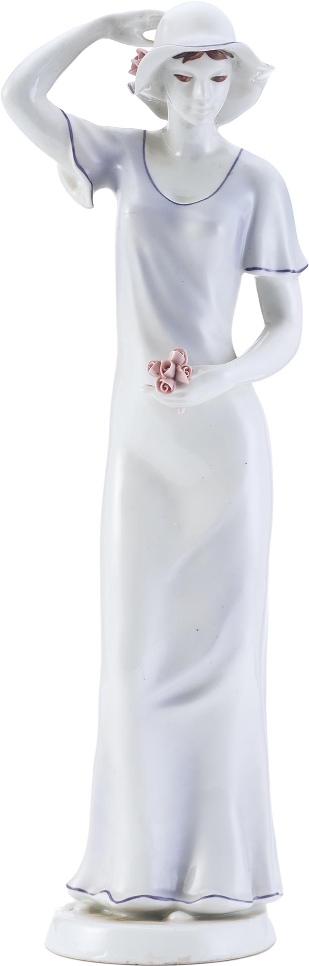 Скульптура «Девушка с цветками» представляет собой изящное произведение фарфорового искусства, созданное на фабрике Холлохаза в Венгрии в 1980-1990-х гг. Фигура изображает молодую женщину в длинном, струящемся платье, с изящными линиями силуэта, подчеркивающими элегантность образа. На ее голове широкополая шляпа, украшенная цветами, а в одной руке она держит небольшой букет.