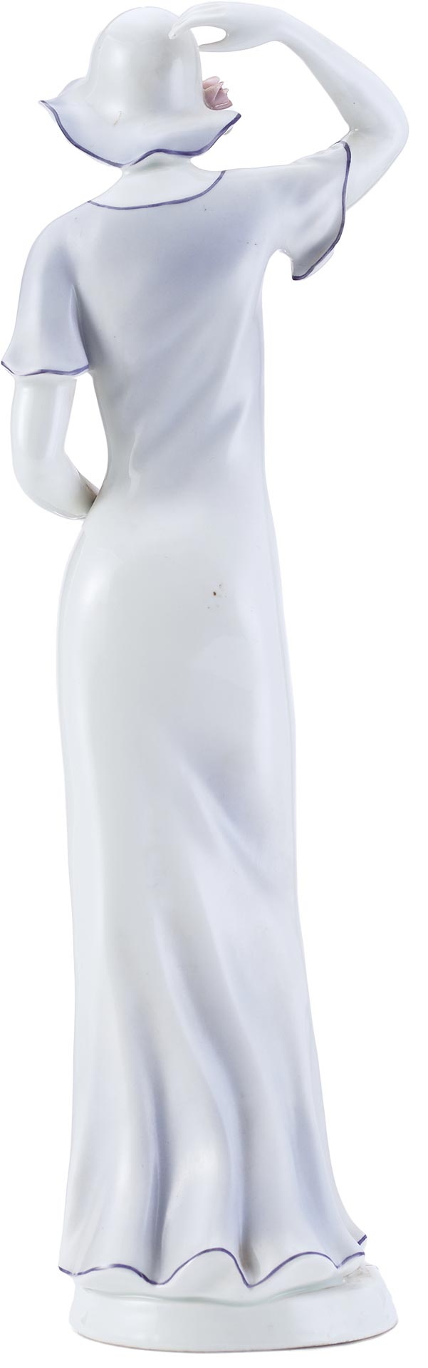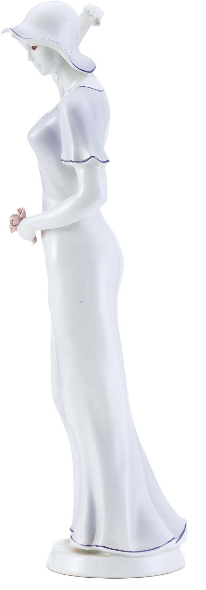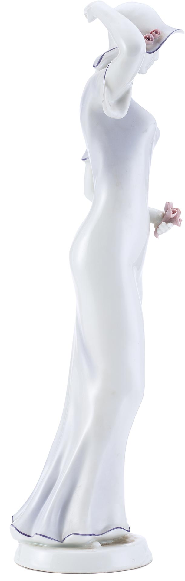 Скульптура «Девушка с цветками» представляет собой изящное произведение фарфорового искусства, созданное на фабрике Холлохаза в Венгрии в 1980-1990-х гг. Фигура изображает молодую женщину в длинном, струящемся платье, с изящными линиями силуэта, подчеркивающими элегантность образа. На ее голове широкополая шляпа, украшенная цветами, а в одной руке она держит небольшой букет.