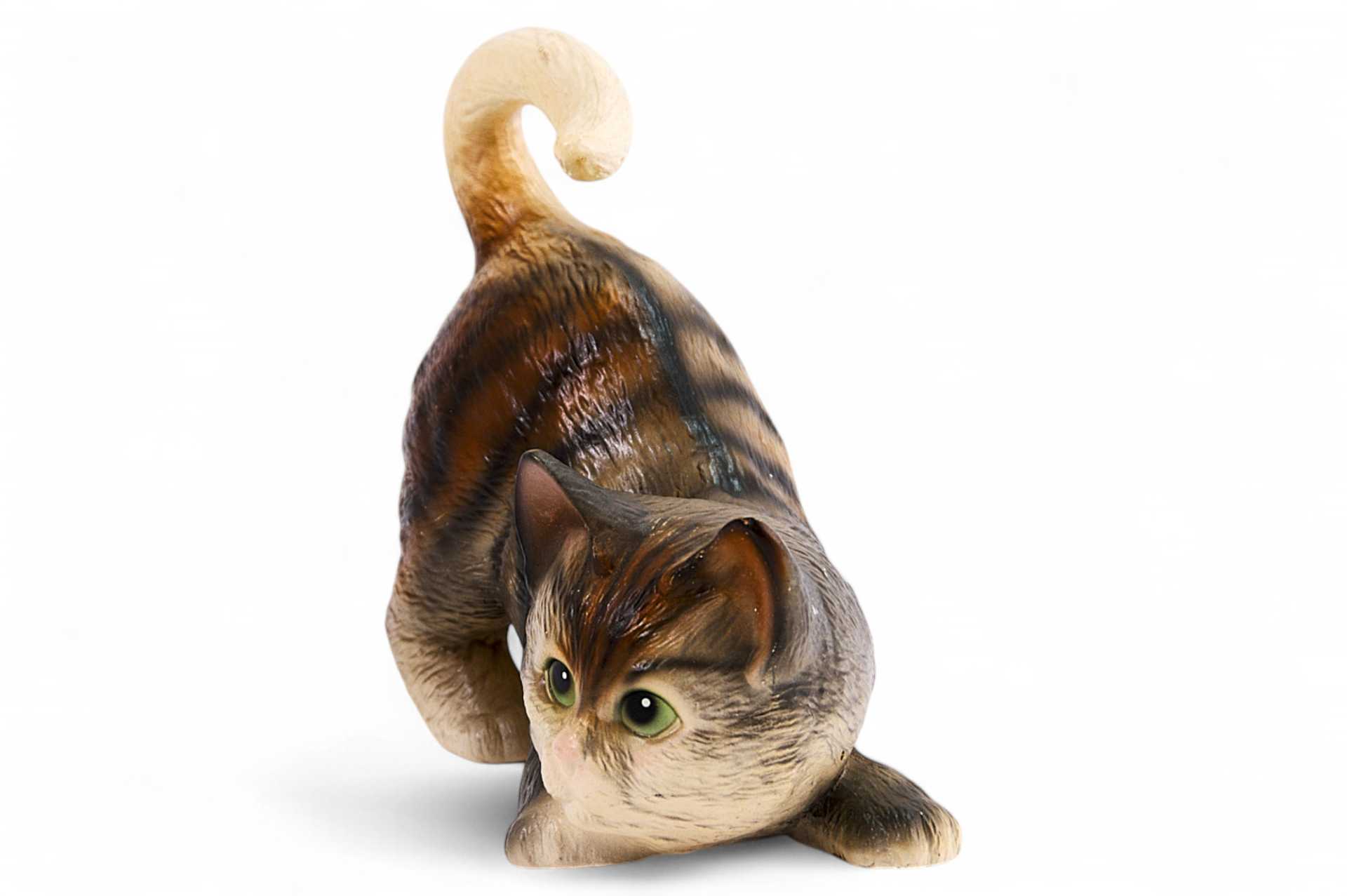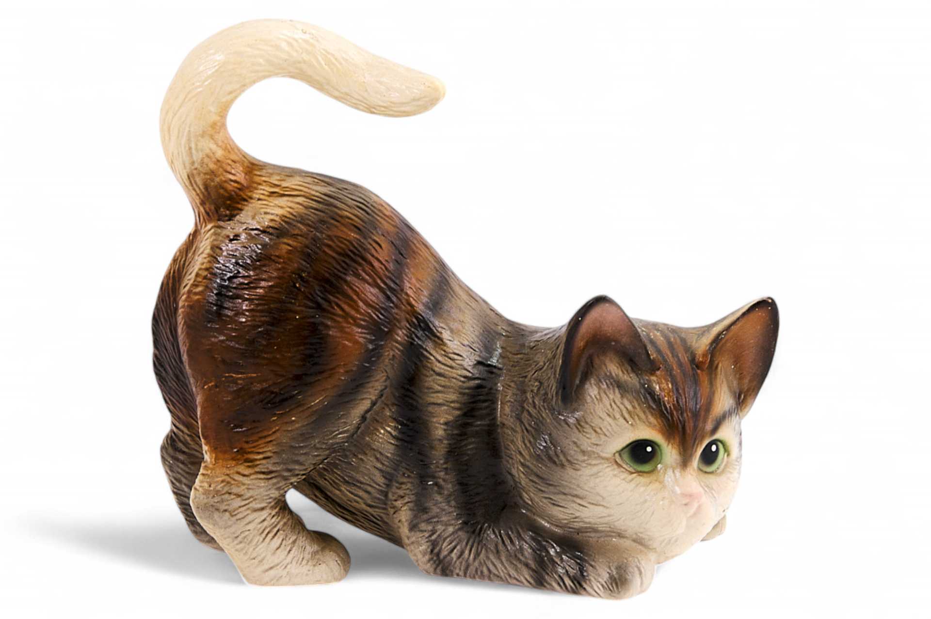 Скульптура котенка в характерной позе перед прыжком.Эта фигура относится к серии аналогичных скульптур изображающих котят в различных позах. Производство подобных фигурок животных (преимущественно кошек и собак) довольно широко распространено в европейском фарфоровом производстве (в особенности в Германии) в середине XX в.