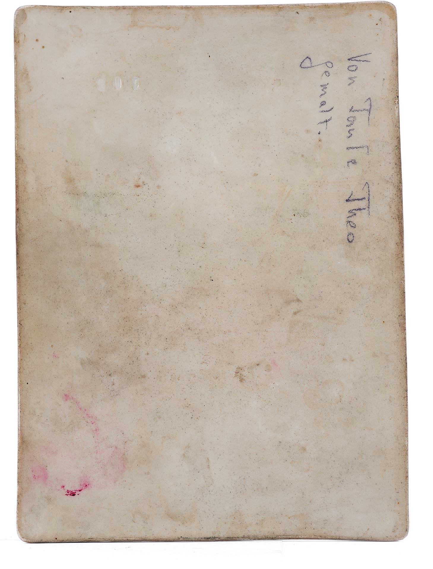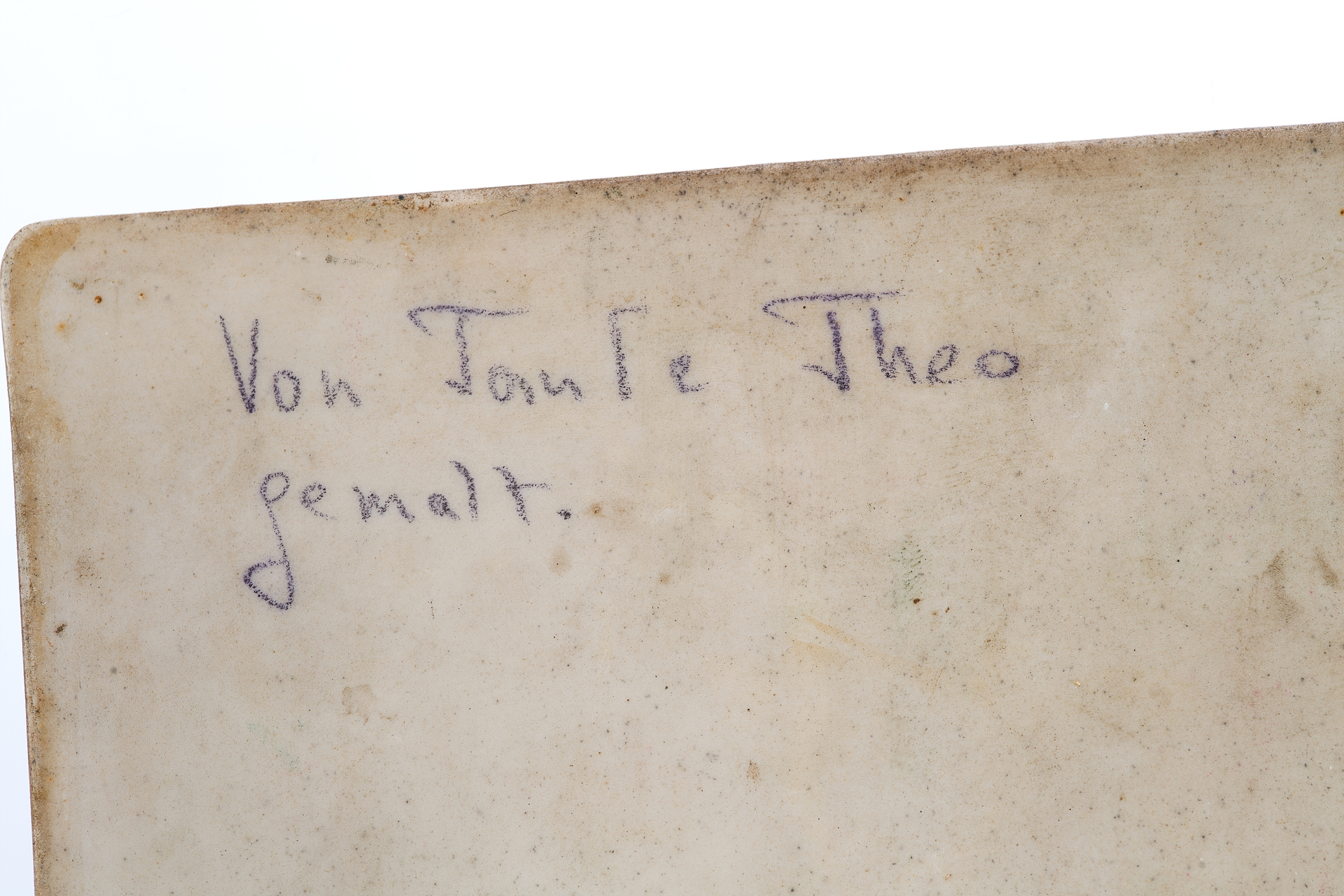 На обороте изделия имеется номерной штамп в тесте (предположительно 108), а по краю нанесена подпись: «von Taule Theo / gemalt» — что указывает на конкретного художника, исполнившего роспись, в том числе возможного копииста.