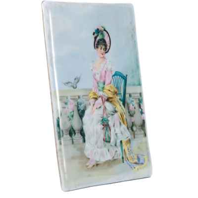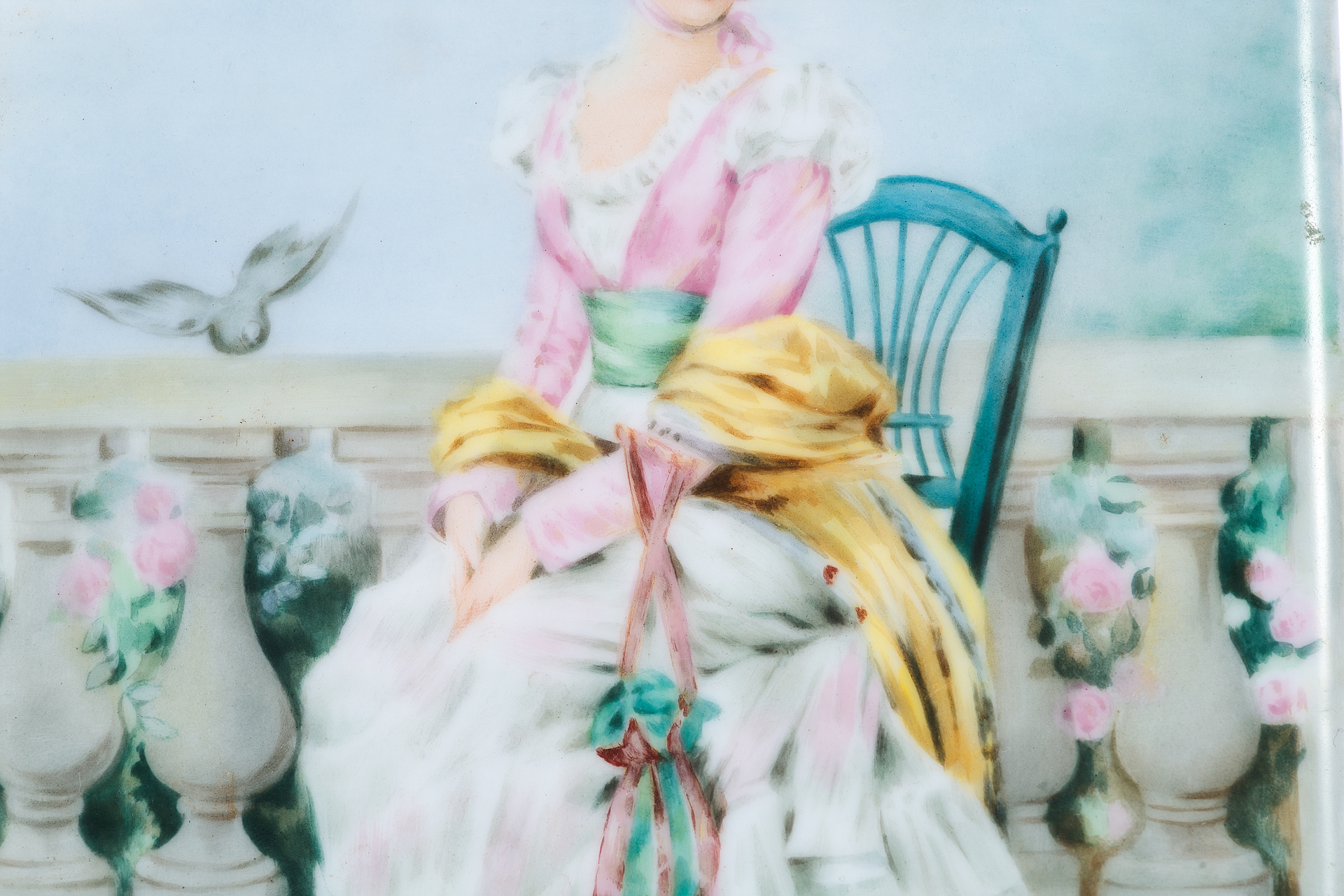 Фарфоровая плакетка «Дама у балюстрады» представляет собой изящный образец декоративного фарфора конца XIX века, выполненный в Германии, предположительно в Дрездене, где в этот период активно развивалась традиция росписных фарфоровых панно, вдохновлённых эстетикой академической и салонной живописи.