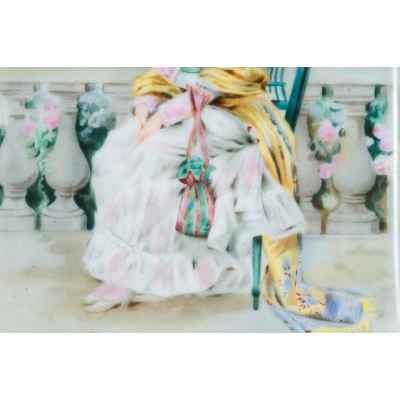 Плакетка изготовлена из фарфора в технике литья, с последующей ручной росписью. Сюжет изображения — сидящая у садовой балюстрады дама в наряде, соответствующем моде 1880-х годов. Её платье, выполненное в мягких пастельных тонах, подчёркнуто утончёнными складками и цветовой градацией. Особое внимание уделено аксессуарам: декоративной сумочке в стиле Марии-Антуанетты, зонту, лентам и шляпке с перьями. Фон с колоннами и цветущими розами придаёт сцене легкий романтический оттенок. Размер изделия — 18,7 × 13,5 см.
