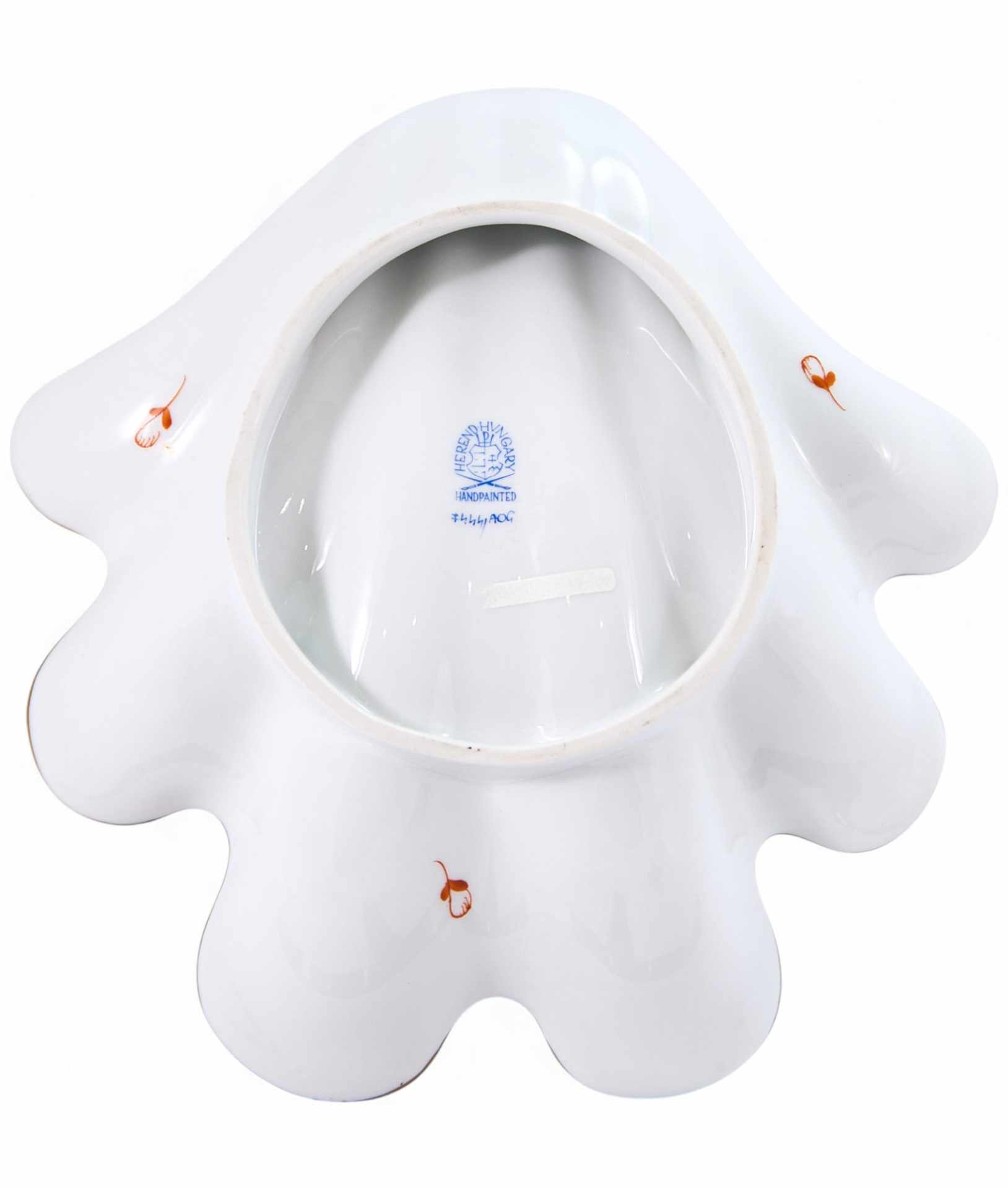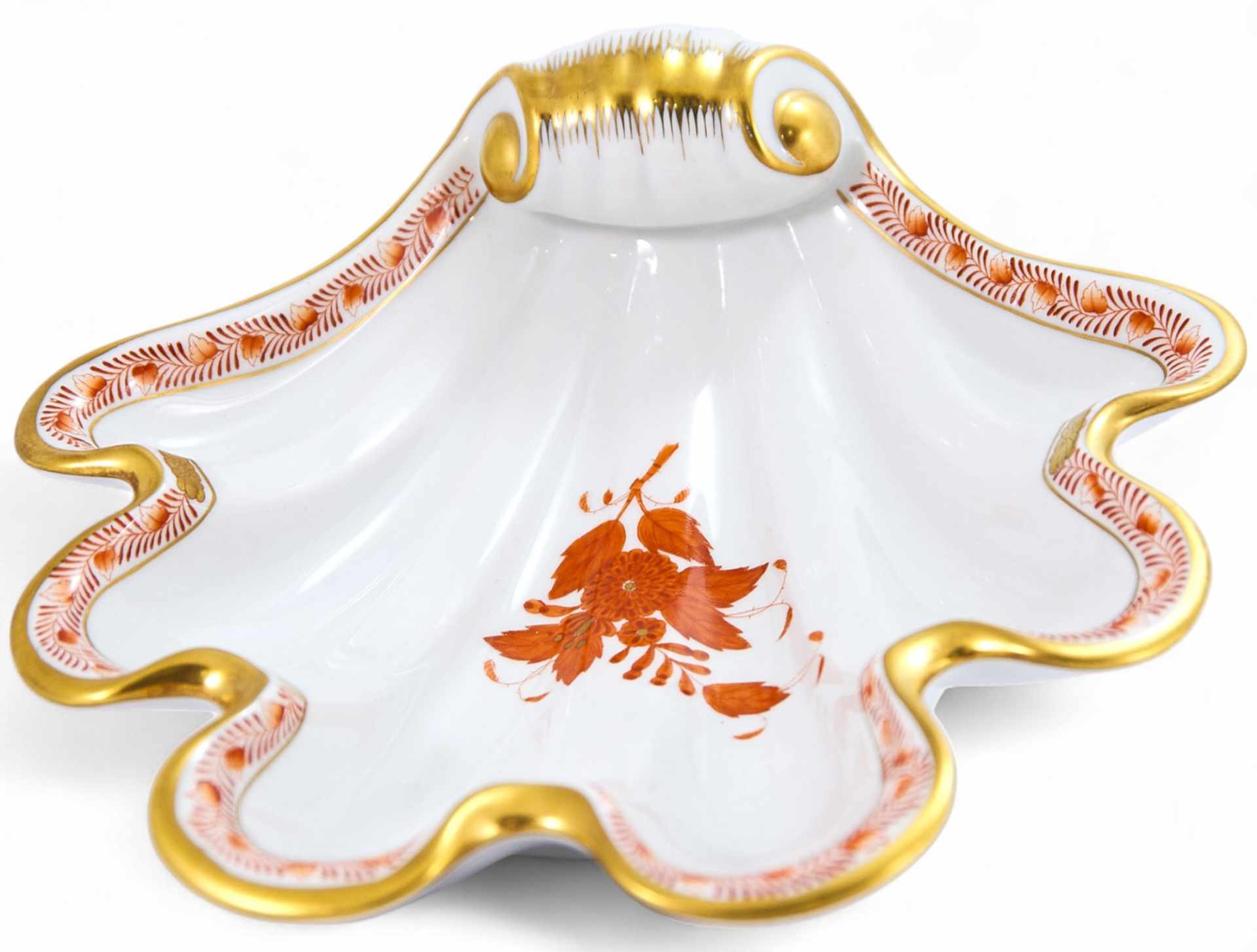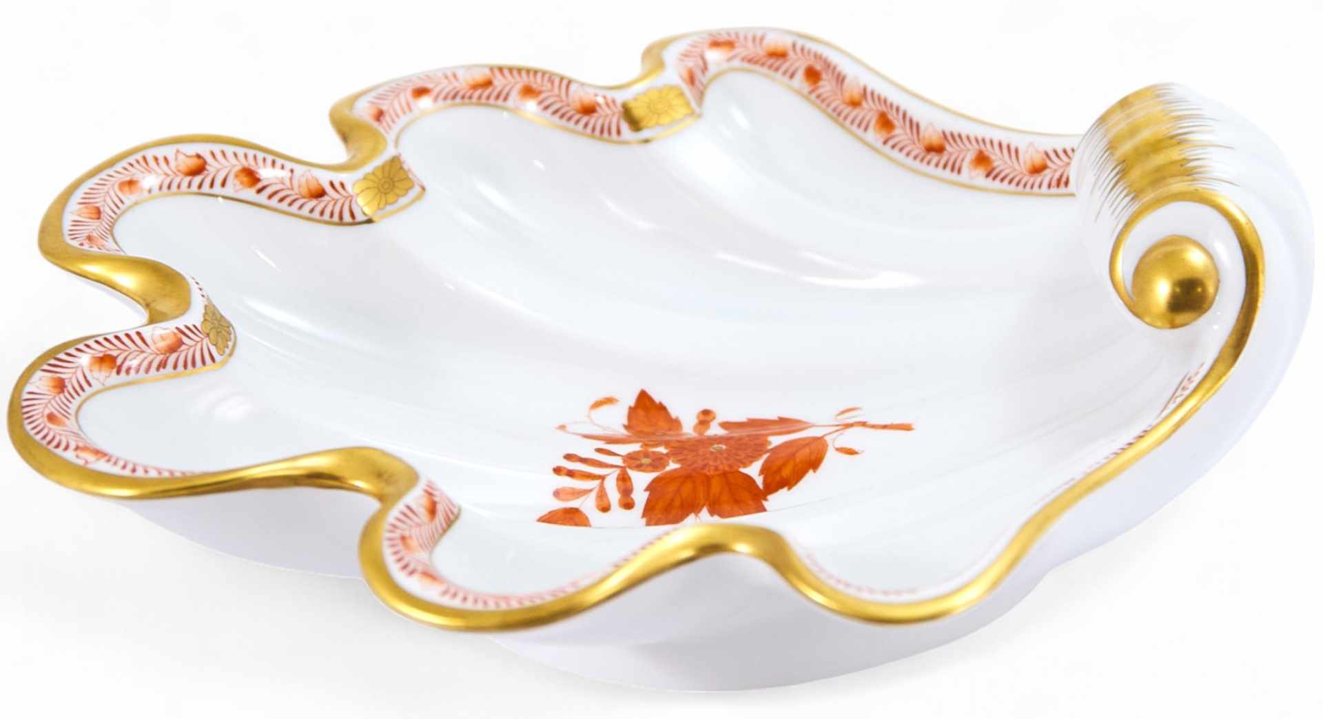 Большая ваза в форме морской раковины. Она украшена популярным в производстве столовой посуды декором «Apponyi Vert», применявшимся на мануфактуре «Херенд» (Herend). На основании производственный номер и клеймо фарфоровой мануфактуры Херенд (Herend) 1960-х - 1986 годов.Фарфоровая фабрика Херенд (Венгрия) В 1826 году, в небольшой деревушке Херенд (Herend), расположенной на склоне горы, открылась мастерская, выпускавшая керамические изделия. В 1839 году владельцем мастерской стал Мор Фишер (Mór Fischer), и это стало началом нового периода в развитии будущей фабрики. Фишер взял огромные ссуды на развитие фарфорового производства, первый коммерческий успех пришел довольно быстро. Заказчиками завода "Herend" стали венгерские аристократы, появились заказы на сервизы. В этот момент и