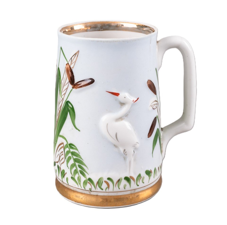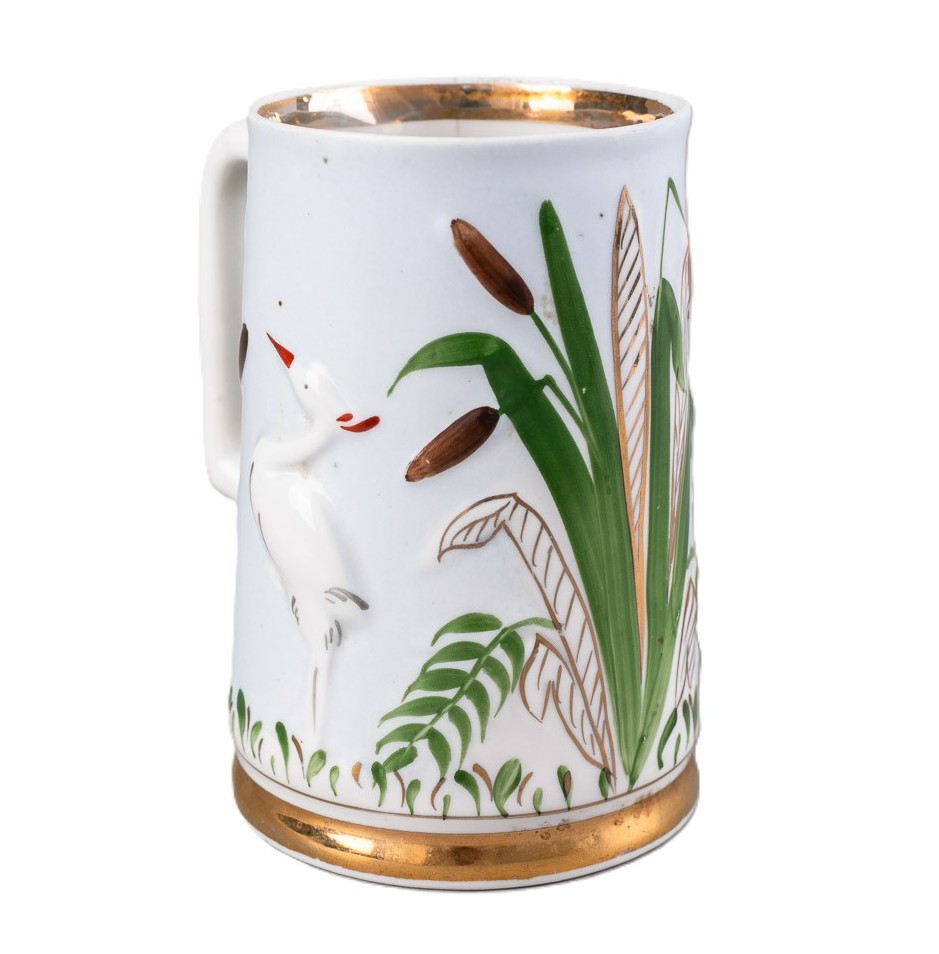 Кружка цилиндрической формы, дно плоское. Ручка Собразной формы. На тулове на белом фоне рельефное изображение цапли икамышей. Имеется заводское клеймо “СКЗ”. Клеймо подлинное. Форму изделия выполнил. Н.Н. Ширыкалов, роспись З.И. Волкова. Ширыкалов Николай Николаевич родился 10 декабря 1948 года. В 1965 году закончил Сысертское училище №35 по специальности “Каповщик-модельщик”. На заводе проработалдо 2010 года. Волкова Зинаида Ивановна, 1931 года рождения. В 1968 году пришлана завод в живописный цех. Проработала художникомпо фарфору до 1986 года. Н. Ширыкалов автор изделий: кружка “Лось” (1988), кружка-пушка (1984), набор для специй “Курица-наседка” (1986), масленка “Рыба” (1991).