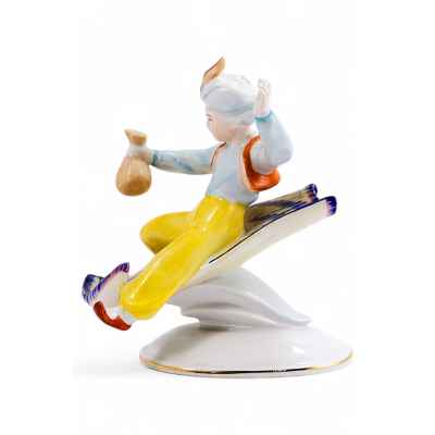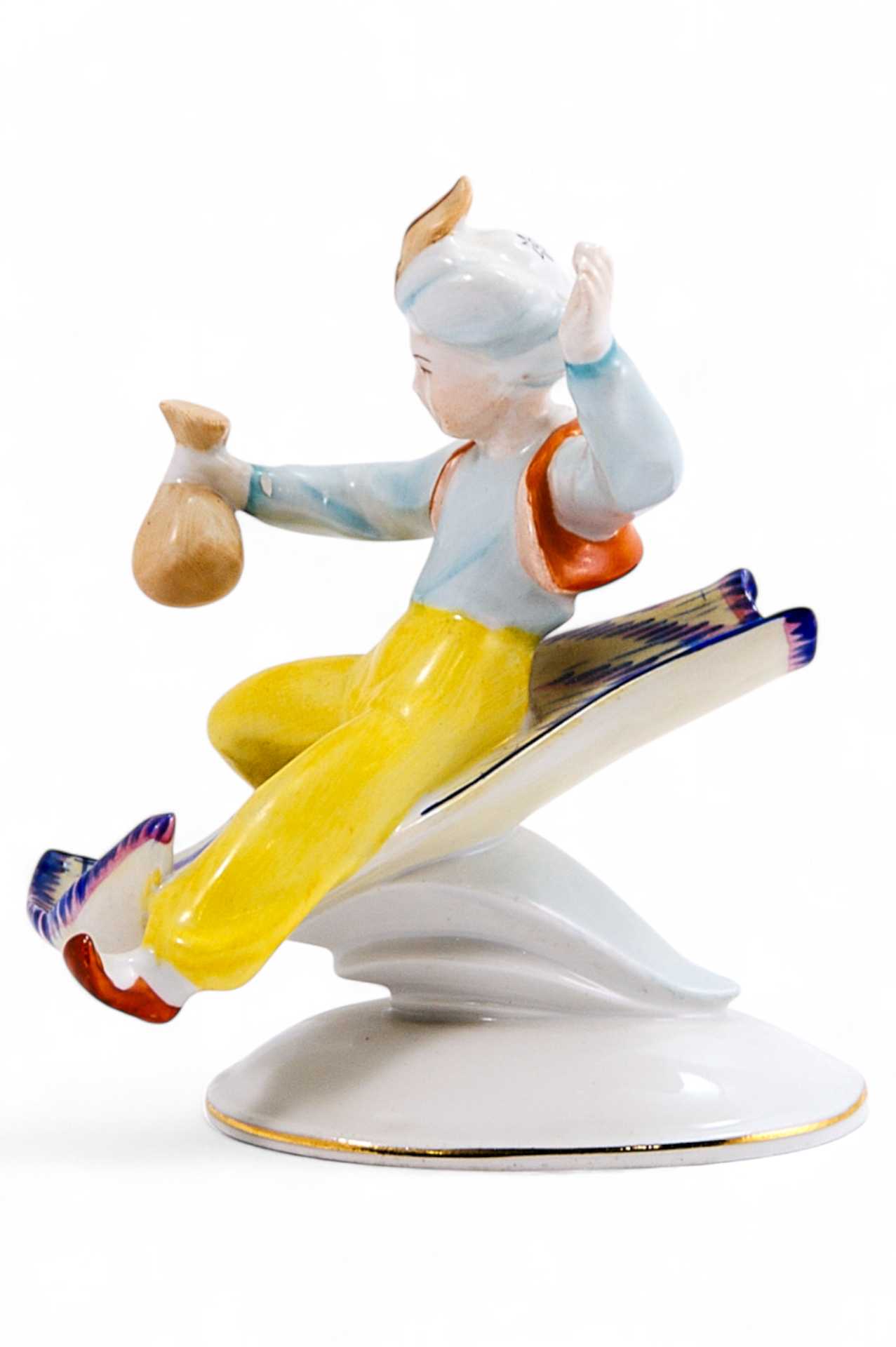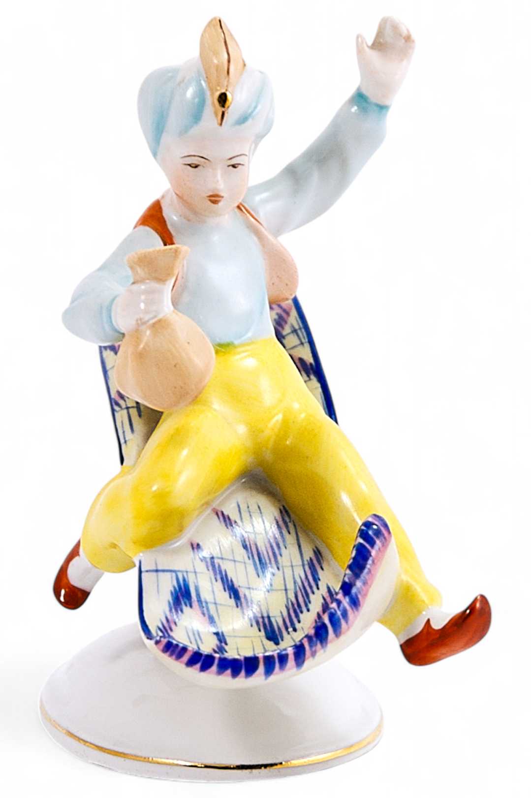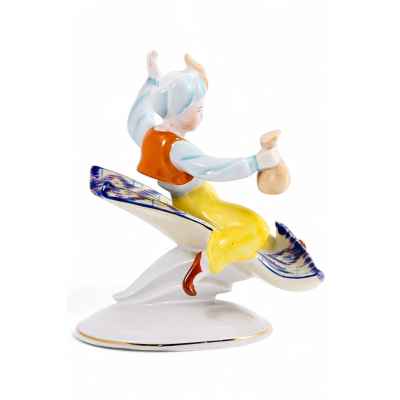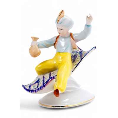 Скульптура персонажа восточных сказок - Аладдина, летящего на ковре-самолете. На основании фигуры клеймо: Hollóháza - фарфоровая фабрика Холлохаза (Венгрия), Handpainted (англ.) - расписано вручную. Данное клеймо ставилось на изделия фабрики преимущественно в 1980-х гг. Холлохаза, (Венгрия) Фарфоровая мануфактура «Холлохази Порцелан» была основана в 1777г. Предприятие по-настоящему развернулось в 1857-ом году, а к концу XIX века мануфактура превратилась завод, где работала значительная часть населения города Холлохаза. Уже в это время изготовленная на заводе продукция стала настоящим шедевром народного искусства. Фигуры и роспись передавались от отцов сыновьям. Завод с большим успехом участвовал на Мировой выставке в Париже. В 1949г. завод был национализирован. В 1972г., после проведения