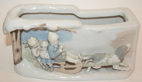 Коллекционная скульптурная подставка для сервировки из нежного легкого фарфора в стилистике винтаж с сюжетом Sleigh Ride «Поездка в санях» - трое детей едут в санях, запряженных лайкой. Роспись в легких пастельных тонах и деликатная