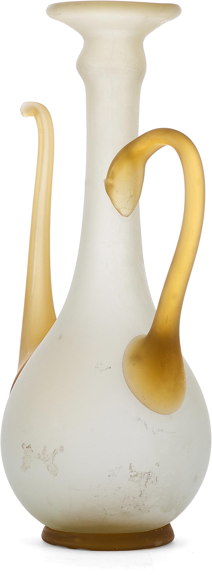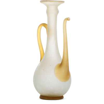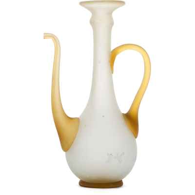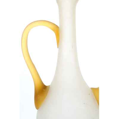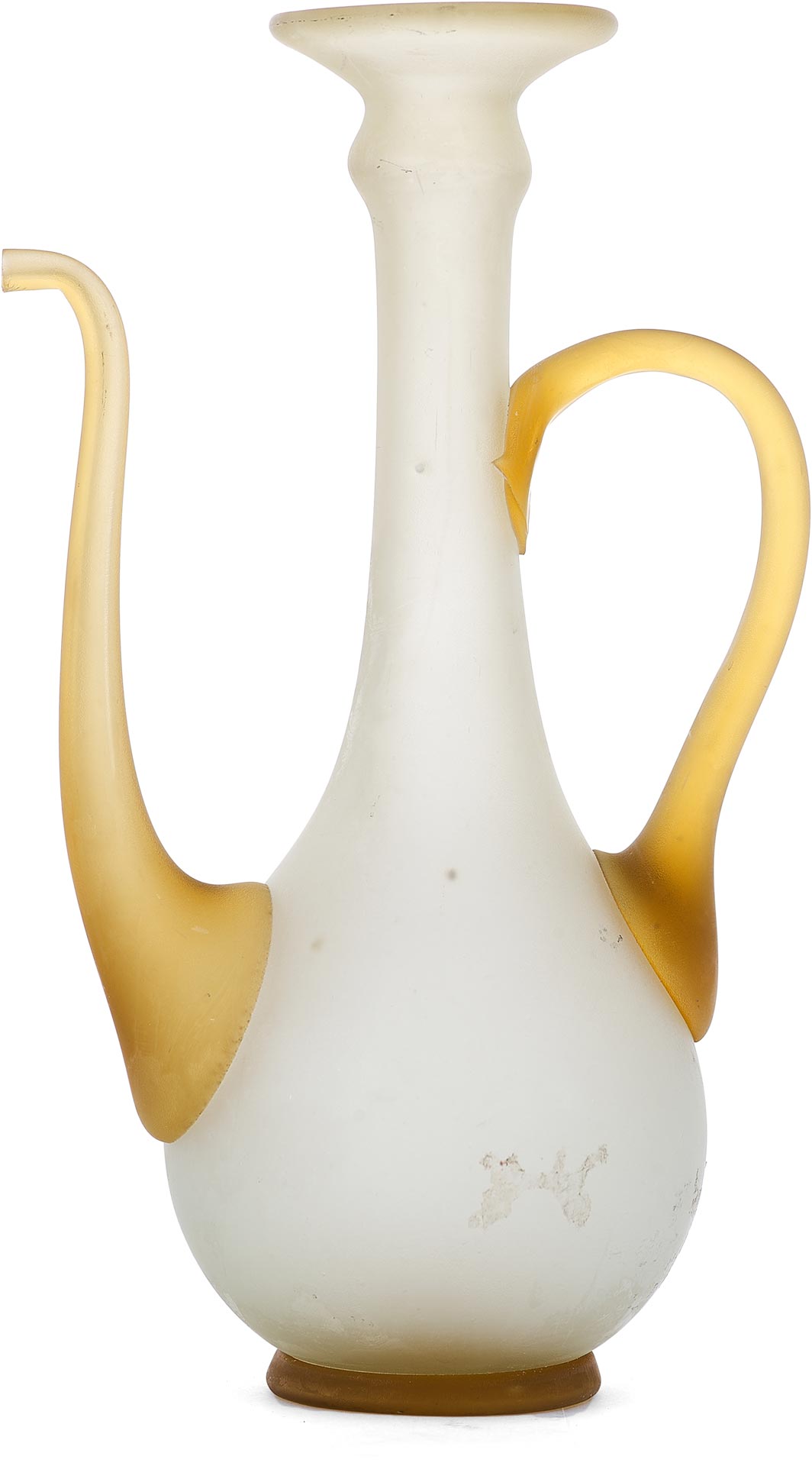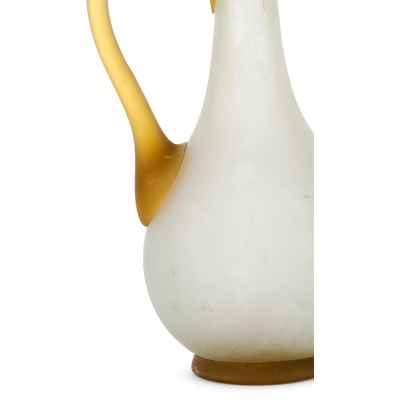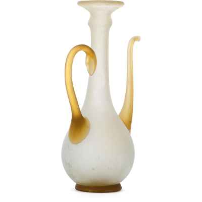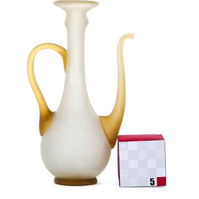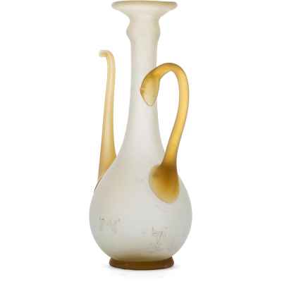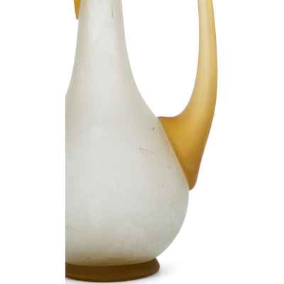 Кувшин, выполненный из цветного стекла с длинным изящным носиком, напоминающим по форме восточный кумган, был изготовлен в Франции в начале XX века. Поверхность стекла матирована, что указывает на использование техники "pâte-de-verre" (стеклянная паста). Эта техника заключается в заполнении формы разноцветной стеклянной крошкой и специальными связующими веществами, которые затем запекаются в печи. Техника была заново открыта Анри Кро, а затем использована мастерами в стиле Ар Нуво.