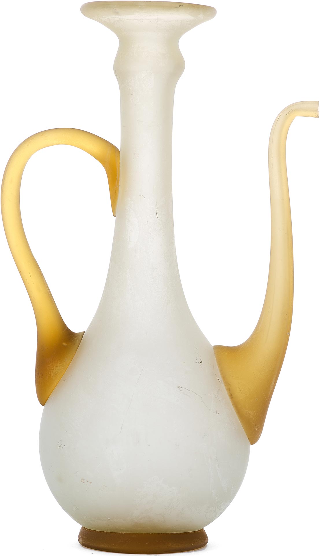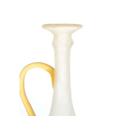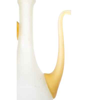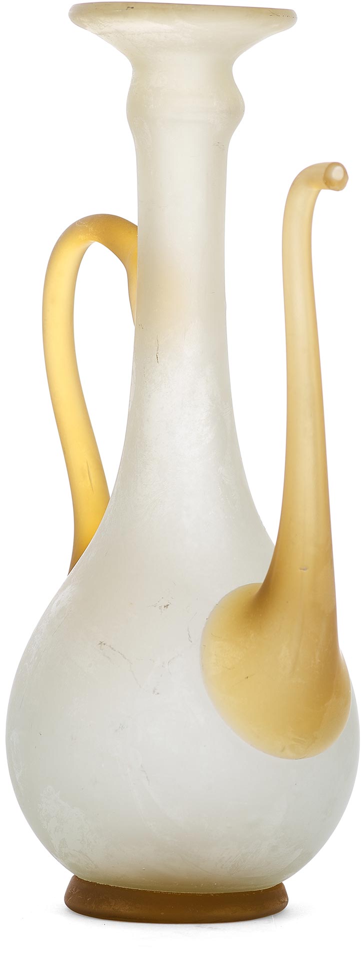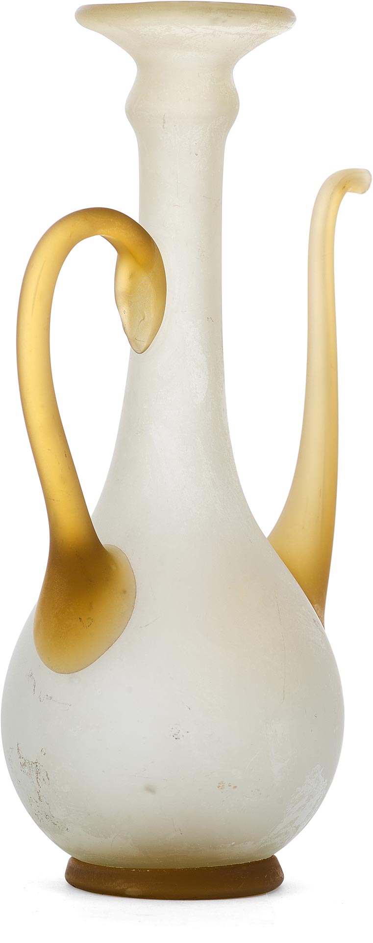 Кувшин, выполненный из цветного стекла с длинным изящным носиком, напоминающим по форме восточный кумган, был изготовлен в Франции в начале XX века. Поверхность стекла матирована, что указывает на использование техники "pâte-de-verre" (стеклянная паста). Эта техника заключается в заполнении формы разноцветной стеклянной крошкой и специальными связующими веществами, которые затем запекаются в печи. Техника была заново открыта Анри Кро, а затем использована мастерами в стиле Ар Нуво.