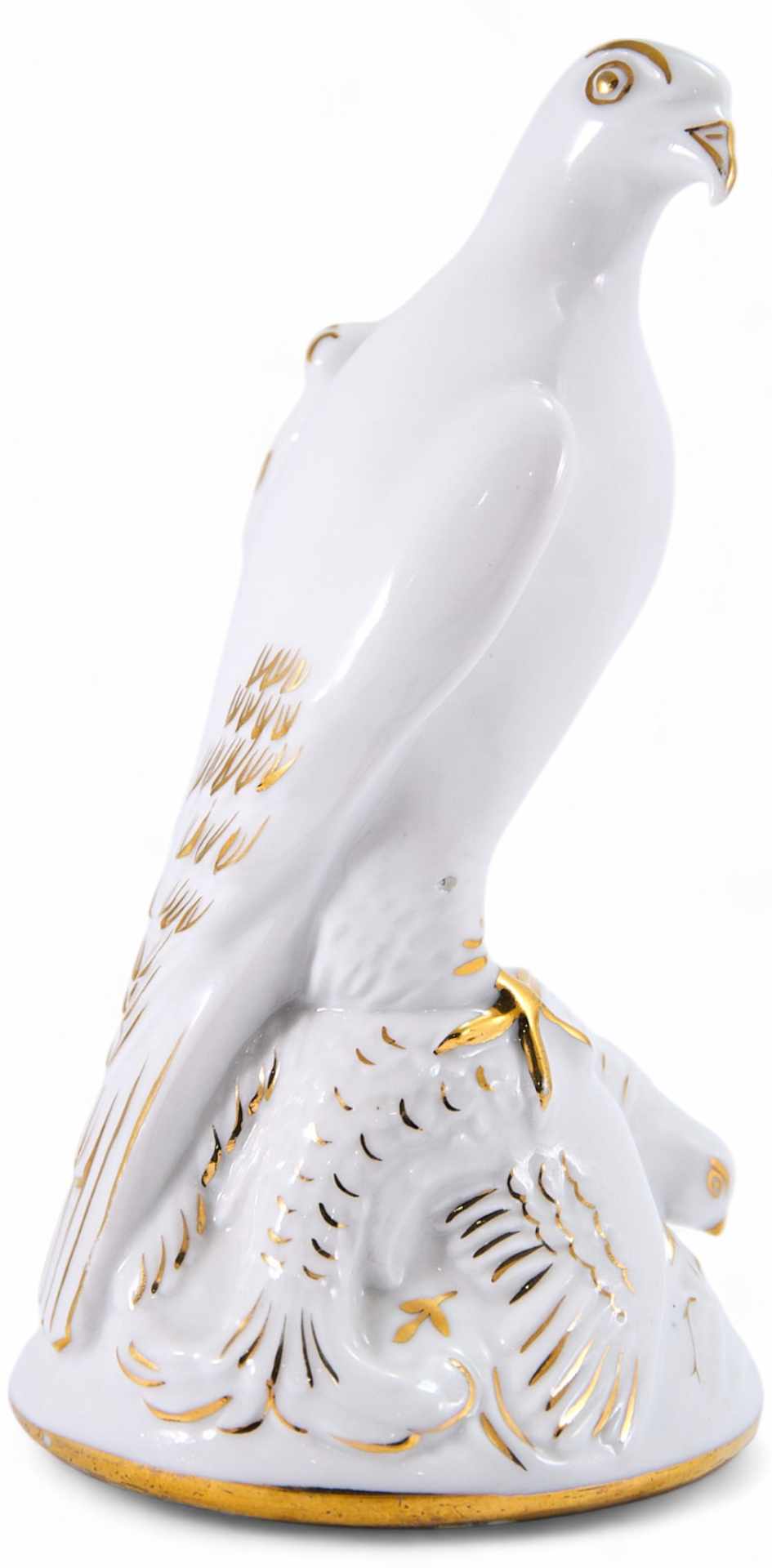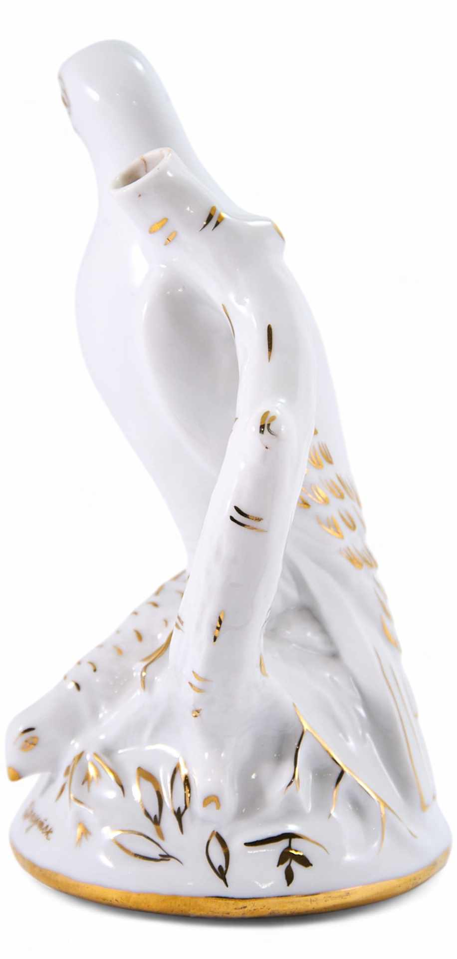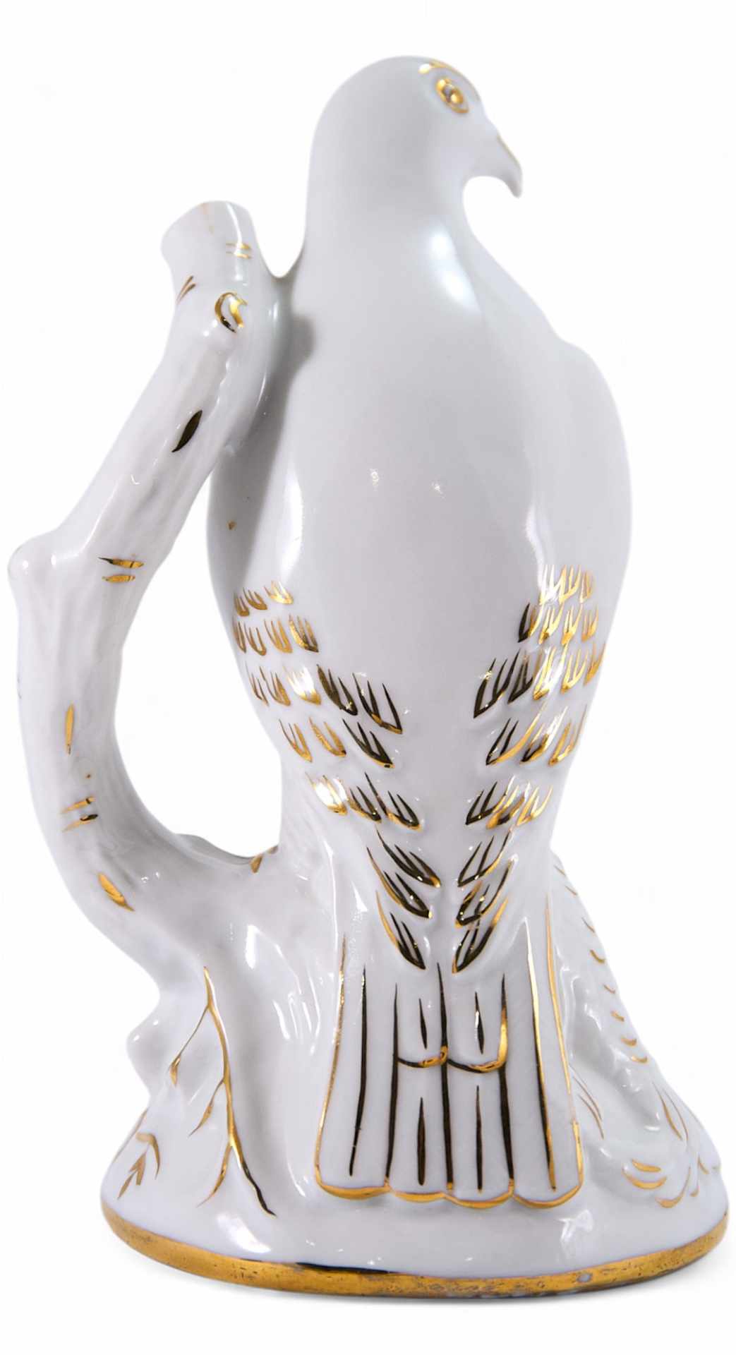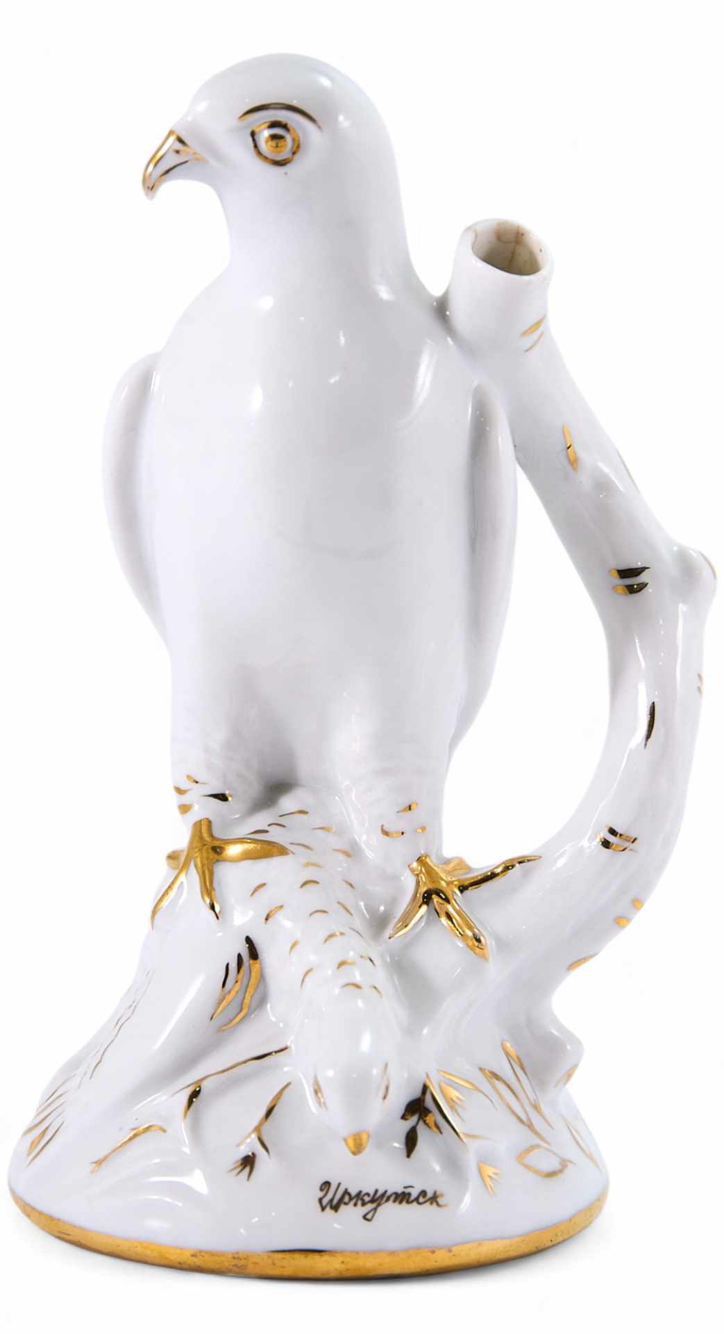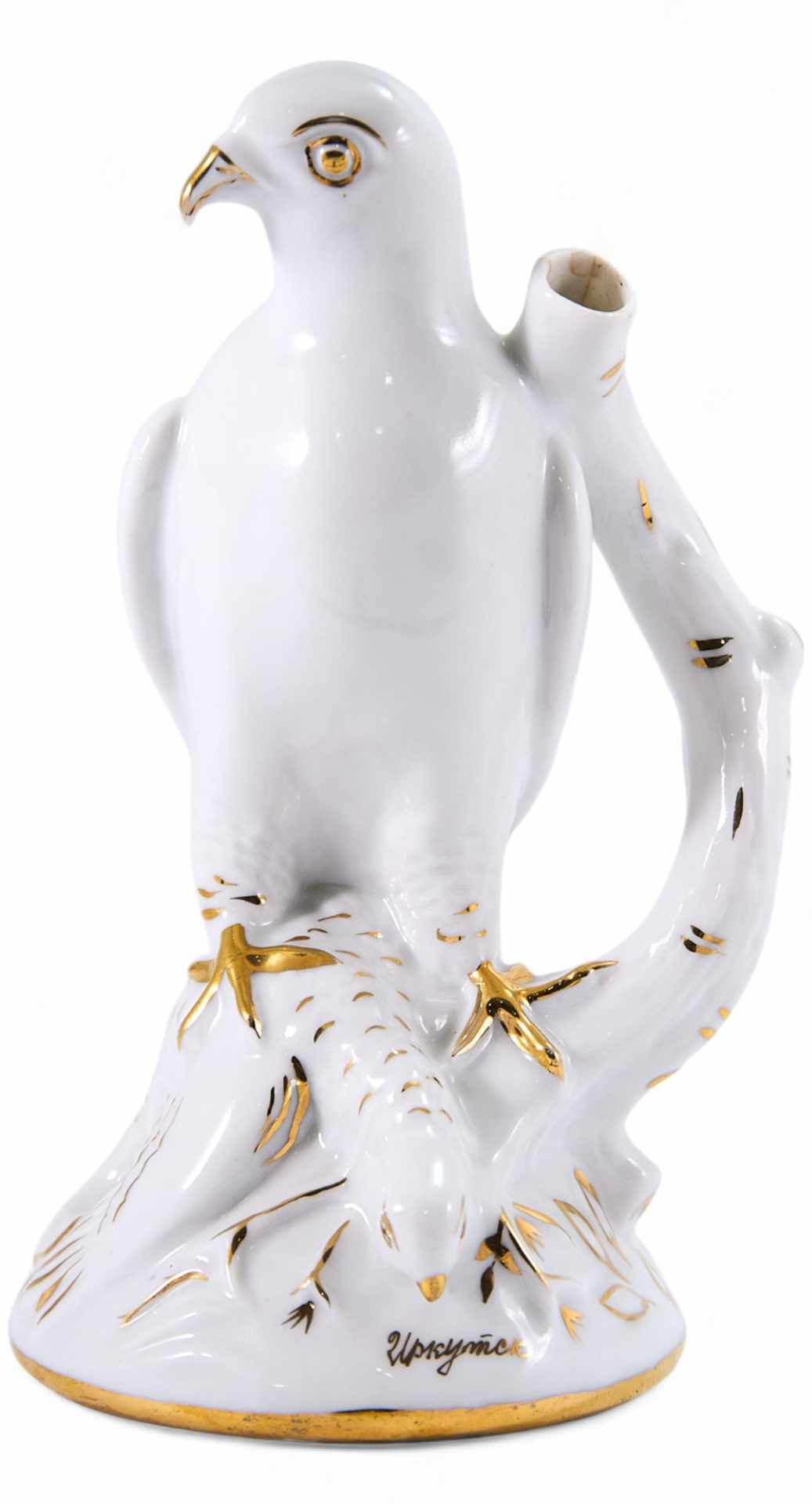 Фарфоровый графин «Сокол» был изготовлен на Хайтинском фарфоровом заводе в г. Иркутск после 1965 года. Он выполнен в виде сокола, сидящего на поверженной птице, а его носик стилизован под березовую ветку. На основании имеется надпись «Иркутск», а на донышке – клеймо «ФХЗ Хайта С-1 19», характерное для продукции завода в этот период.
