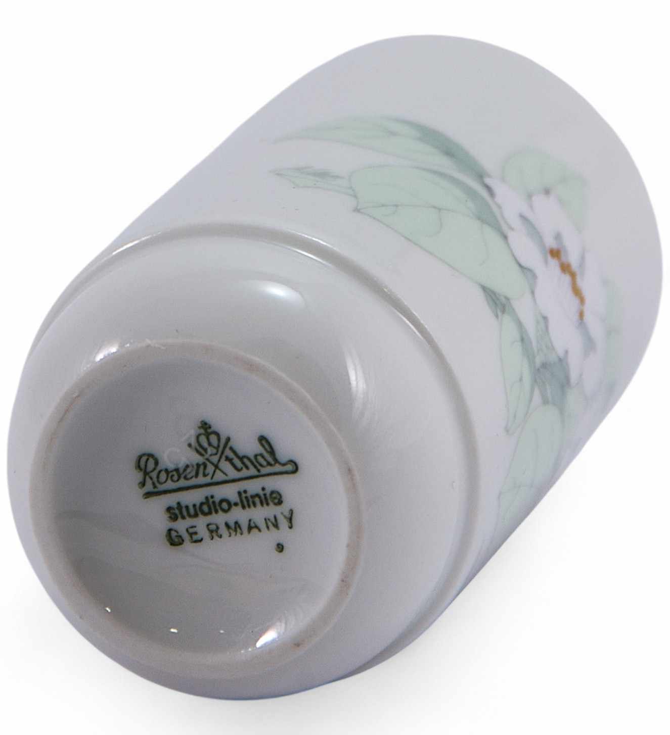 Фарфоровая ваза, на которой изображены белые цветы. На основании клеймо фабрики-изготовителя: «Rosenthal / Studio -