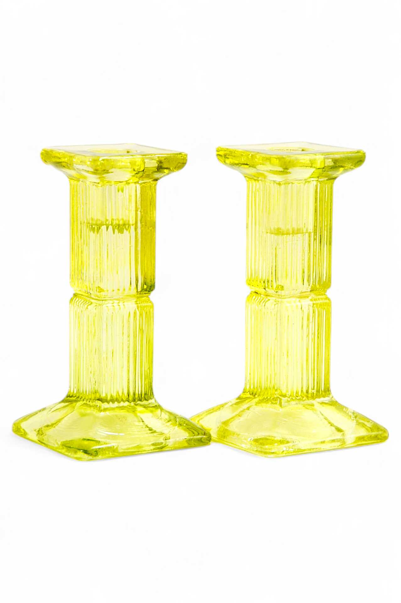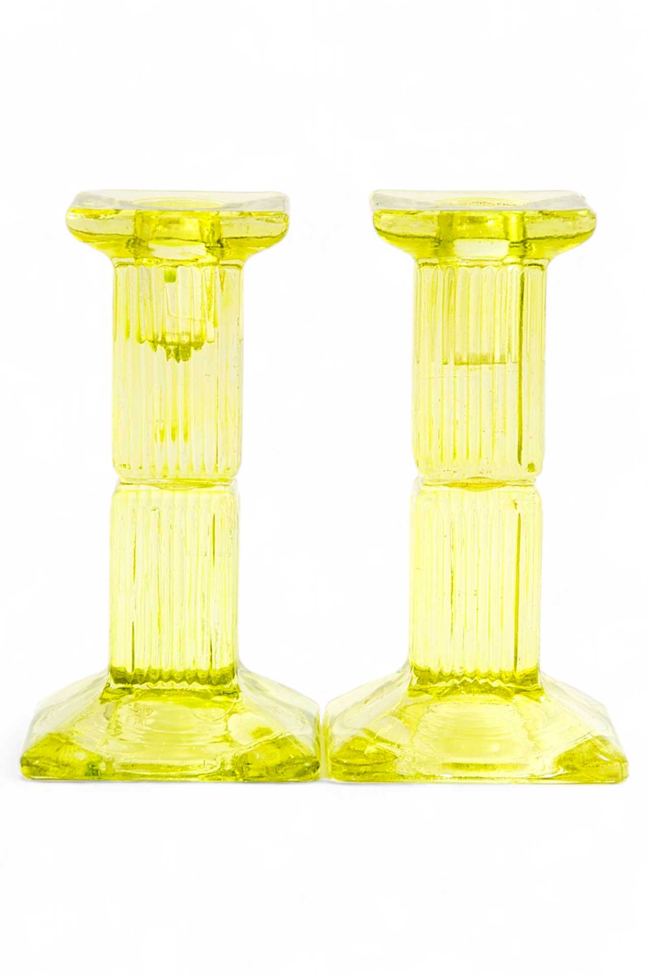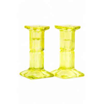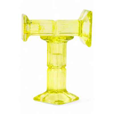 Парные подсвечники, выполненные из прессованного стекла, были изготовлены в Европе в конце XIX — начале XX века. Размер каждого подсвечника составляет 14,2x7,6x7,6 см. Эти подсвечники являются примером раннего прессованного стекла, которое в то время получило широкое распространение, благодаря простоте и эффективности своей формы и производства.