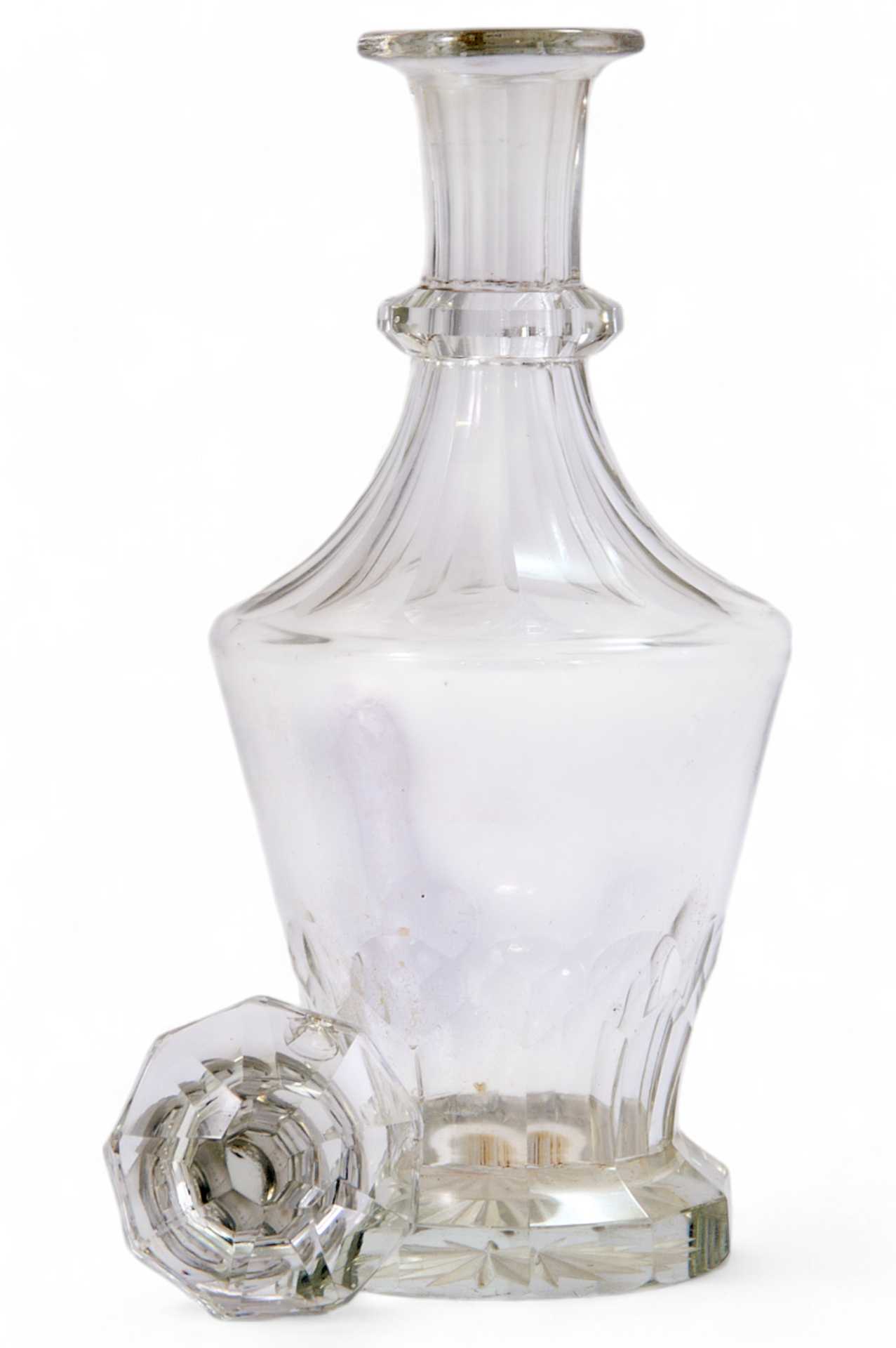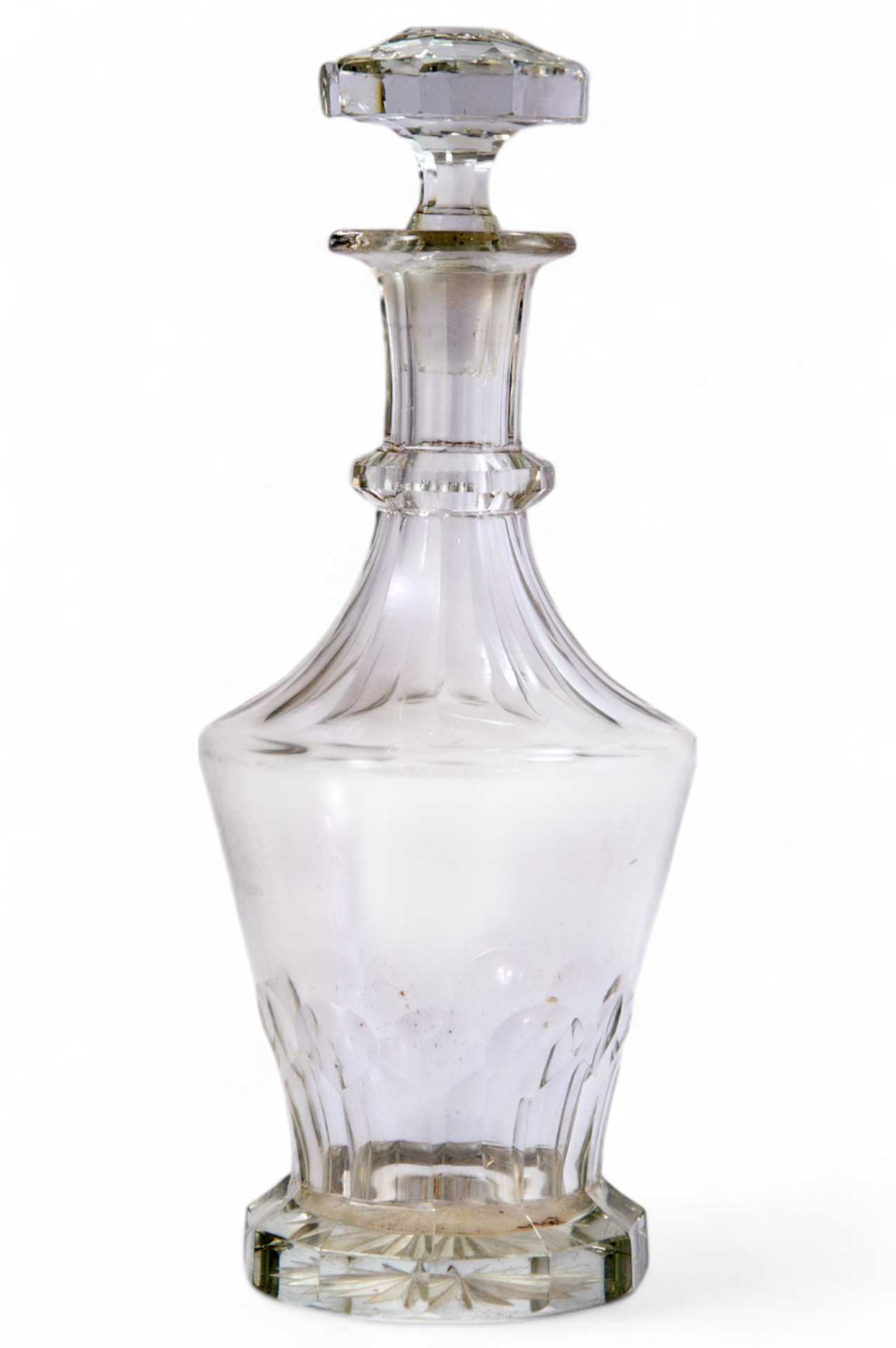 Графин, выполненный из бесцветного стекла, был произведён в конце XIX — начале XX века на фабрике Moser, расположенной в Карловых Варах. Его высота составляет 29,5 см. Графин имеет элегантную форму с конусовидным туловом, которое плавно сужается к узкому горлу. В районе горла находится утолщение в виде кольца. Декорирован фигурными прорезями, открывающими внутренние слои стекла. Основание огранено, что придаёт изделию дополнительную выразительность и блеск. Пробка графина выполнена с гладким и рифлёным краем, с круглой отшлифованной сердцевиной, что завершает его утончённый внешний вид.