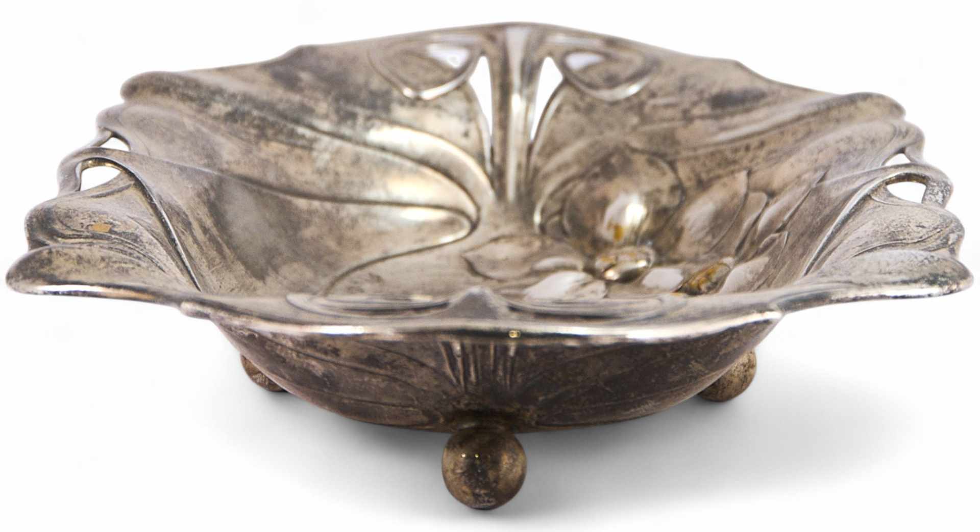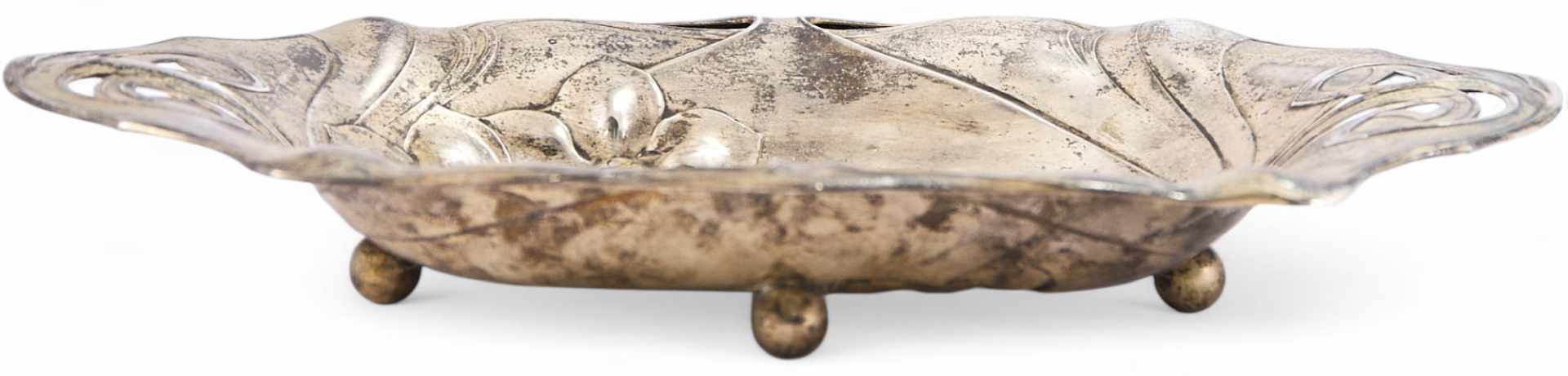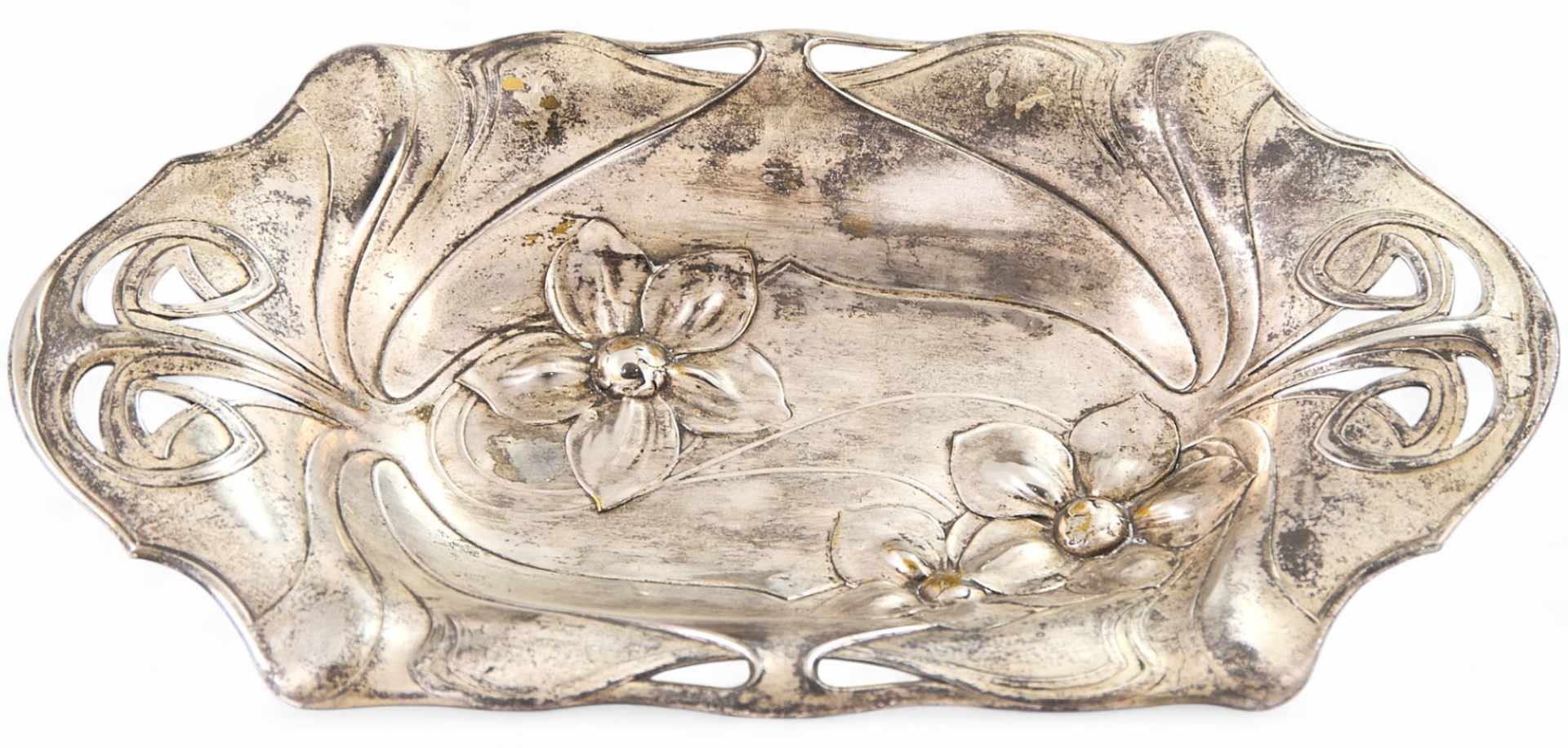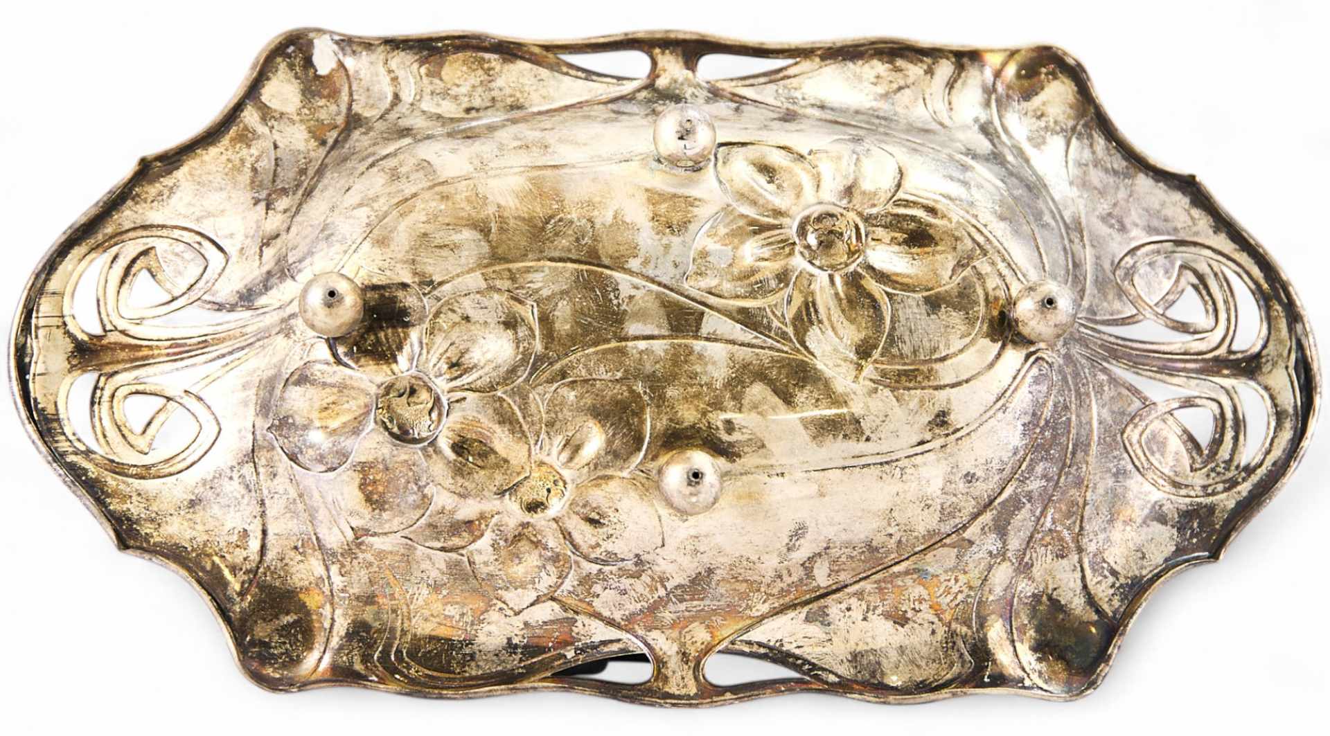 Представленный предмет — сухарница овальной формы, выполненная в стилистике модерна. Фриз фигурный, с декоративными прорезями, симметричный. Блюдо оформлено штампованным рельефом в виде стилизованных растительный