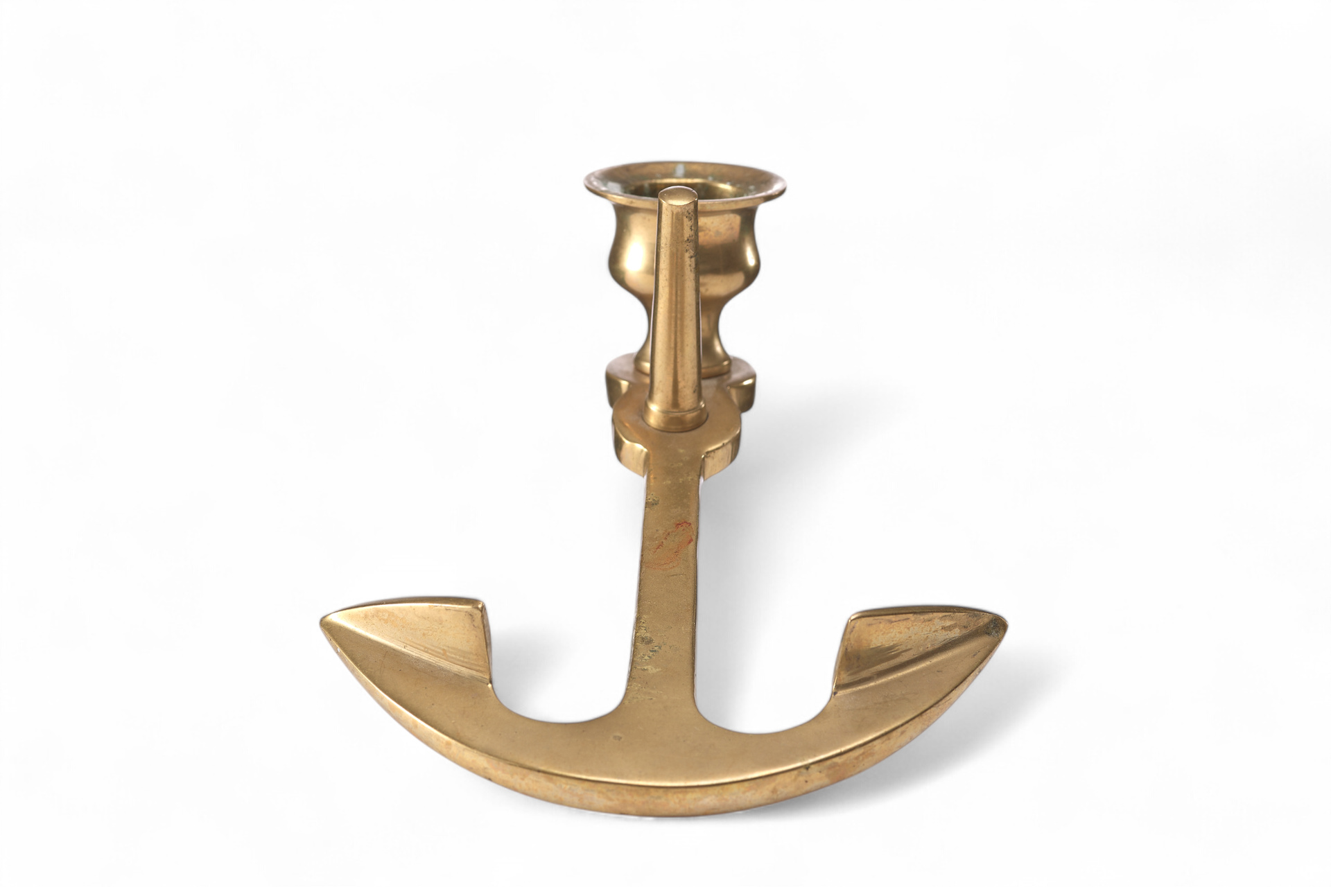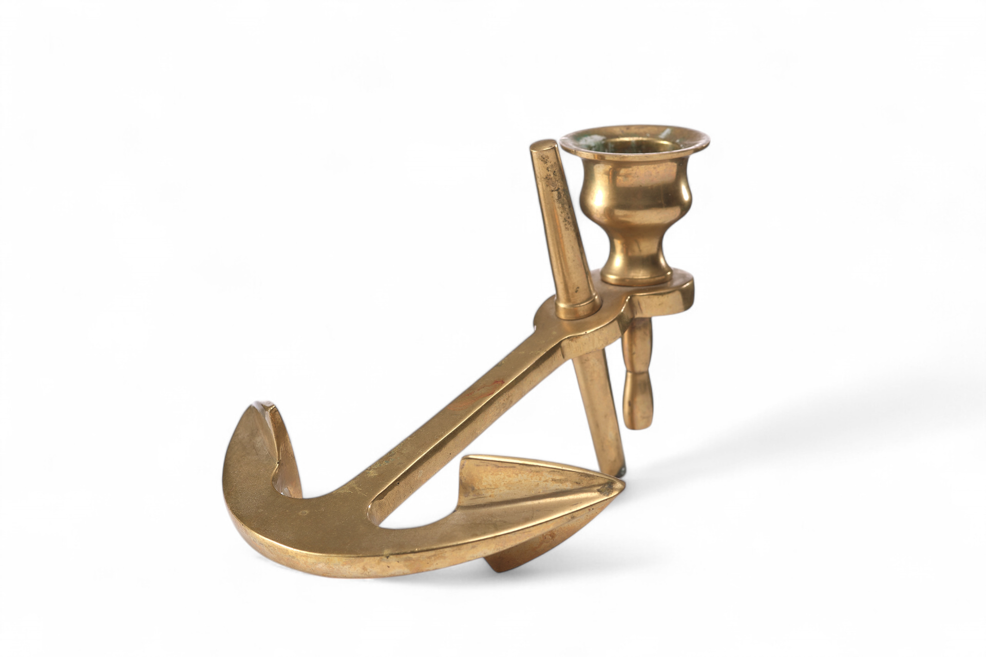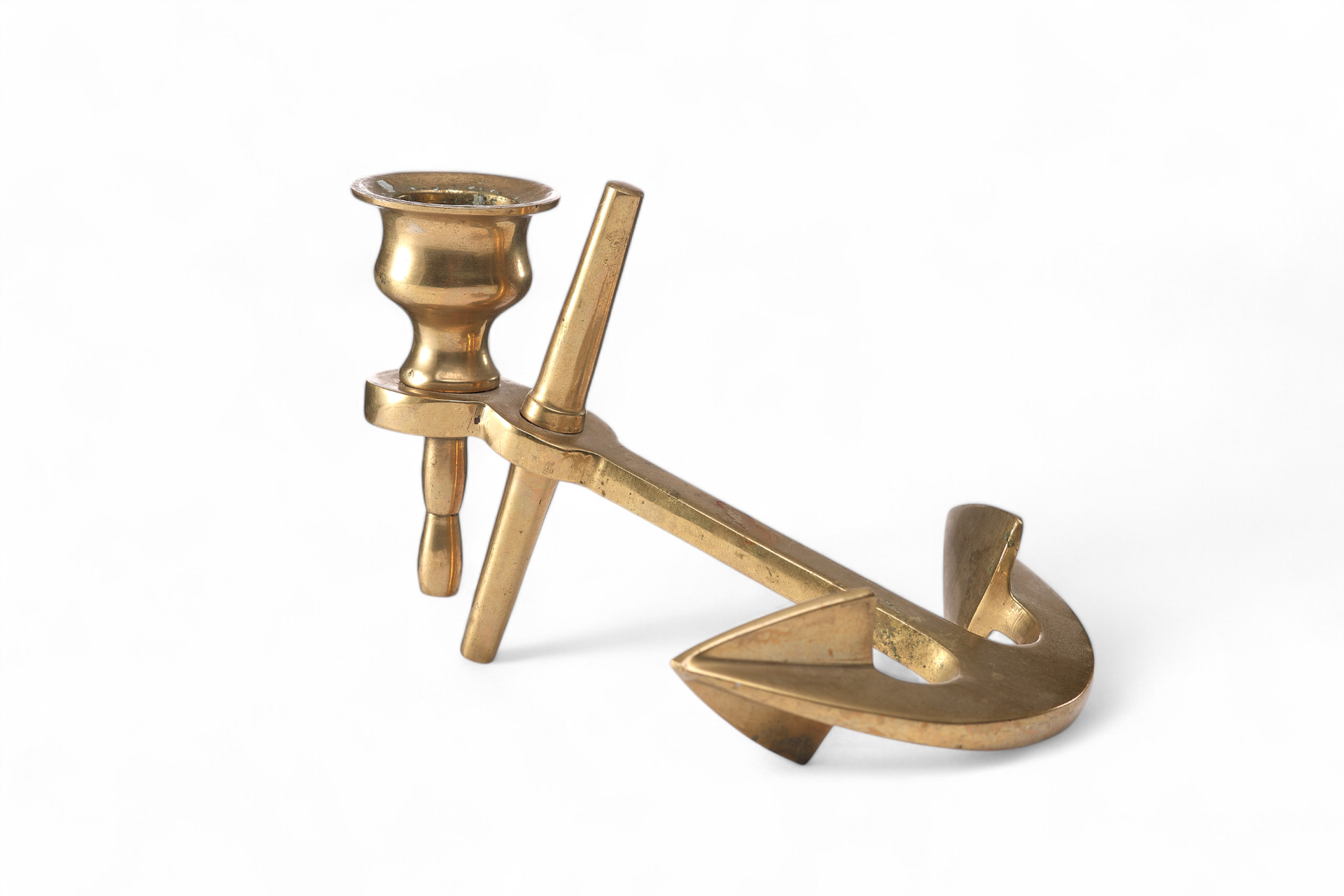 Подсвечник в форме якоря представляет собой выразительный образец европейского декоративного искусства конца XIX — начала XX века. Его форма напрямую отсылает к морской тематике: якорь с характерным штоком, рымом и изогнутыми лапами выполнен с высокой степенью натуралистичности. В верхней части конструкции расположен так называемый свечник или бобешка — небольшая чаша-стакан для установки свечи, традиционно использовавшаяся в западноевропейских бронзовых подсвечниках, начиная с XVIII века.
