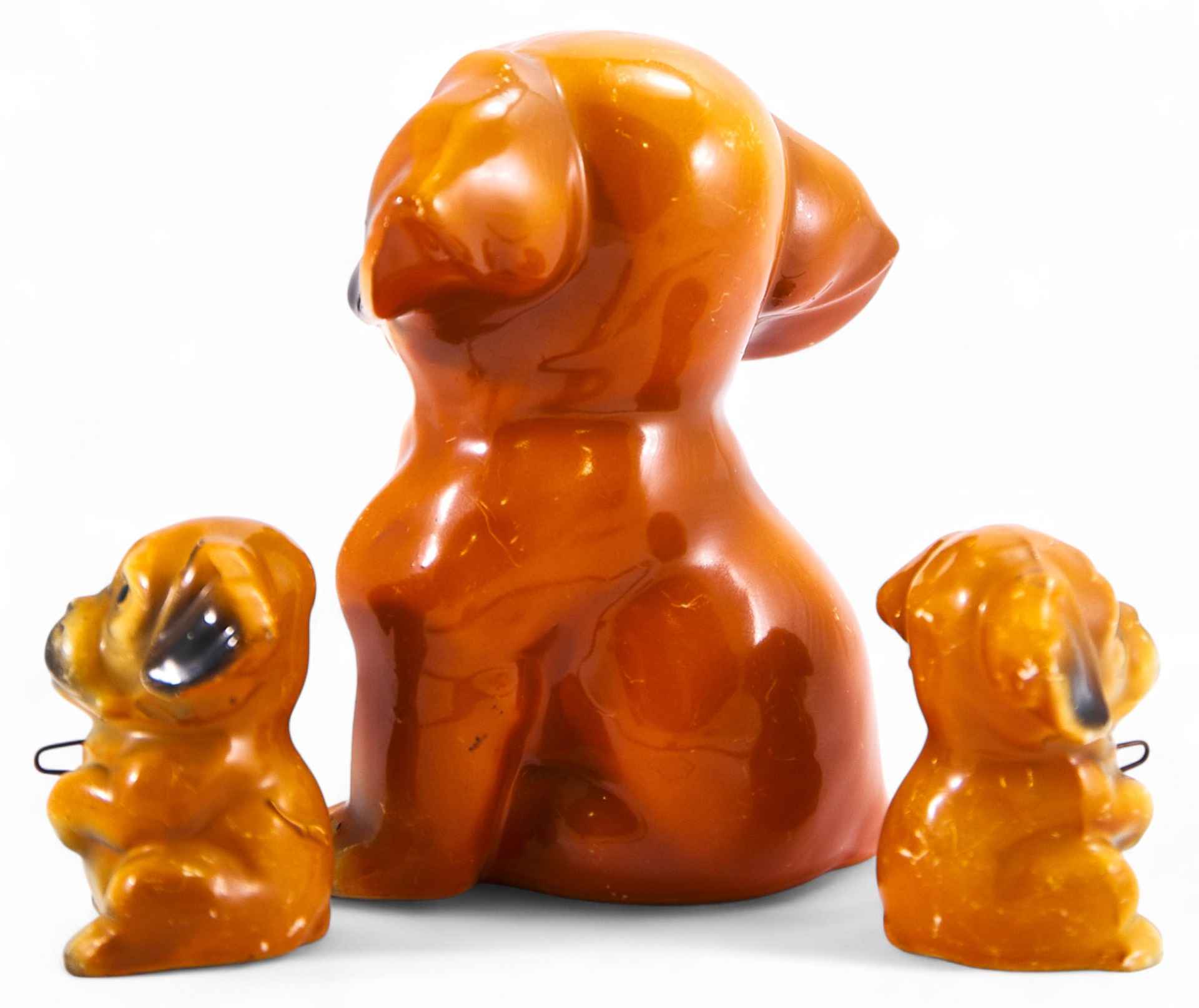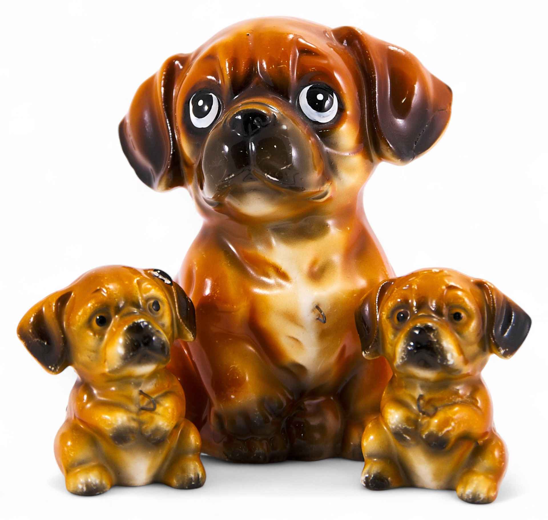 Парные скульптуры-щенков бульдогов. Клейма производителя отсутствуют. Фигуры такого рода в жанре анималистики достоверно, но чаще иронично, характерно выразительно, изображая определенных животных, довольно распространены на европейских «блошиных рынках». В связи с большим производственным тиражом и распространенностью, а также учитывая простоту и непретенциозность художественного исполнения, подобного рода теряют самостоятельное значение, становясь предметом художественного оформления интерьера.