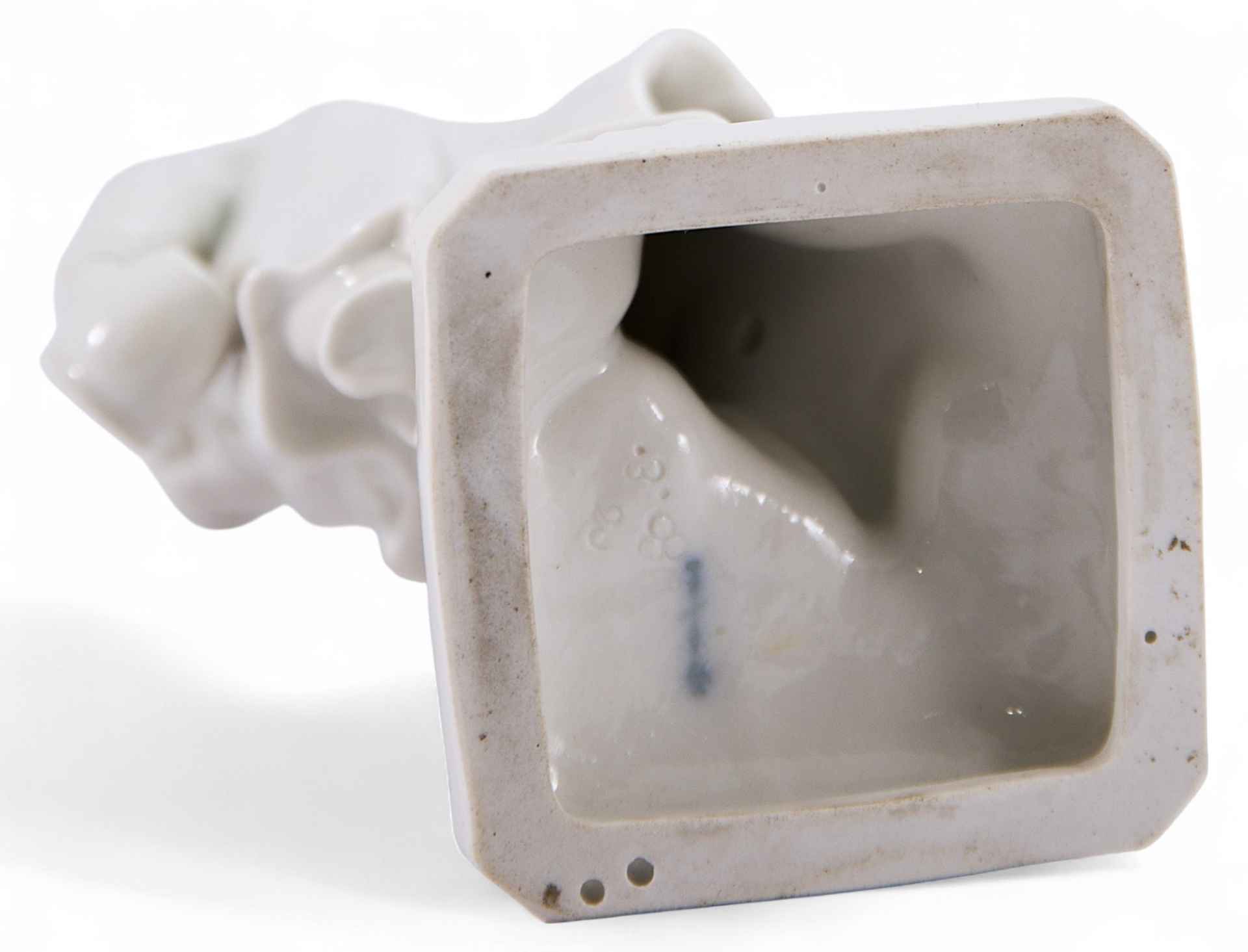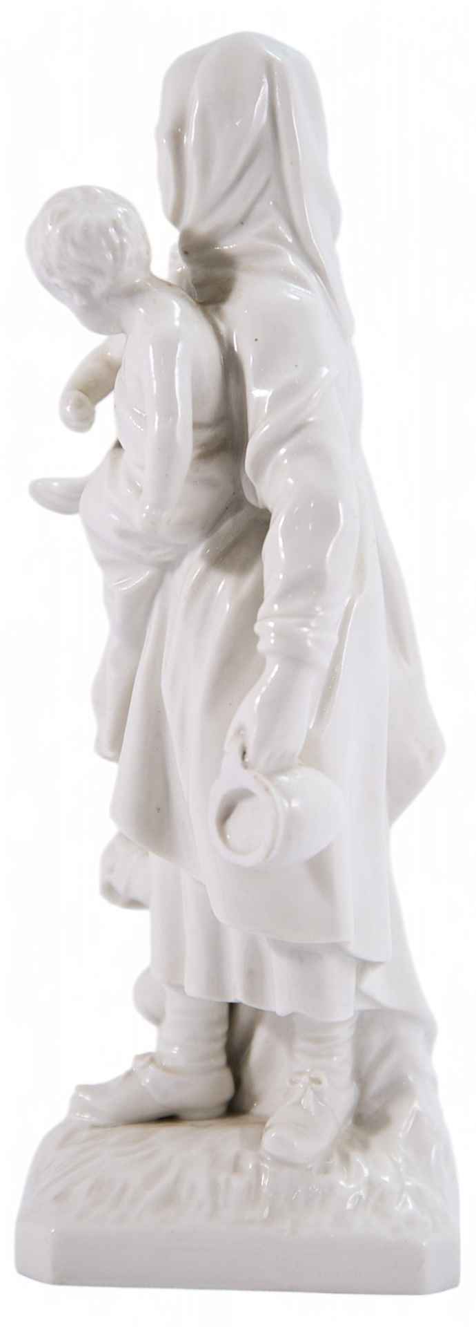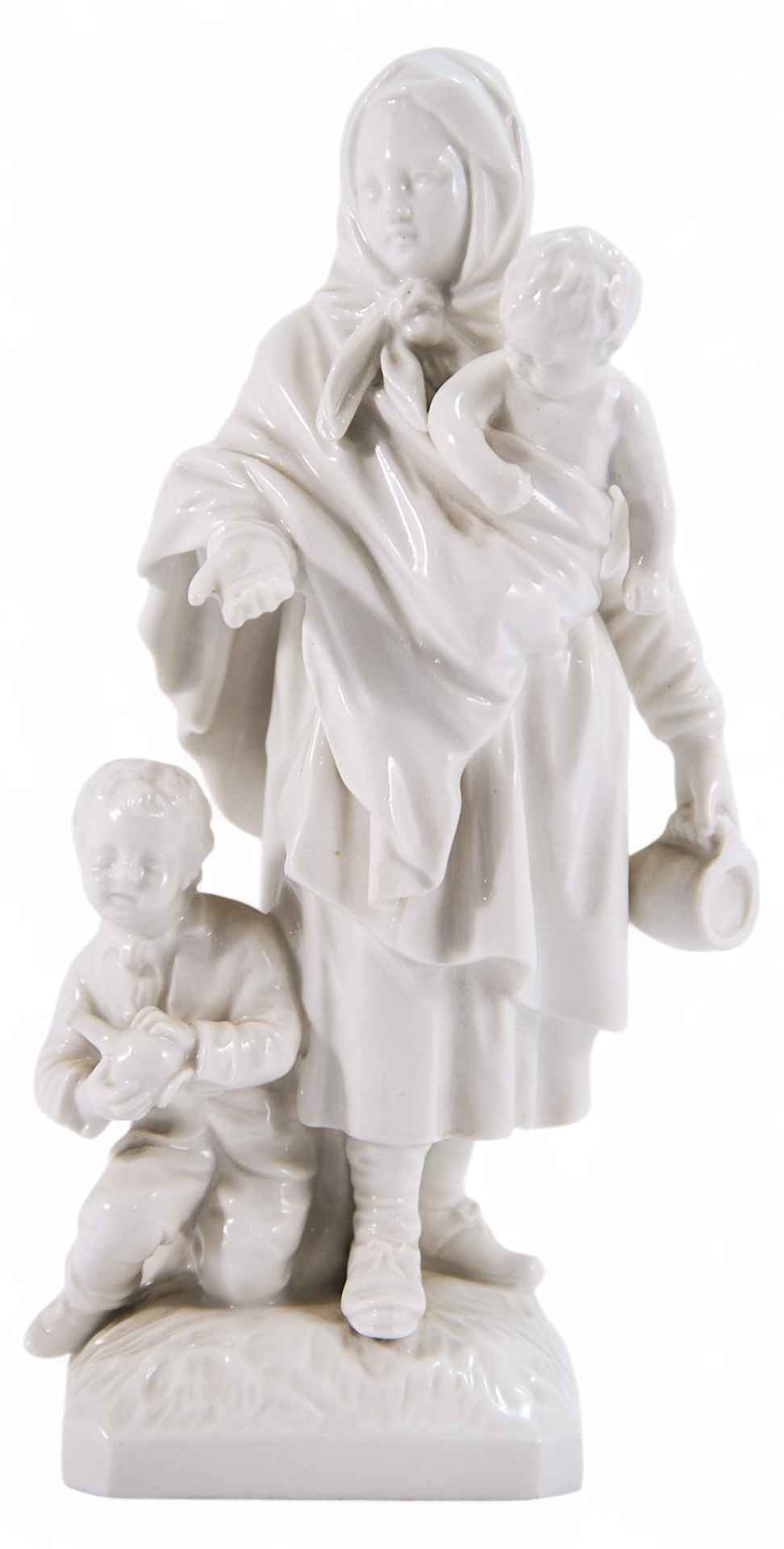 Скульптура нищенки закутанной в платки, просящей со своими детьми милостыню. На основании фигуры подглазурное клеймо Берлинской королевской фарфоровой мануфактуры периода последней четверти ХХв. в виде синего скипетра. Рядом клейма «в тесте». Berlin Royal Porcelain Manufactory Основана в 1761 году промышленником Иоанном Эрнстом Гоцковски. В 1763 году король Фридрих II выкупил фабрику и она стала называться Королевской мануфактурой. По приказанию короля новой маркой фарфоровых изделий мануфактуры стал синий скипетр - деталь герба курфюршества Бранденбург. Мануфактура прославилась столовыми сервизами эпохи прусского рококо. Натуралистическая цветочная роспись сочеталась с золотым и цветным декором. Выпускалась и массовая продукция - столовые и кофейные сервизы, декоративные вазы. В росписи господствовали цветочные мотивы, сцены в духе Буше и Ватто, батальная живопись. Скульптура фабрики не отличалась оригинальностью и легкостью, свойственной Мейсену. Модели ведущего берлинского скульптора Мейера - ремесленники, пастушки, китайцы, выполненные в стиле рококо. В XIX веке продукция фабрики выпускалась также в стиле классицизма и бидермайера.