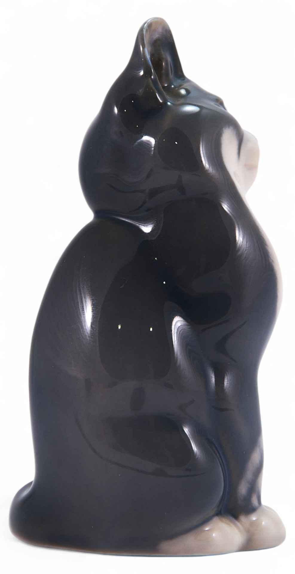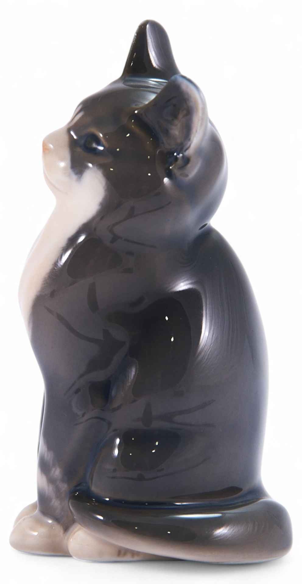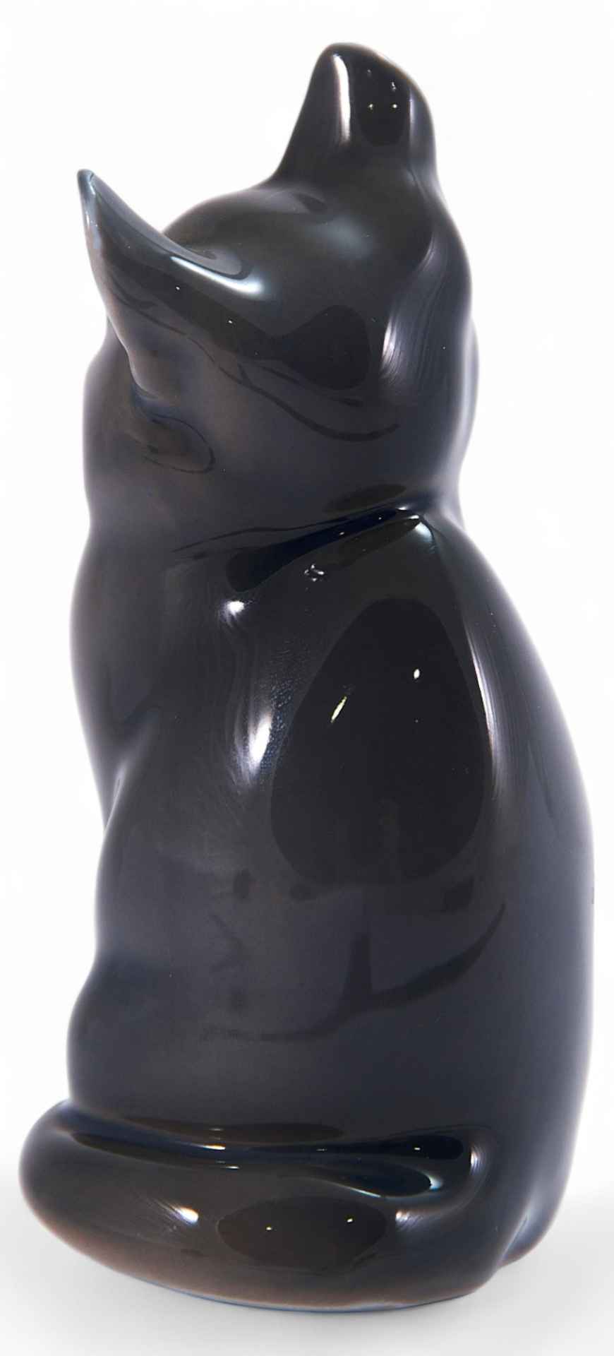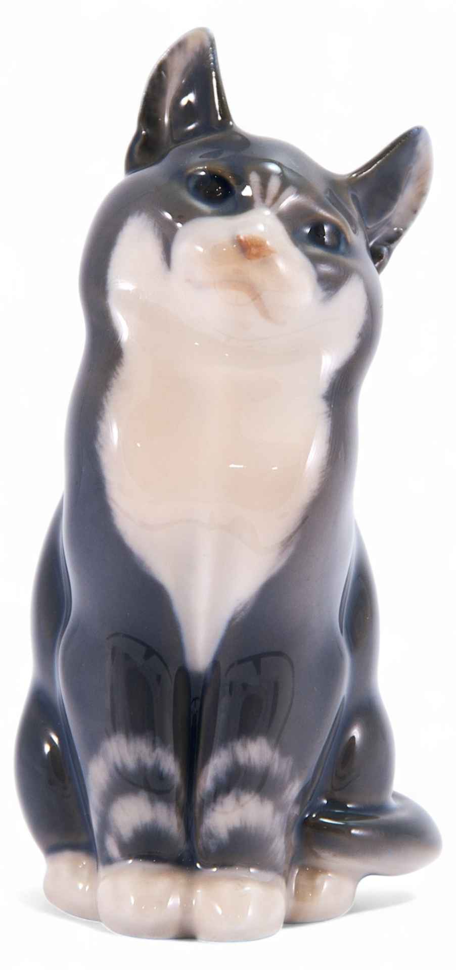 Скульптура сидящей кошки. На основании фигуры клеймо Королевской копенгагенской фарфоровой мануфактуры с указанием датировки. Royal Copenhagen Factory. Основана в 1775 г. Франком Хенриком Мюллером. С конца XIX века выпускался фарфор высокого качества с характерной подглазурной росписью в приглушенной гамме — одно из выдающихся достижений в стиле модерн. Художественный руководитель Королевской фарфоровой мануфактуры Арнольд Эмиль Крог (1856-1931) разработал новый неповторимый художественный стиль, названный по месту его возникновения “копенгагенским”. Этот стиль использовался и мастерами Императорского завода. Для фарфоровых изделий с подглазурной росписью “высокого огня” характерна неяркая, почти монохромная цветовая гамма, подходившая для изображения природы Скандинавии, ее блеклых осенних и зимних пейзажей. В 1900 году на Всемирной выставке в Париже изделия Копенгагенской