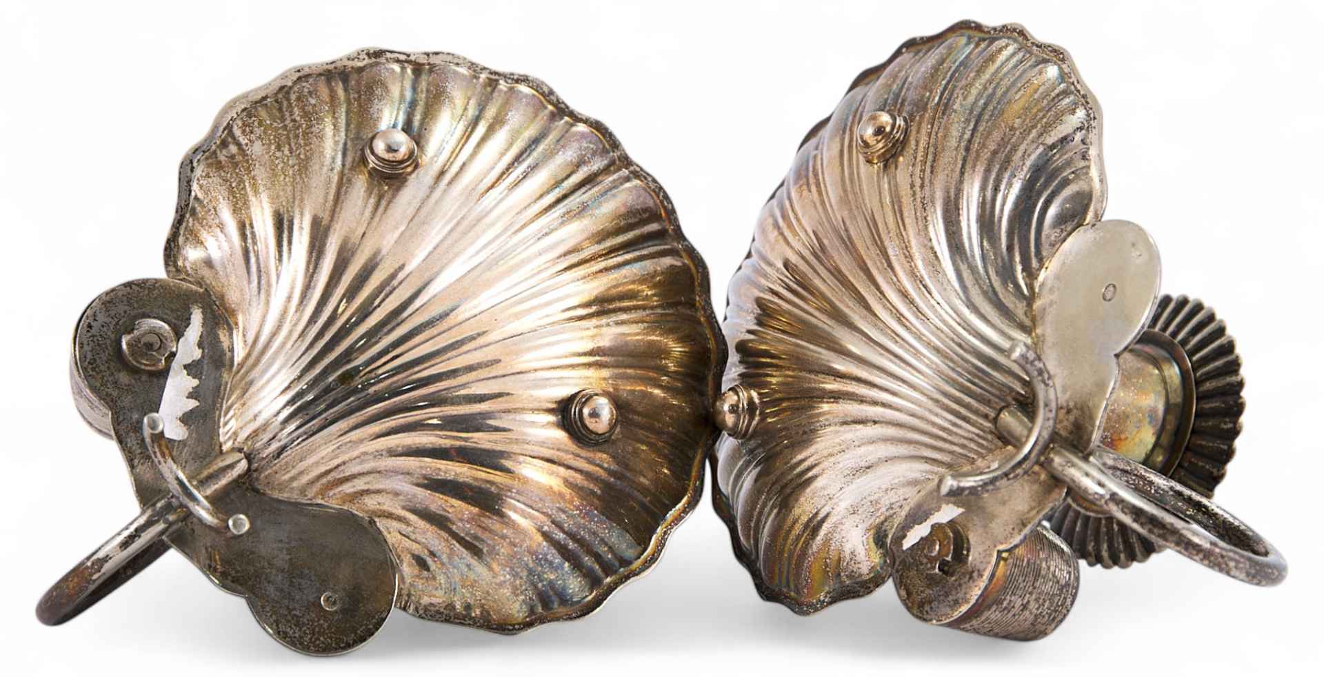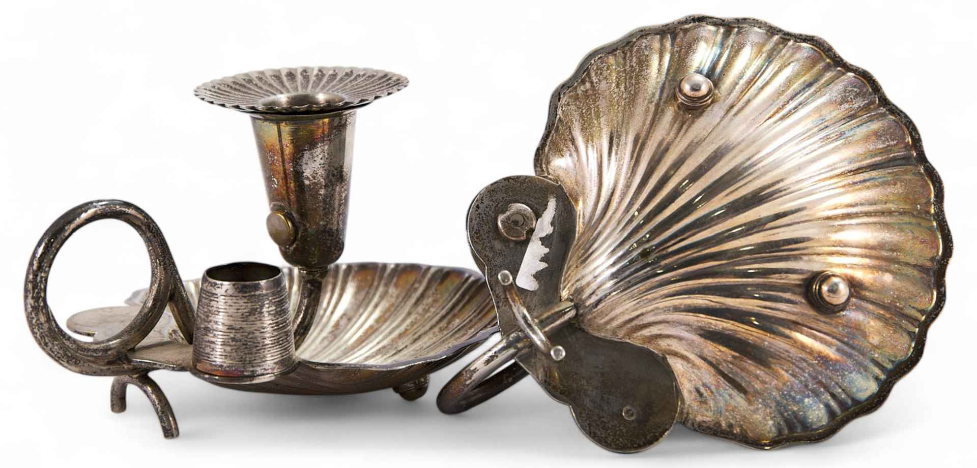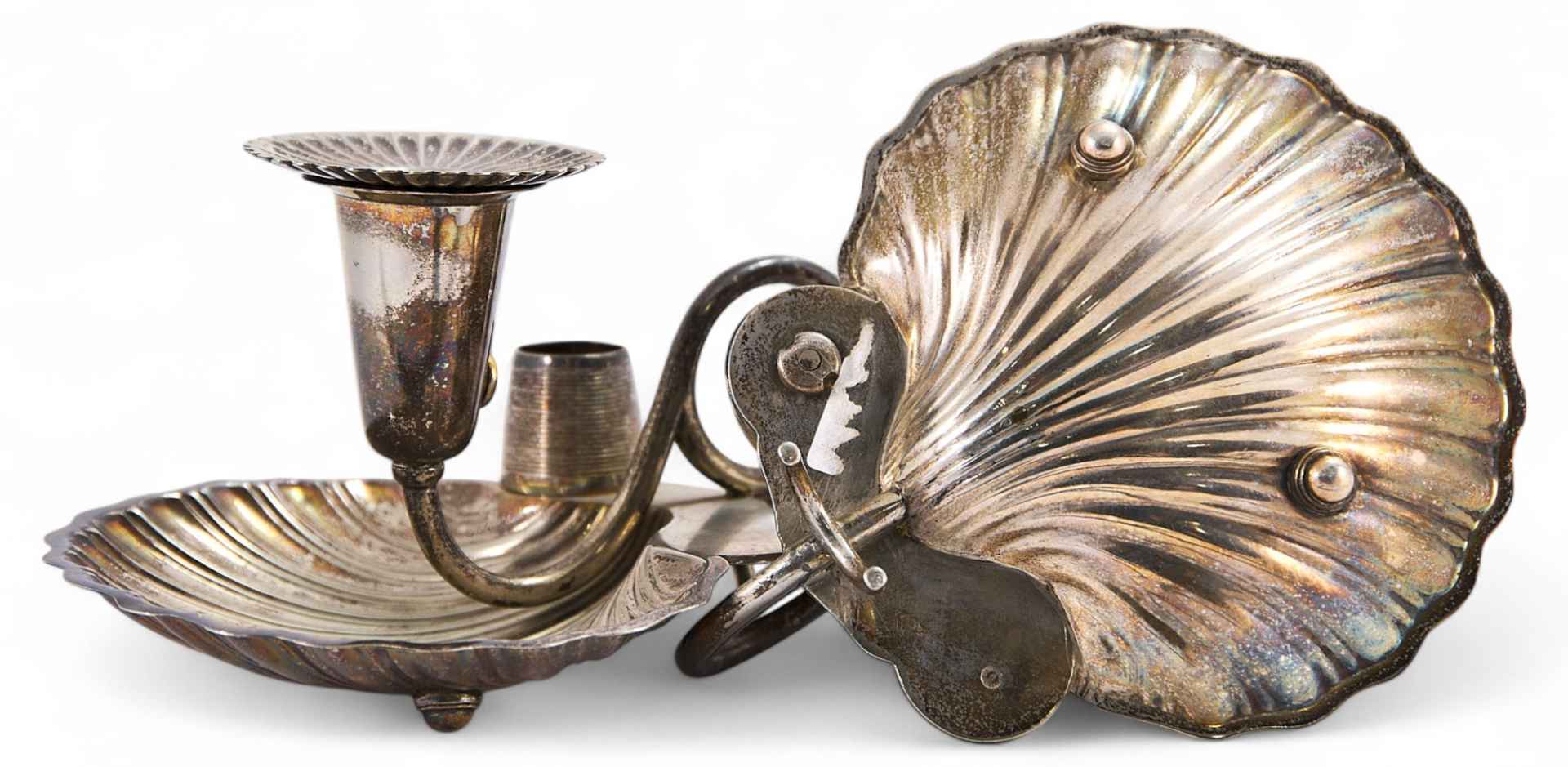 Парные настольные подсвечники на широкой плоской подставке в виде морской раковины. Изящные стеблевидные ножки, завершающиеся чашечкой для свечи, выполненной в форме цветочного бутона. Рядом укреплены рифленые снаружи емкости для хранения спичек. На основании подсвечников клеймо Берндорфской фабрики металлических изделий, ставившееся в 1910-1920-е гг. — в круглом шильдике изображение стоящего на задних лапах медведя, обращенного влево; сверху сокращенно: «Art. Krupp» - (Artur Krupp); «Berndorf».