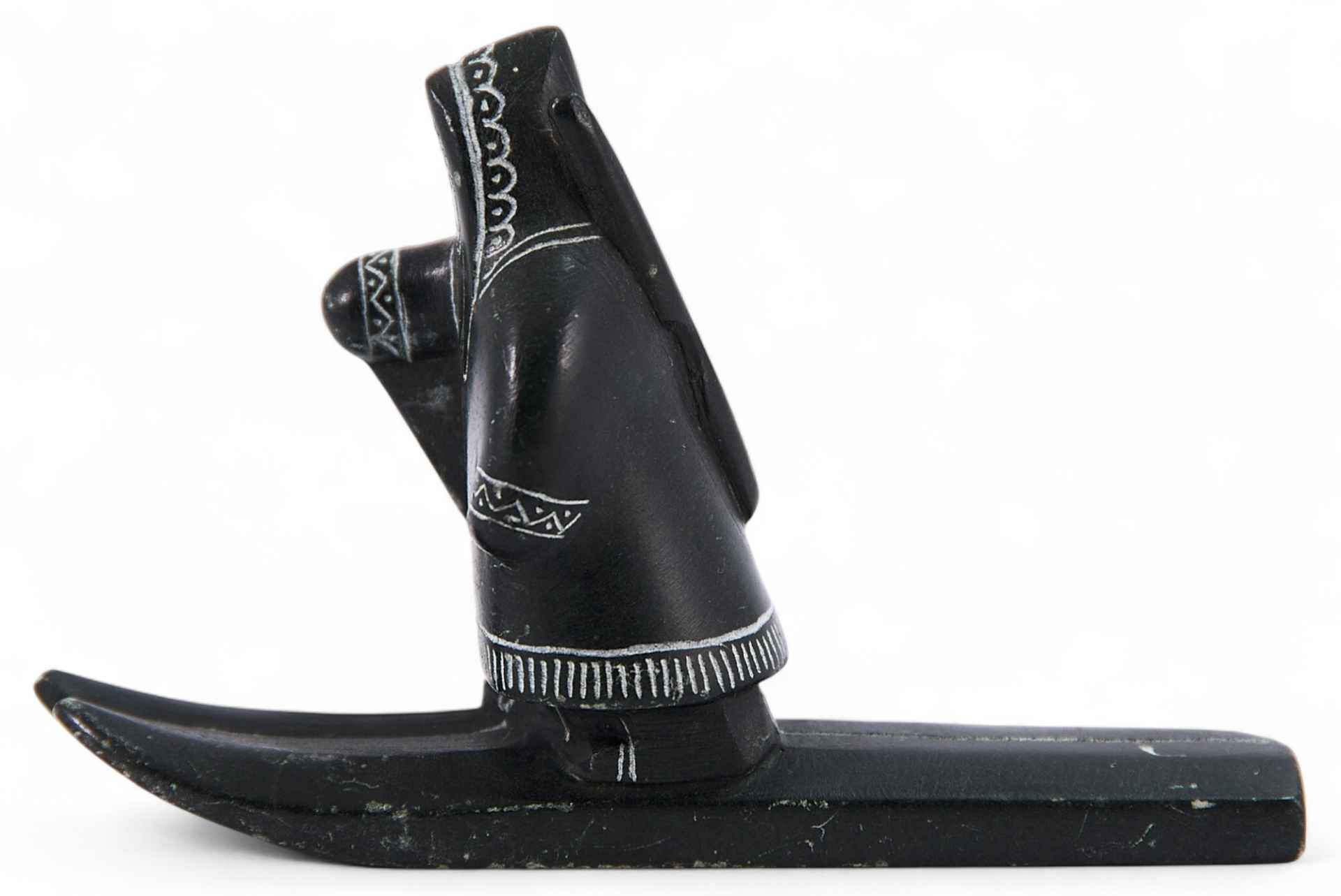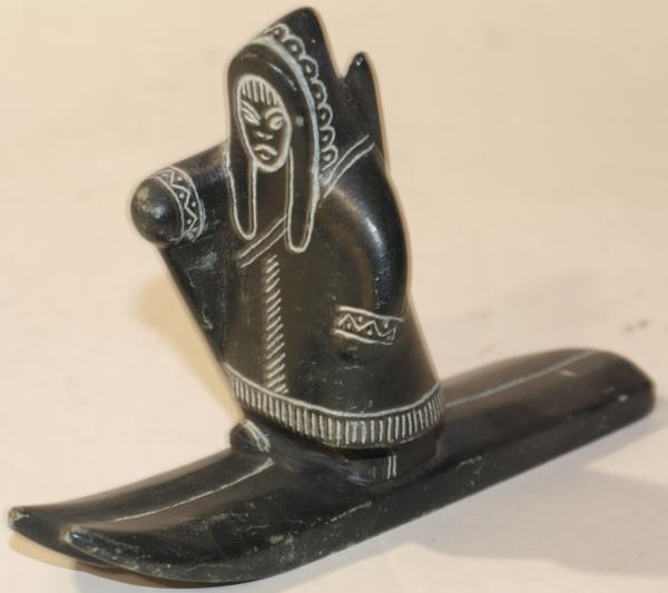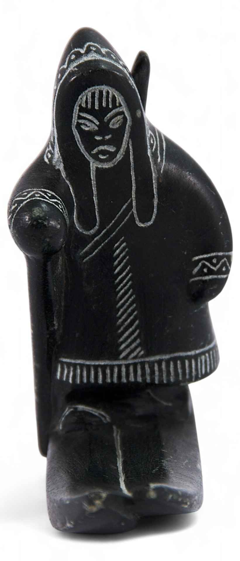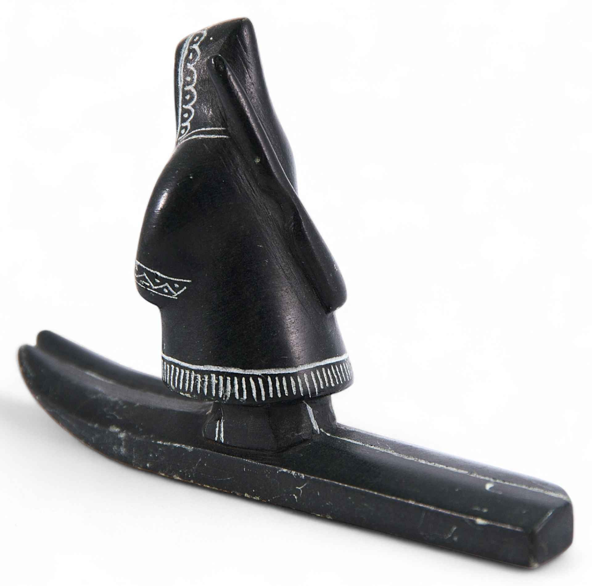 Скульптура изображает представителя народов севера в национальной одежде, на лыках. за спиной которого, как можно предположить, какое-либо оружие. Скульптура является авторским произведением, сделанным из природного камня и обработанным вручную. Стилизация образа, исполненная в плавных лаконичных формах выражающих общее движение заданного образа, передает характерные черты имитирующие произведения изобразительного искусства народов