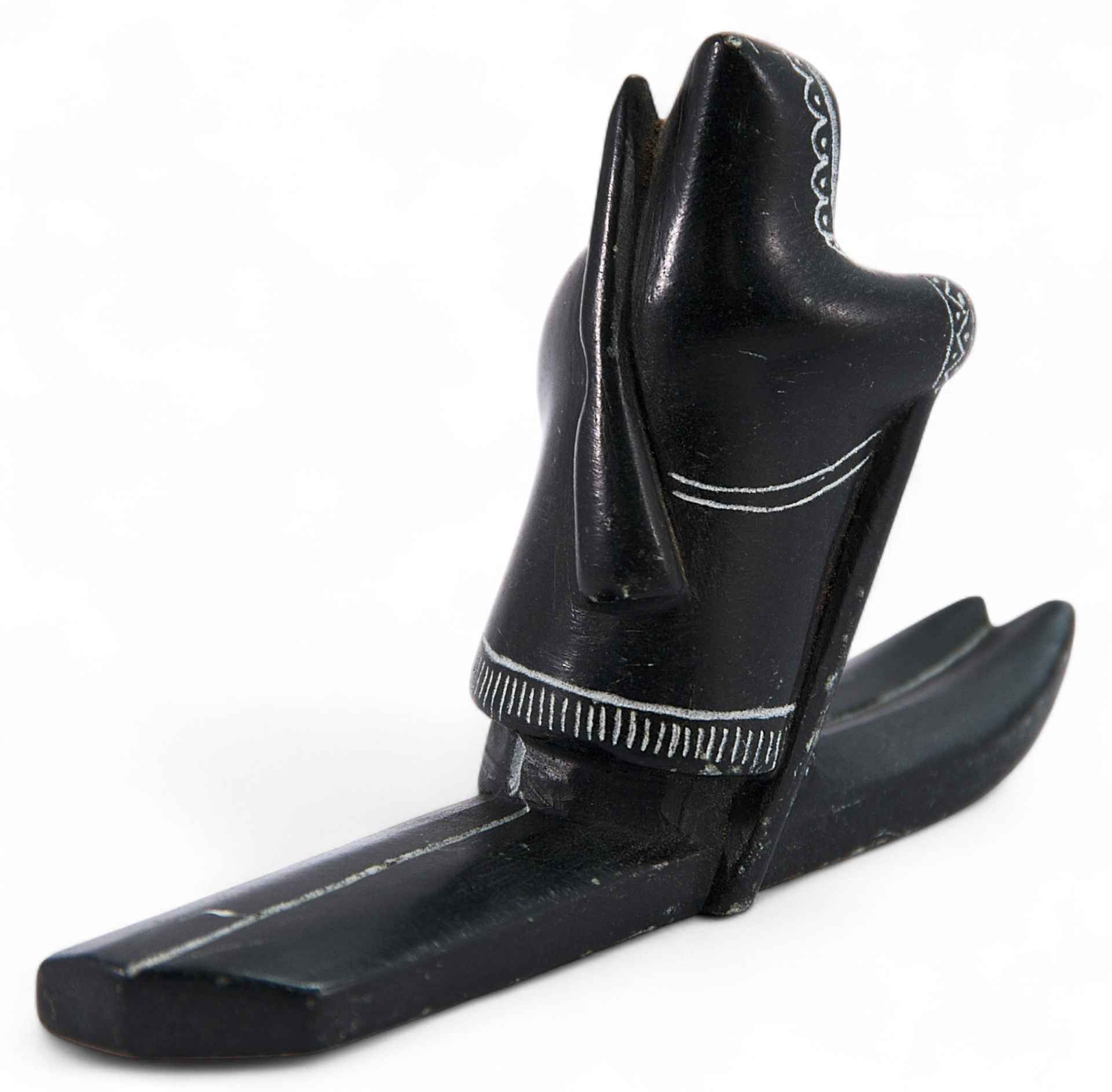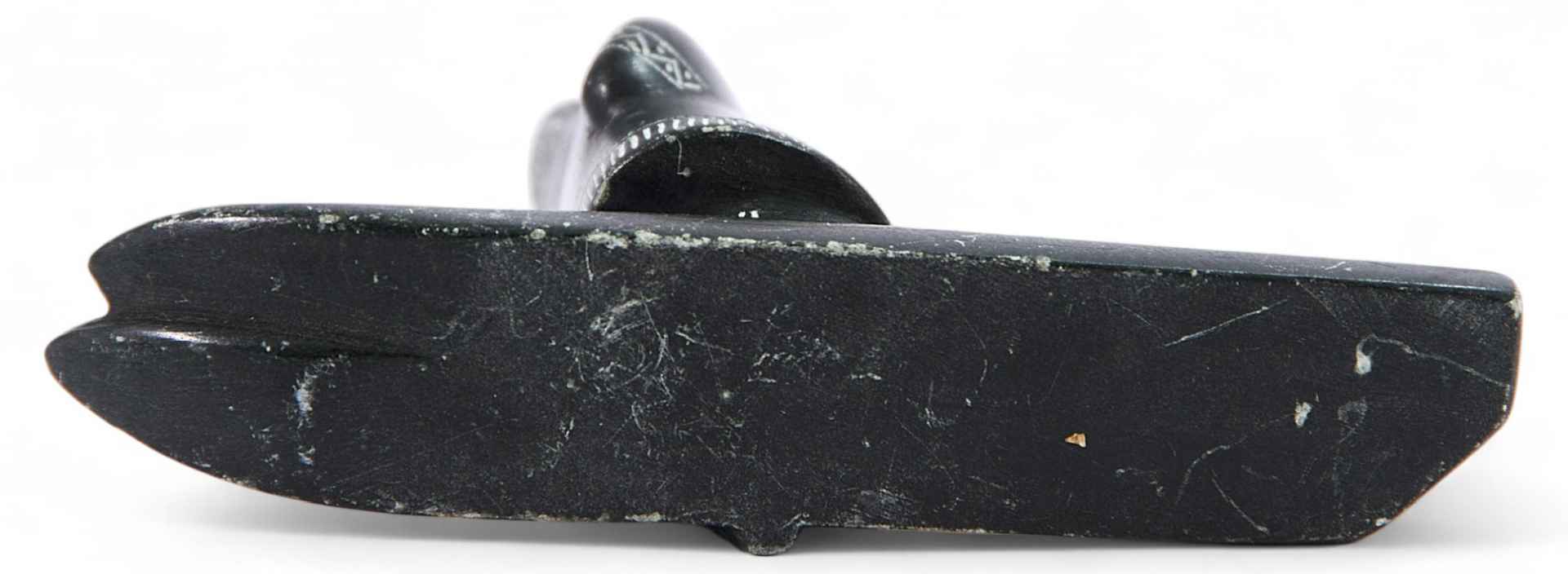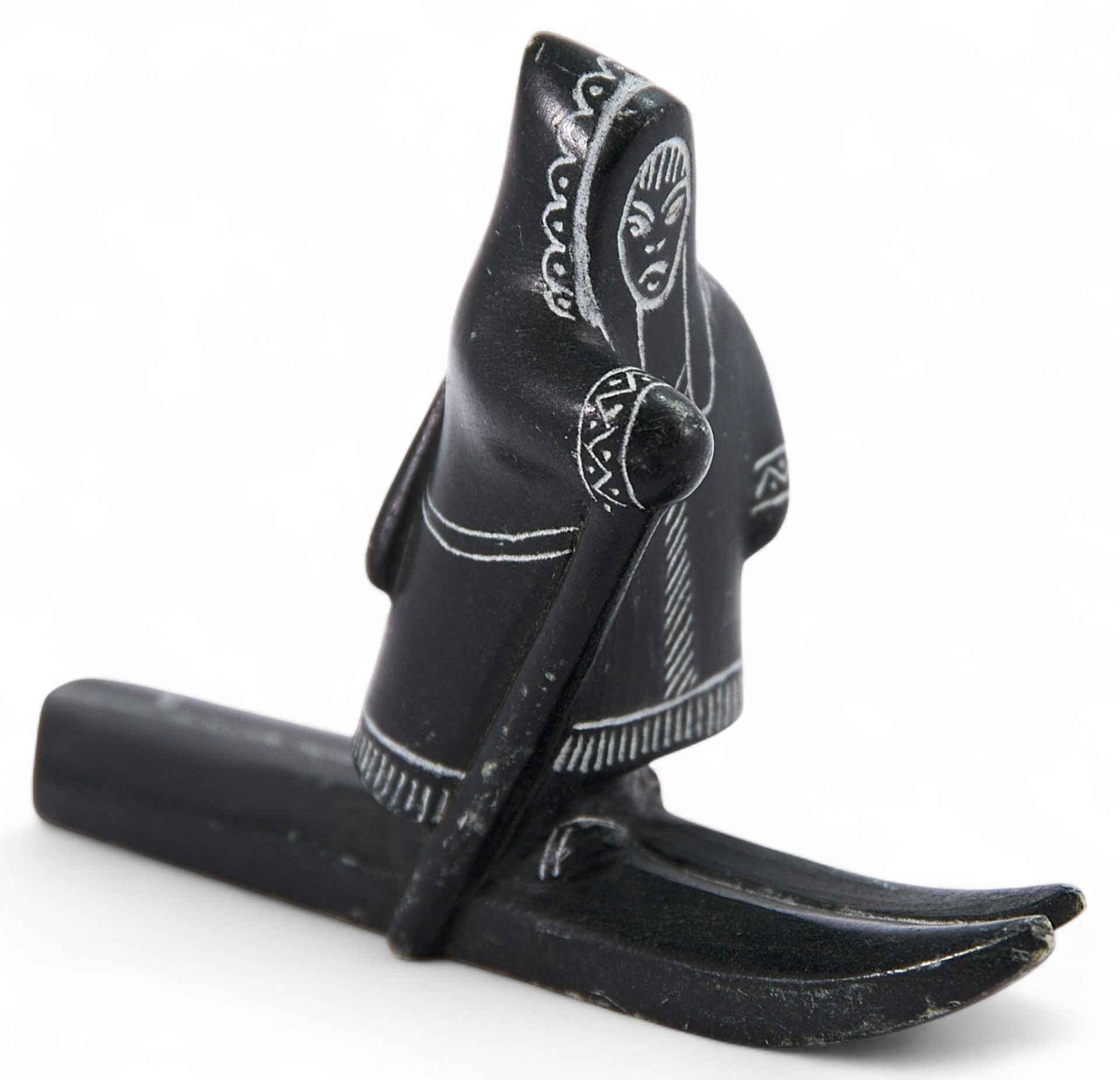 Скульптура изображает представителя народов севера в национальной одежде, на лыках. за спиной которого, как можно предположить, какое-либо оружие. Скульптура является авторским произведением, сделанным из природного камня и обработанным вручную. Стилизация образа, исполненная в плавных лаконичных формах выражающих общее движение заданного образа, передает характерные черты имитирующие произведения изобразительного искусства народов