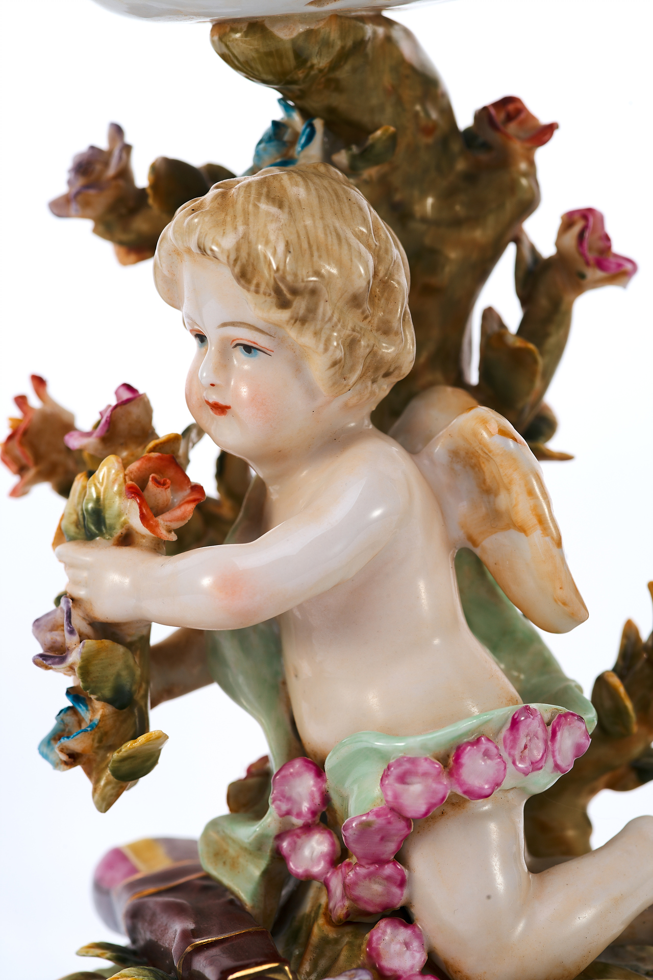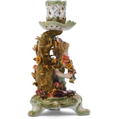 дерева.Скульптура являет собой один из типичных образцов прикладного искусства имитирующей художественную продукцию эпохи конца XIX начала ХХвв. Судя по клейму предмет можно отнести к имитации изделий фабрики «Фридрих Кристиан Грайнер и сыновья» периода 1860-1900 гг, которая располагалась в Рауэнштайне. Рауэнштайн,Тюрингия (Германия) В 1783 году владелец стекольного производства ИоганнГеорг Грайнер, вместе с сыном Кристианом Даниелем Зигмундом и двоюродным братом Иоганном Фридрихом, получил привилегию на производство фарфора в Рауэнштайне. Выпускались кофейные и чайные сервизы, отдельные чашки, изделия повседневного пользования, курительные трубки. В период 1860-1900 гг. фирма называлась «Фридрих Кристиан Грайнер и сыновья».В ассортимент в это время добавились скульптуры и куклы. Роспись имела преимущественно цветочный характер, часто использовался мейсенский«сухоцвет».Фабрика закрылась в 1936 году.