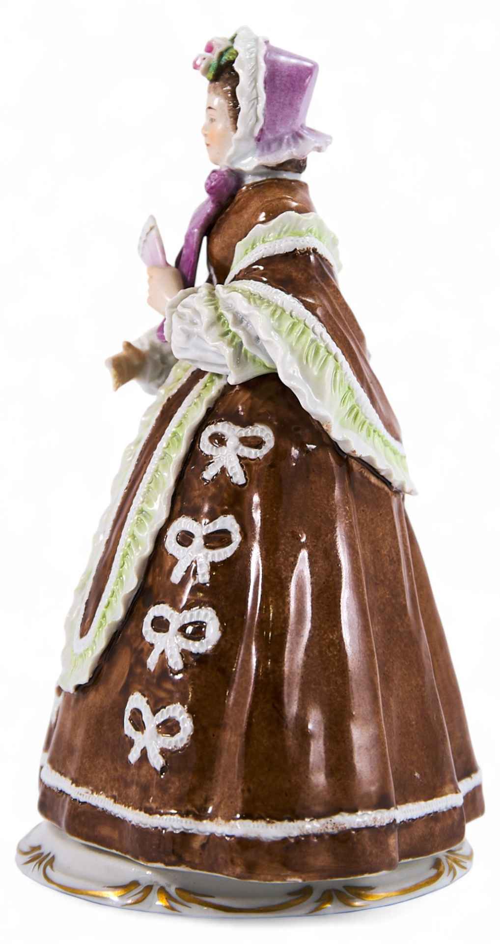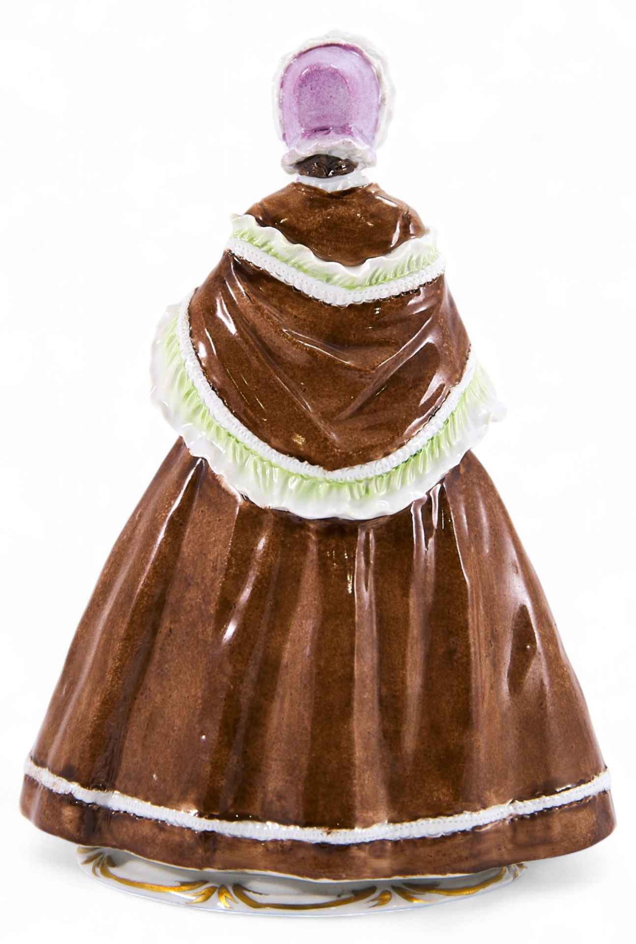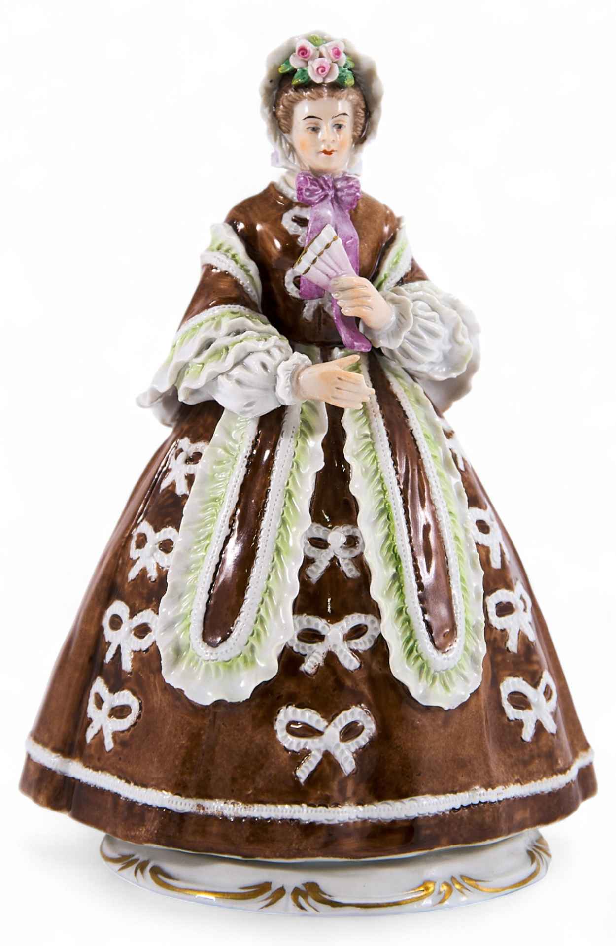 Скульптура женщины в платье. Эта фигура относится к серии аналогичных скульптур изображающих образцы модных платьев скульптура женщины в платье. публикуемых журнале Godey 's Magazine. На основании скульптуры синее клеймо фарфорового завода Шайбе-Альсбах, ставившееся с 1925 по 1972 гг. Godey 's Magazine and Lady 's Book — журнал