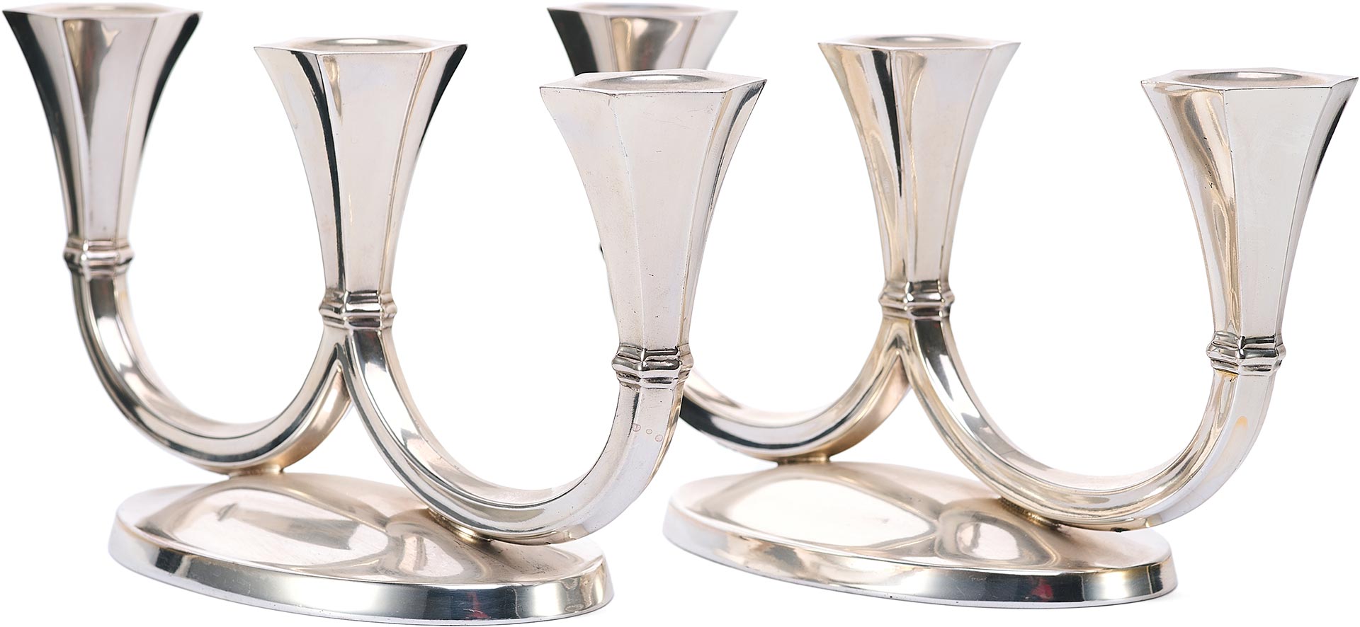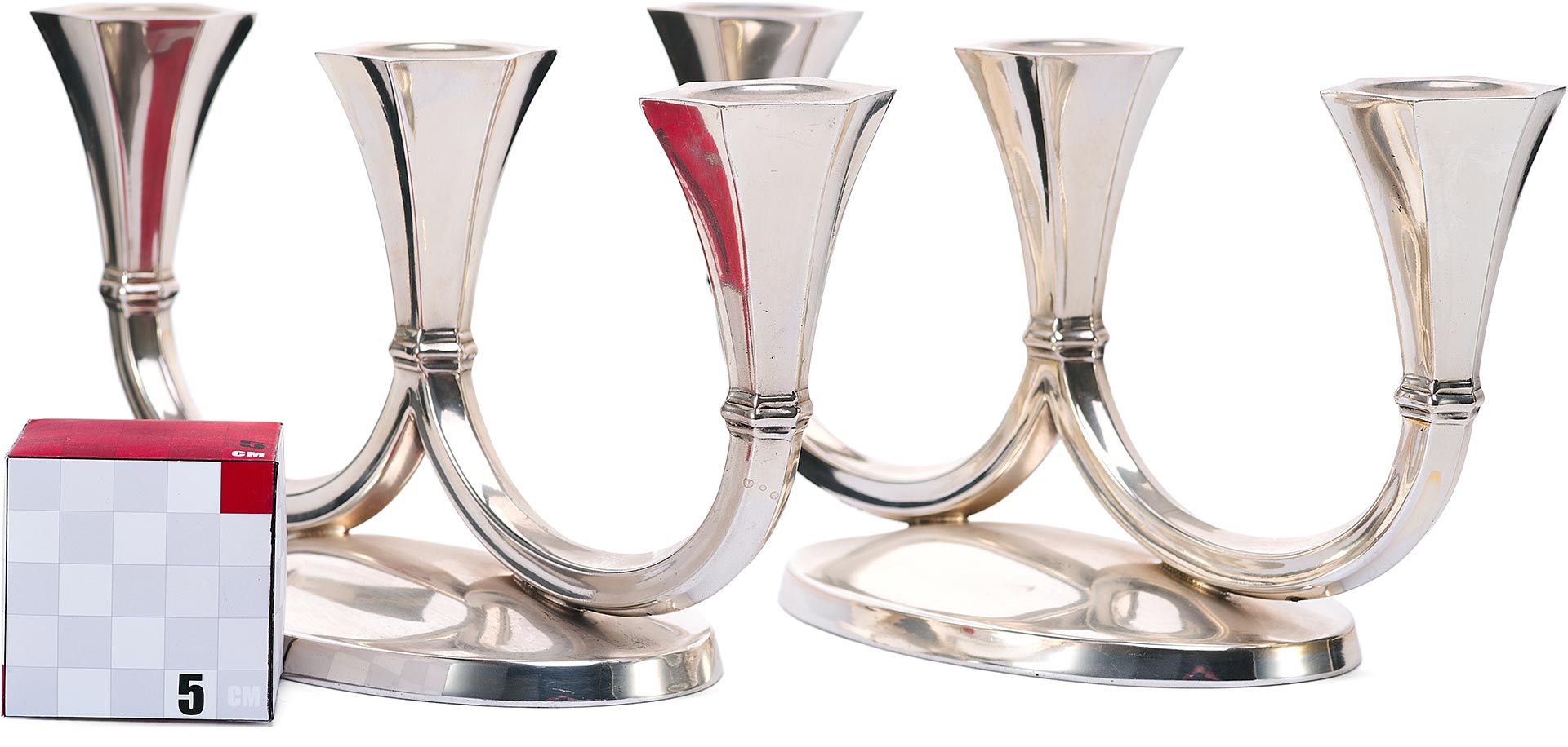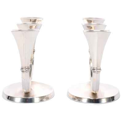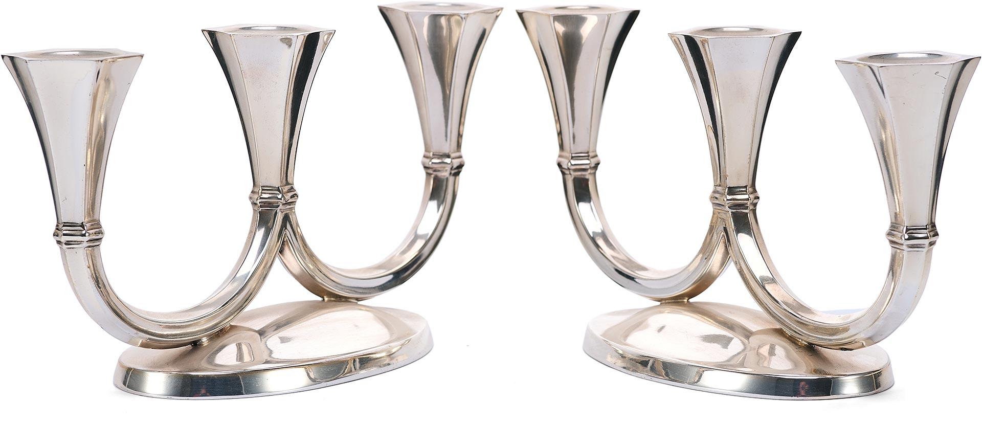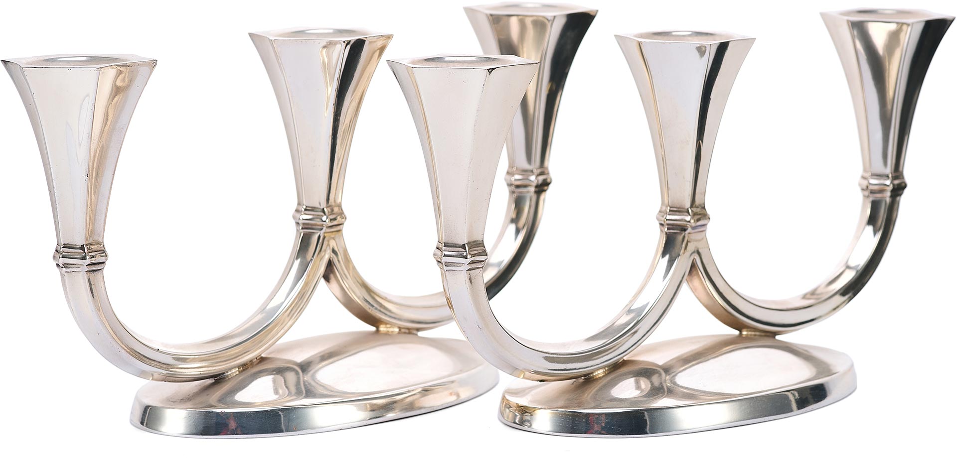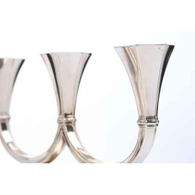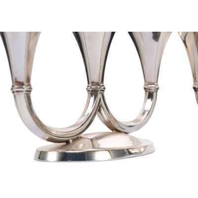 Канделябры отражают влияние ар-деко, с его тягой к геометризации форм, утончённой строгости и высокому качеству исполнения. Слегка скошенные грани гнёзд для свечей, сдержанная декоративность и обтекаемость форм придают этим предметам особое изящество, делая их как функциональными, так и эстетически ценными.