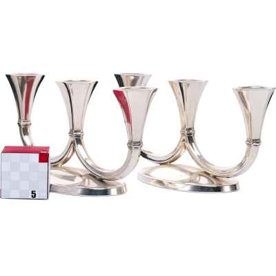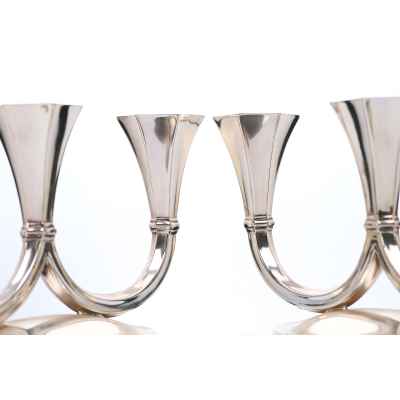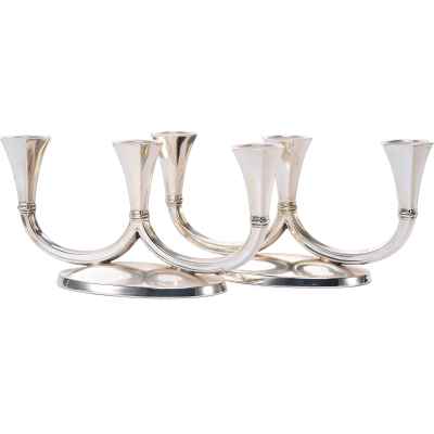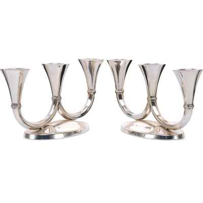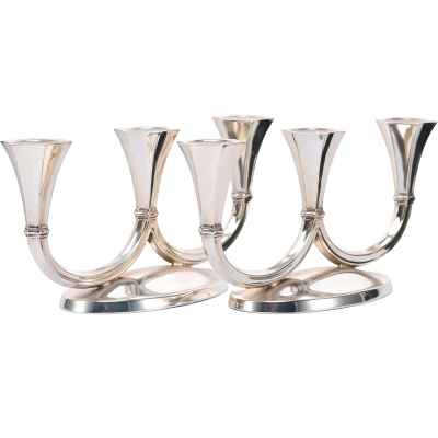 Представленные предметы — парные канделябры, отличающиеся лаконичным, но выразительным силуэтом, характерным для декоративно-прикладного искусства начала XX века. Двойные рожки каждого из канделябров элегантно изгибаются вверх в виде симметричных U-образных дуг, завершаясь четырёхгранными гнёздами для свечей. Такие изделия предназначались для освещения интерьеров — они служили как источниками света, так и декоративными акцентами в парадных залах, гостиных или столовых. Их парность подчёркивает симметрию и гармонию пространства, в котором они использовались.